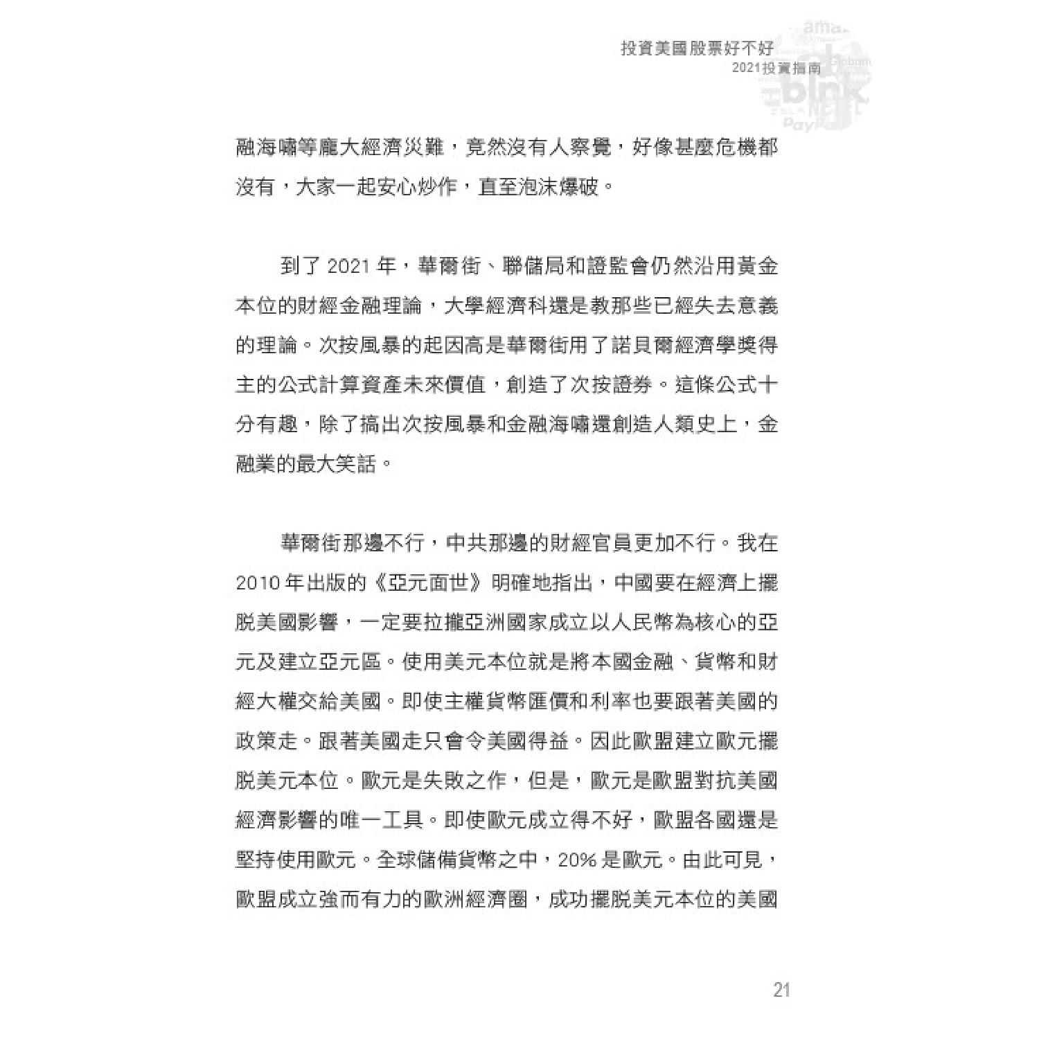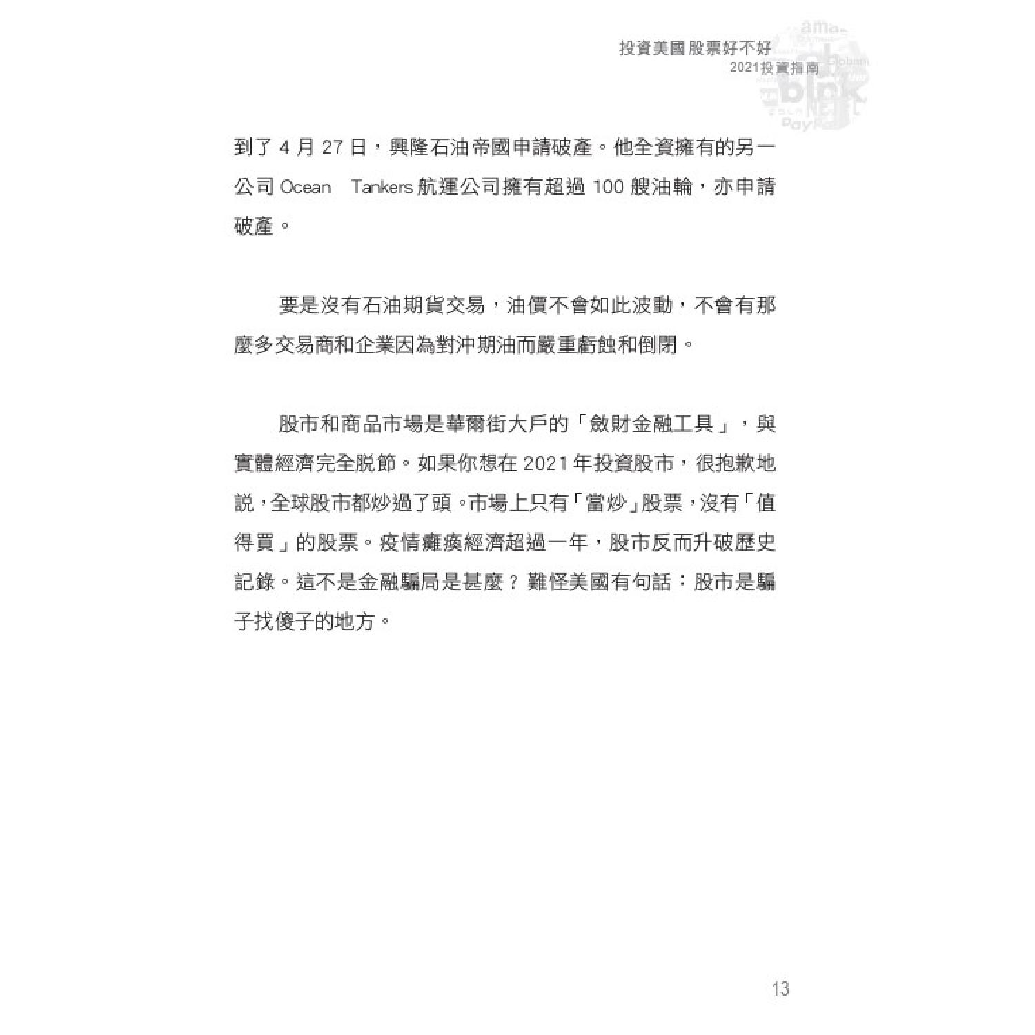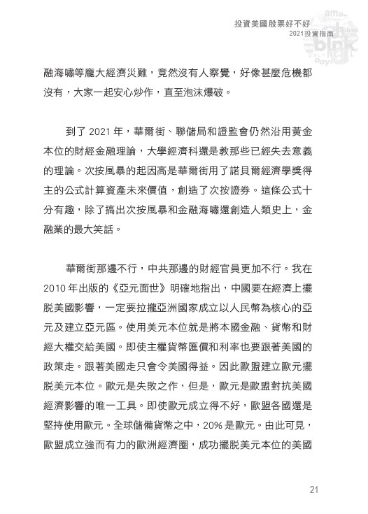 2021 年的投資策略應該在投資組合方面,維持實質比例的現金和真金白銀,要承擔樓按貸款的地產投資可免則免。減債和重視資產流通性,是應付黑天鵝突變的最佳策略。進取一點的話,石油和航運以外的民生必需品和工業相關股份,例如農業漁業……。