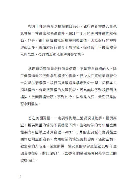 想在美國買樓,一定要等到銀主盤湧現才動手。樓價高企,斷供嚴重的情況下買樓是下策。住宅物業的每年租金回報要有6厘以上才算合理,2021年3月的主要城市實質租金回報連兩厘都沒有。商用物業的情況更加惡劣,滿街空舖,做生意的人破產,業主斷供,情況真的惡劣至超越2009年金融海嘯很多。對比2021年,2009年的金融海嘯只是水面上的波紋而已。