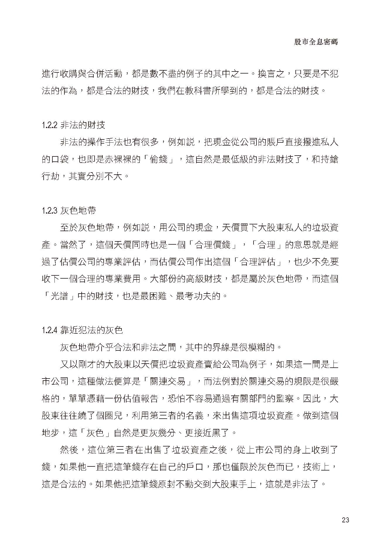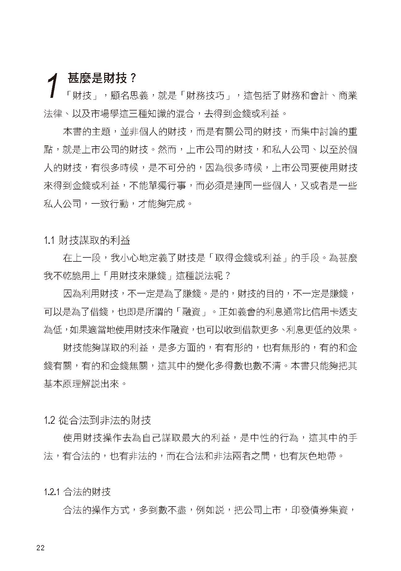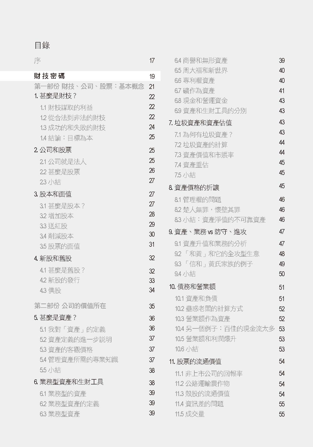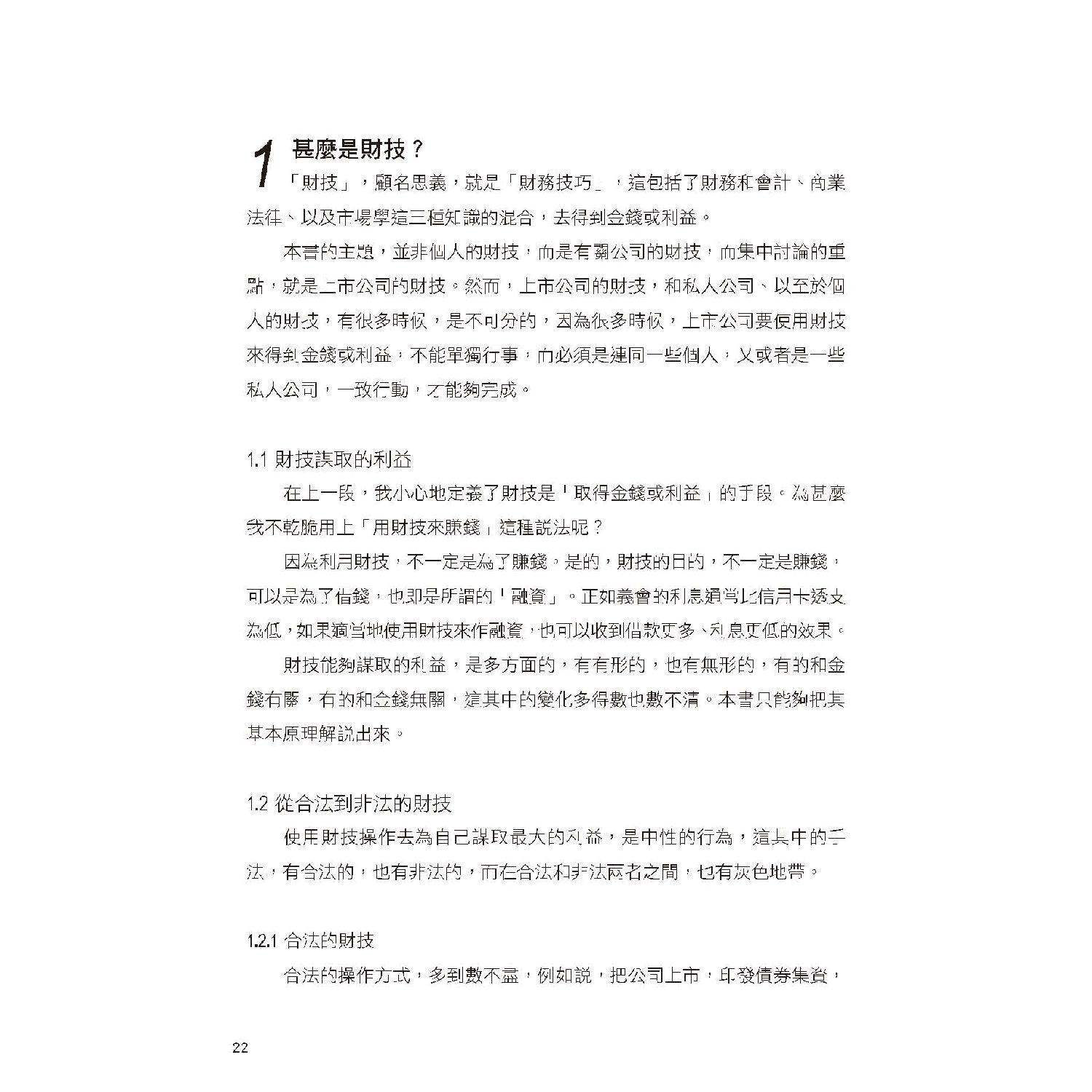 第一個部份是財技密碼,內容是有關公司財技的基本知識,以及操作的過程;前者的內容,其實首尾呼應,必須通曉了下篇某部份,才能夠貫徹理解,因此,建議初學讀者須得把本部份通讀兩遍,才可融會貫通,更好地理解整套財技的概念。