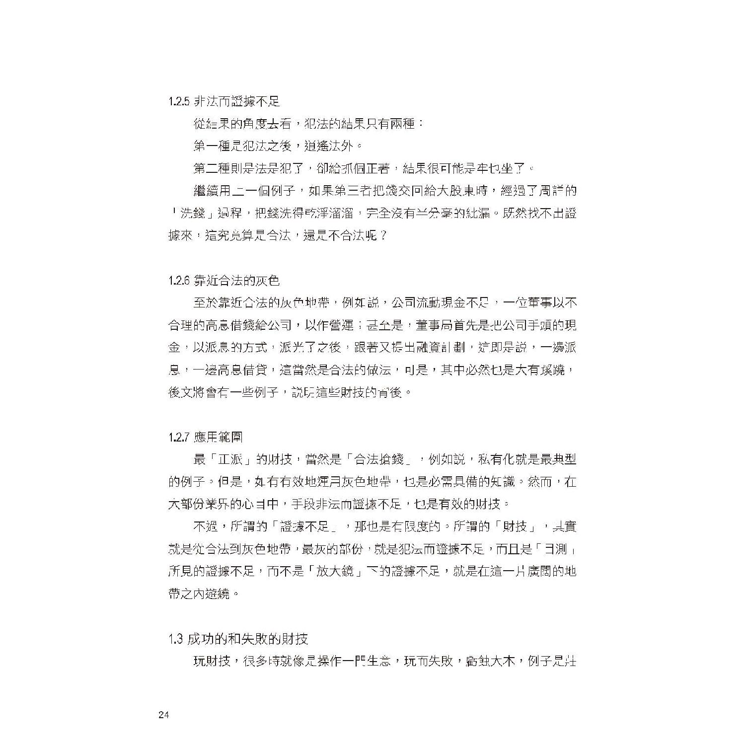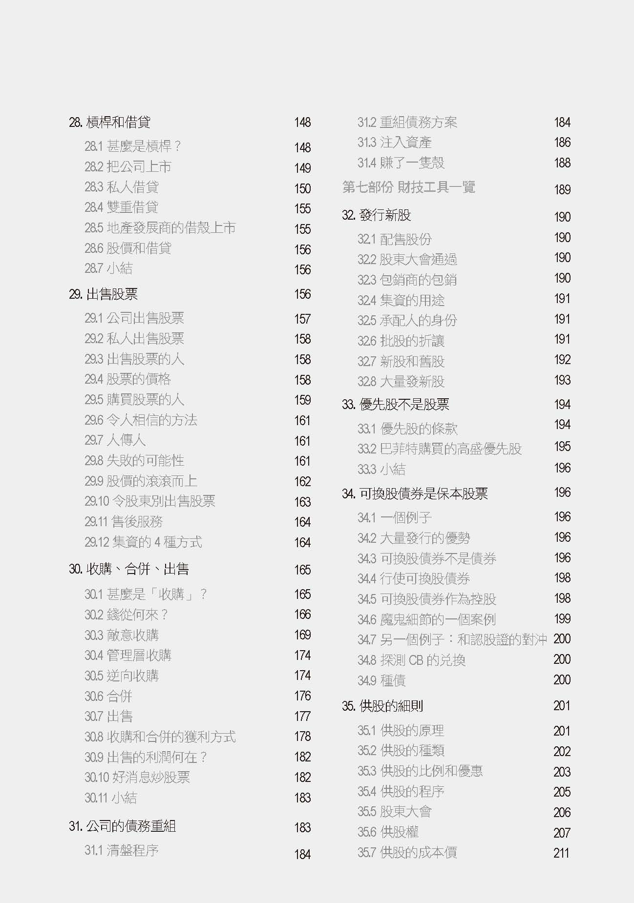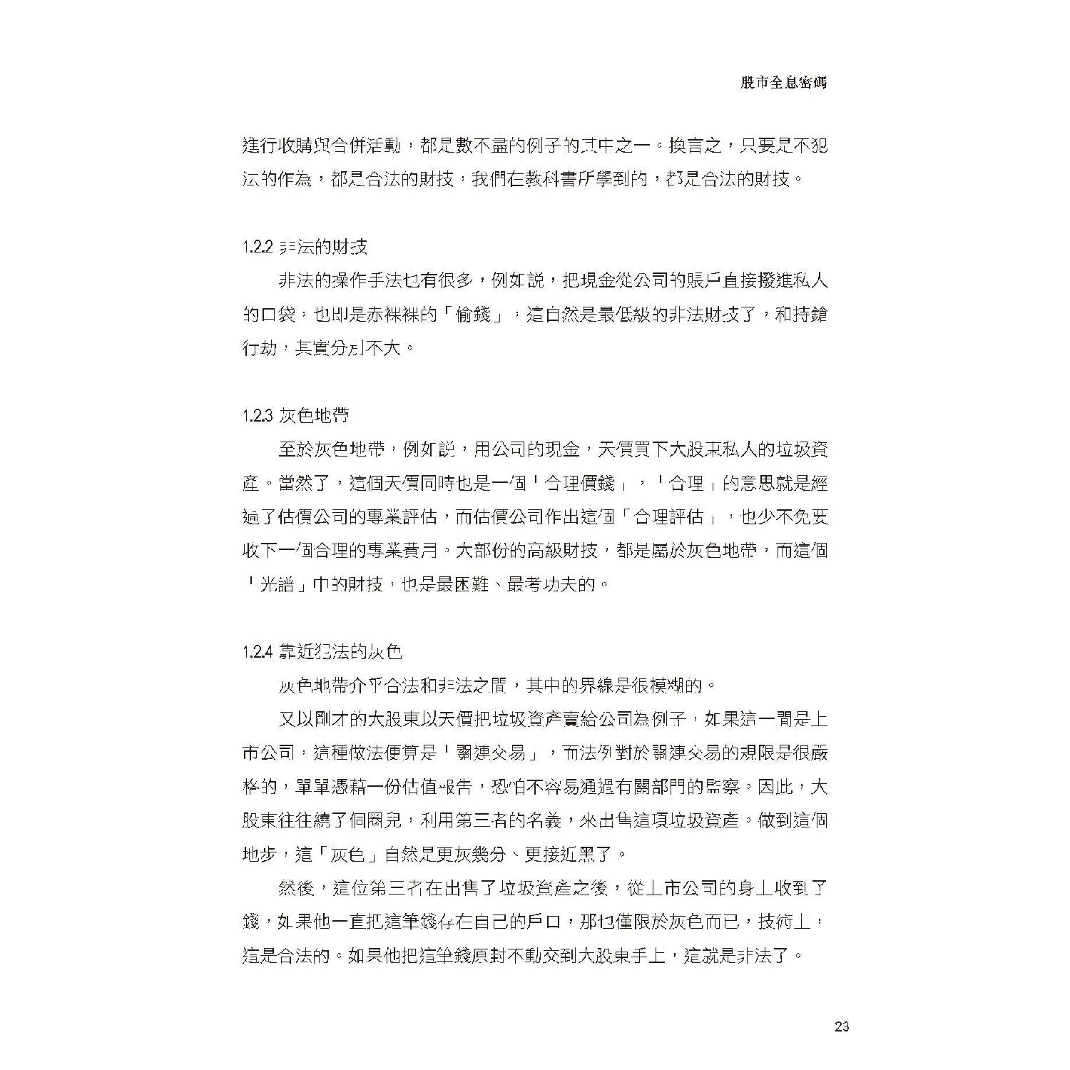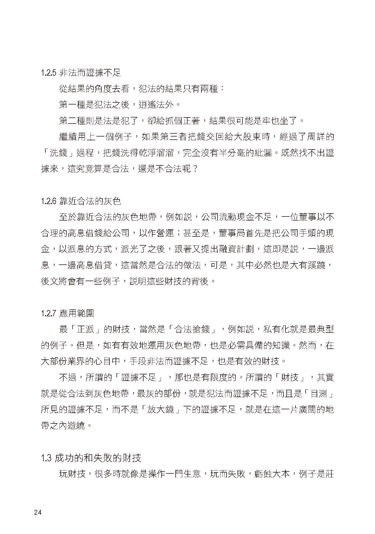 第一個部份是財技密碼,內容是有關公司財技的基本知識,以及操作的過程;前者的內容,其實首尾呼應,必須通曉了下篇某部份,才能夠貫徹理解,因此,建議初學讀者須得把本部份通讀兩遍,才可融會貫通,更好地理解整套財技的概念。