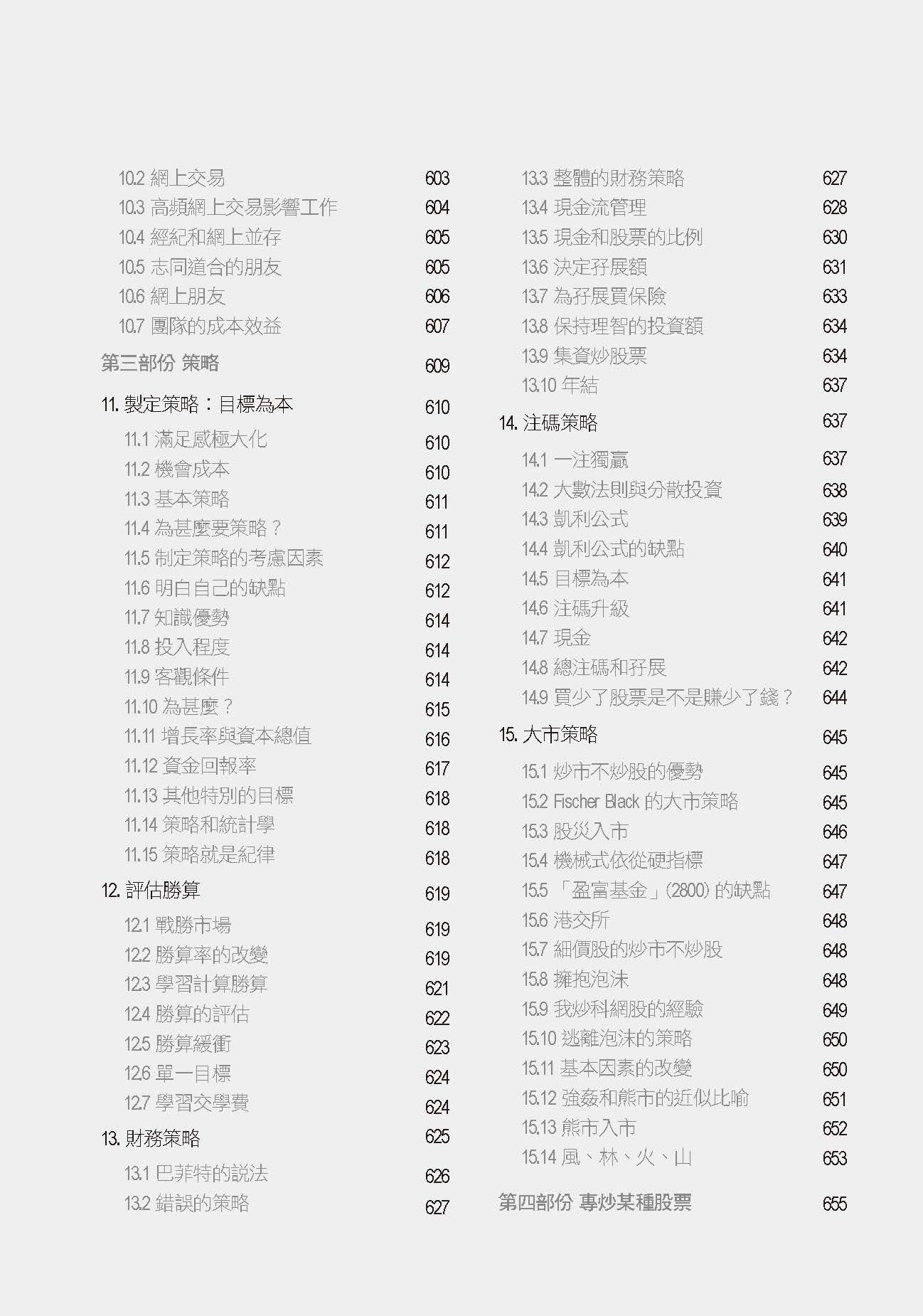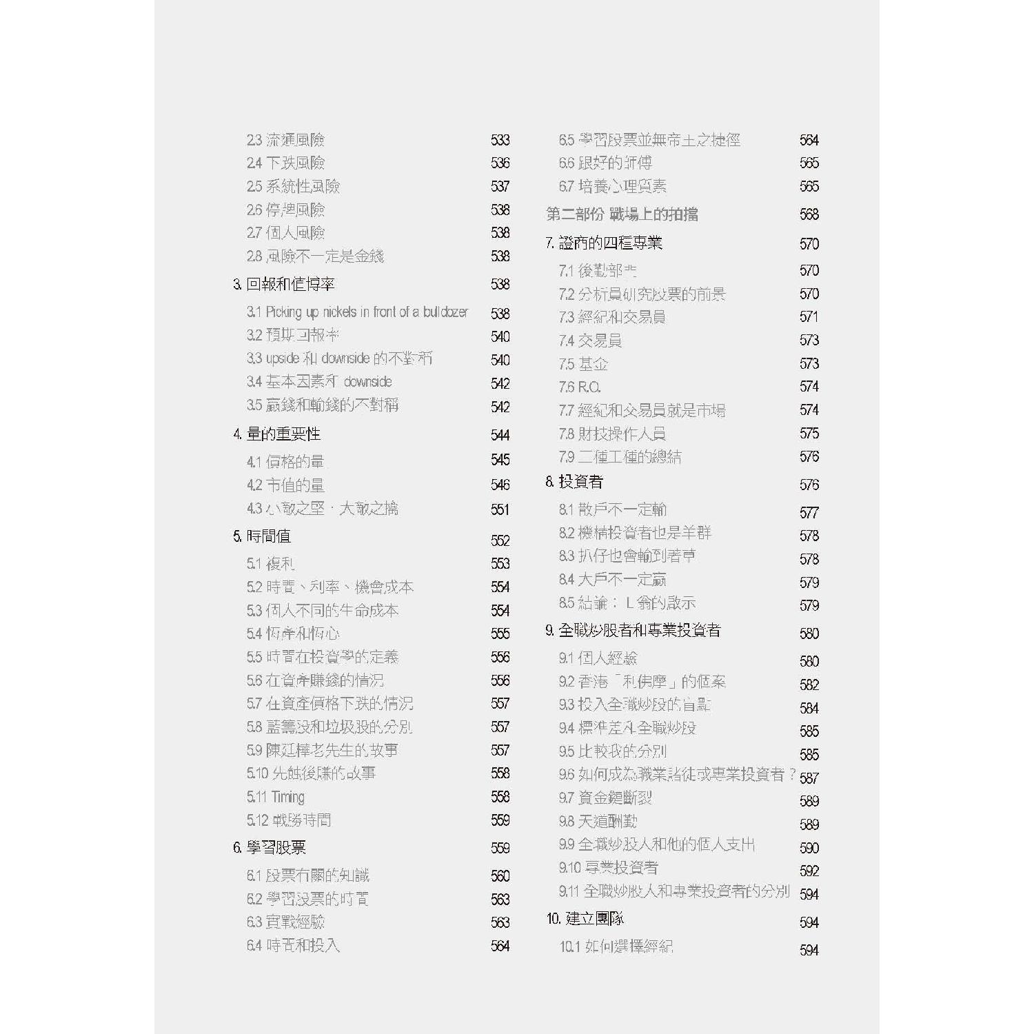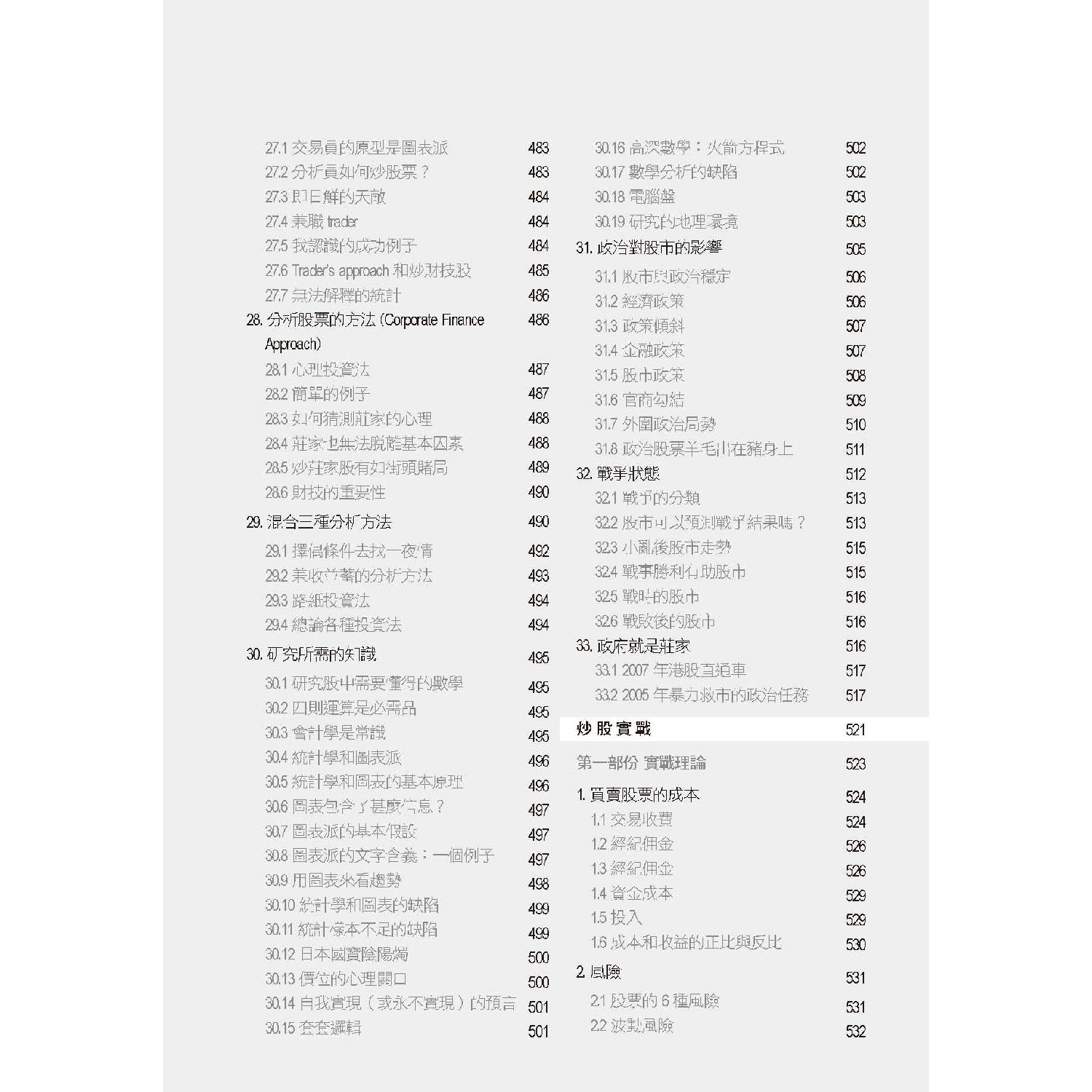第三個部份為炒股實戰,講的是投資股市的實務,與第二部份的理論相輔相成,密不可分。本部分融合更多更新的炒股知識,尤其關於買賣股票的成本、風險、回報和值博率、時間值、證券商的專業、投資者分類、策略制定、勝算評估、財務/注碼 / 大市策略、長揸短炒分析等等方面,可謂鉅細無遺,推陳出新。