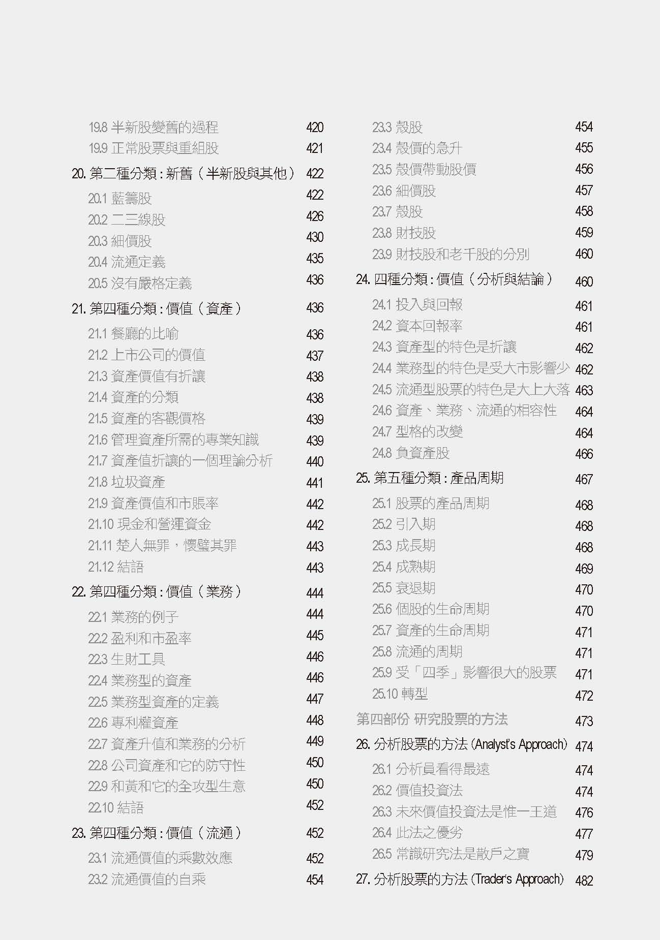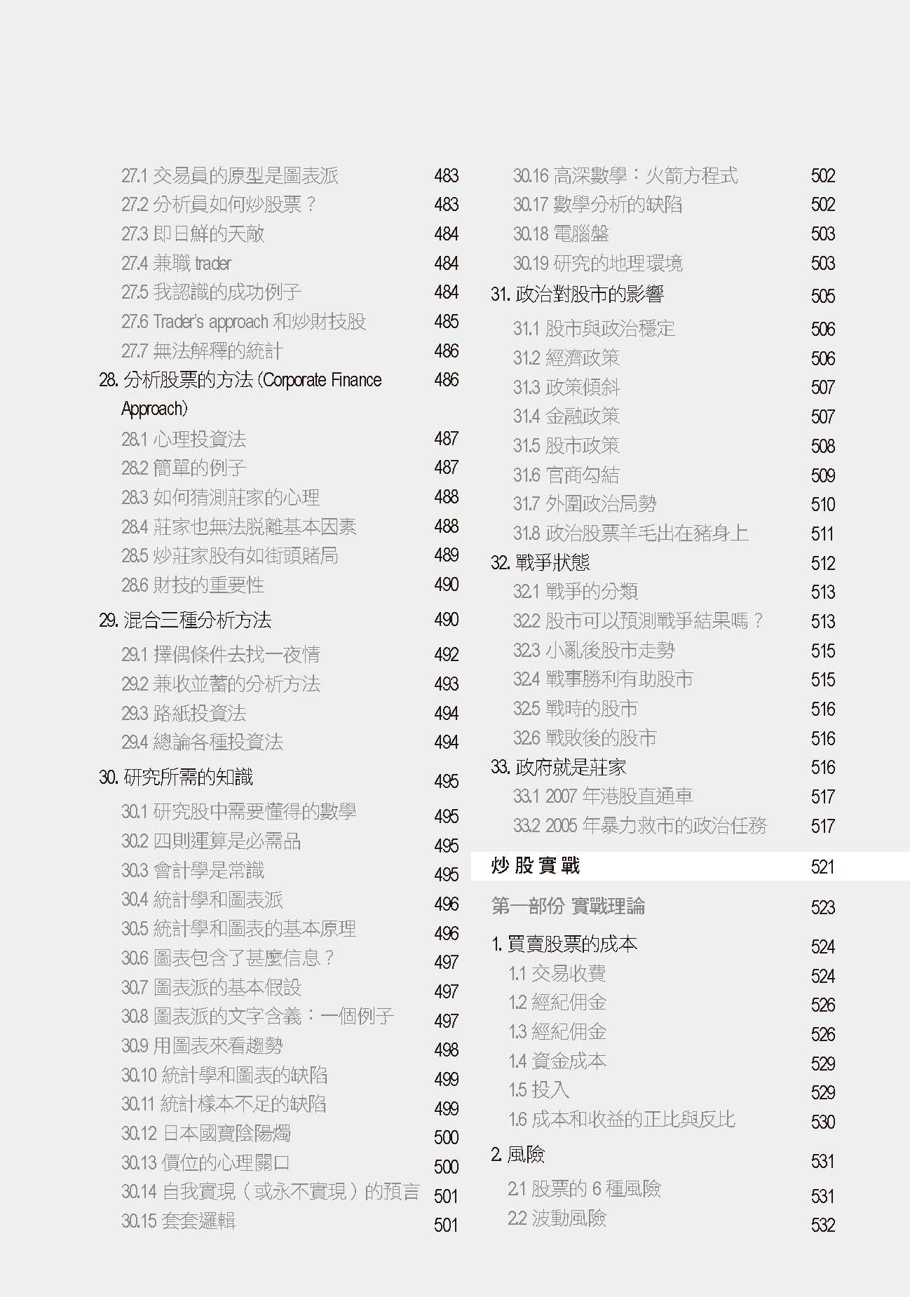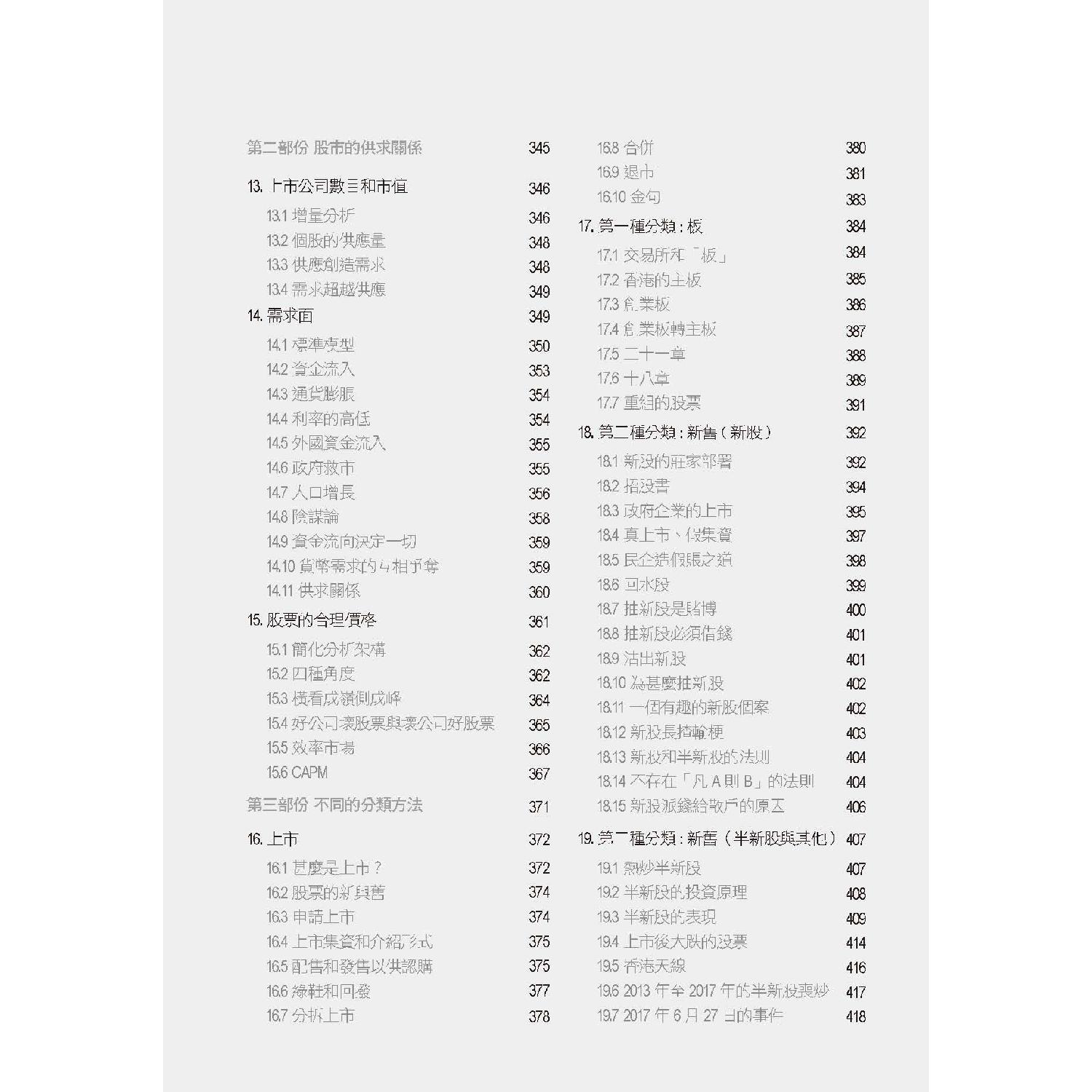 第三個部份為炒股實戰,講的是投資股市的實務,與第二部份的理論相輔相成,密不可分。本部分融合更多更新的炒股知識,尤其關於買賣股票的成本、風險、回報和值博率、時間值、證券商的專業、投資者分類、策略制定、勝算評估、財務/注碼 / 大市策略、長揸短炒分析等等方面,可謂鉅細無遺,推陳出新。
