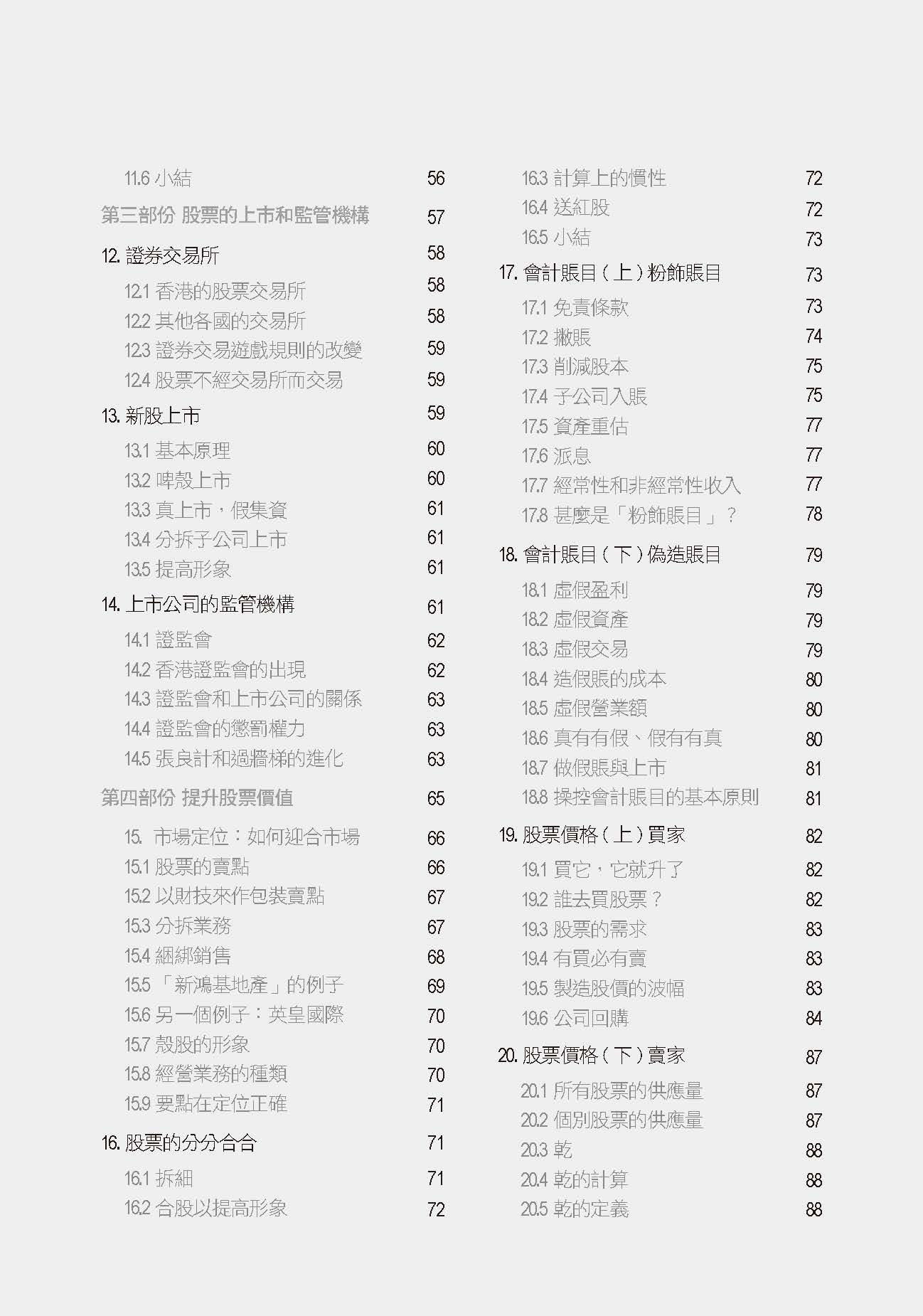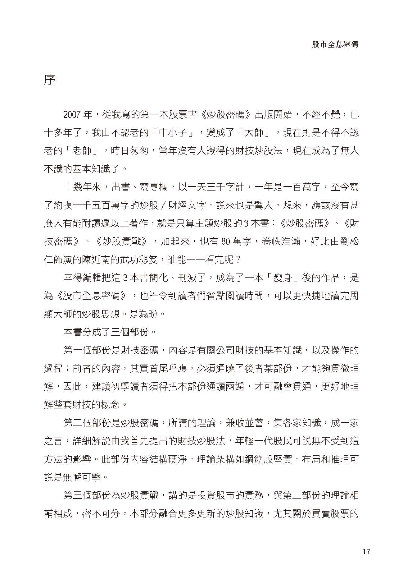 「2007年,從我寫的第一本股票書《炒股密碼》出版開始,不經不覺,已十多年了。我由不認老的「中小子」,變成了「大師」,現在則是不得不認老的「老師」,時日匆匆,當年沒有人識得的財技炒股法,現在成為了無人不識的基本知識了。