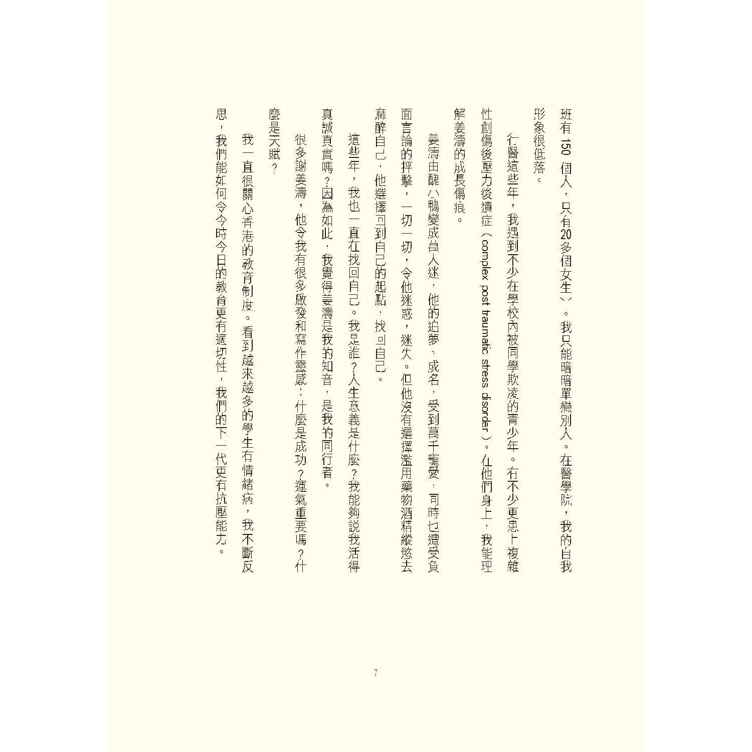 行醫這些年,我遇到不少在學校內被同學欺凌的青少年。有不少更患上複雜性創傷後壓力後遺症(complex post traumatic stress disorder)。在他們身上,我能理解姜濤的成長傷痕。姜濤由醜小鴨變成萬人迷,他的追夢、成名,受到萬千寵愛,同時也遭受負面言論的抨擊⋯⋯一切一切,令他迷惑,迷失。