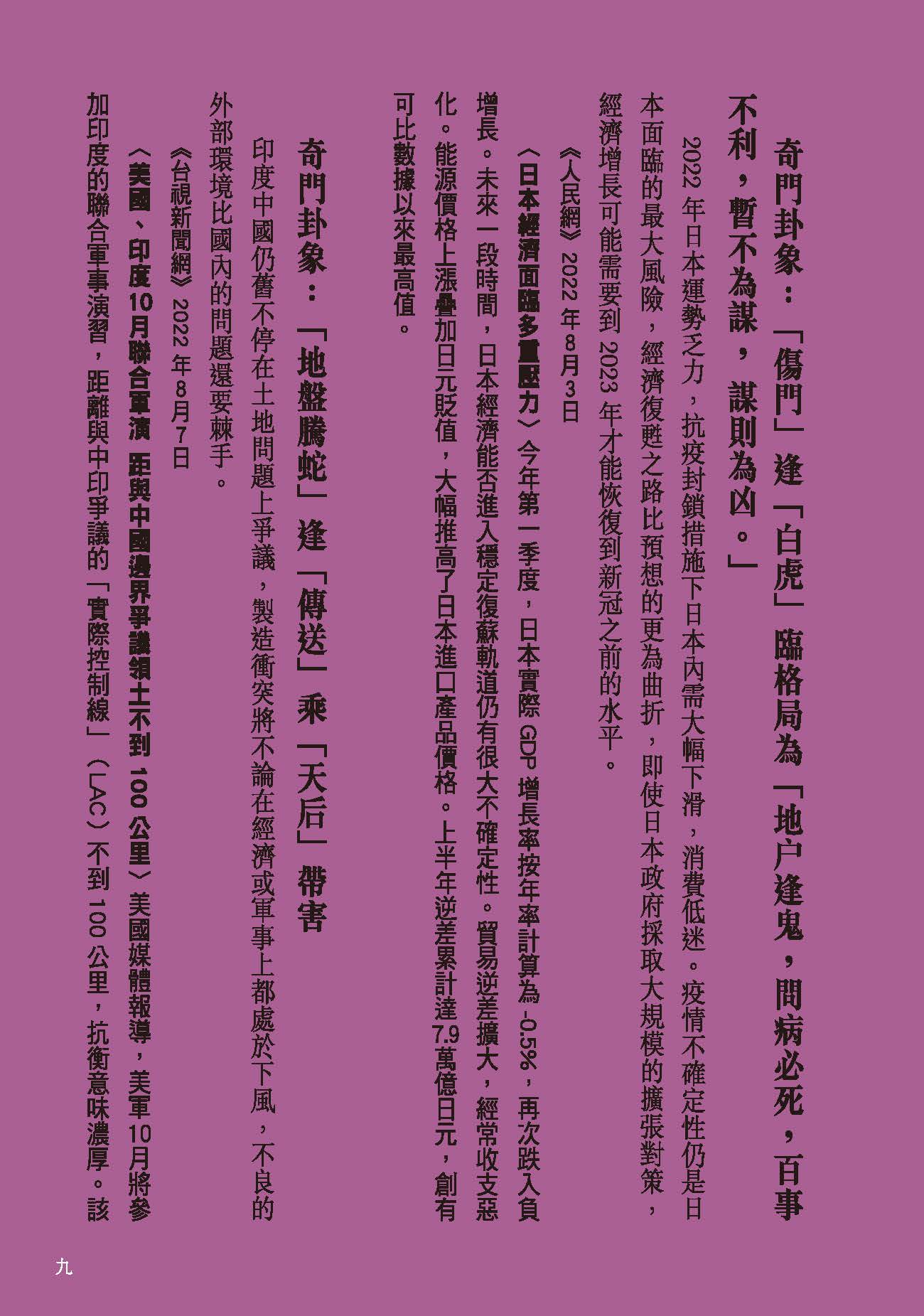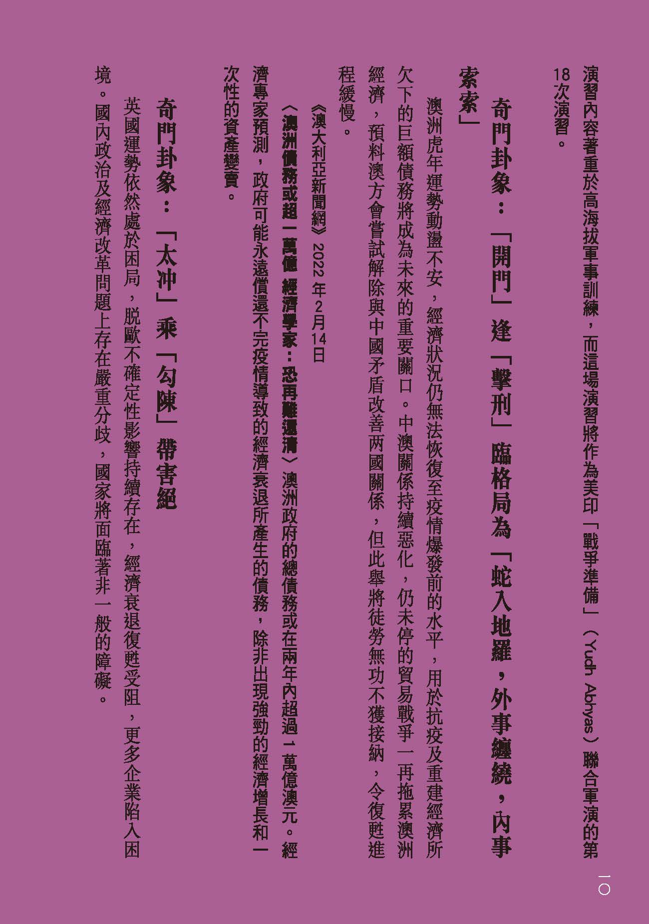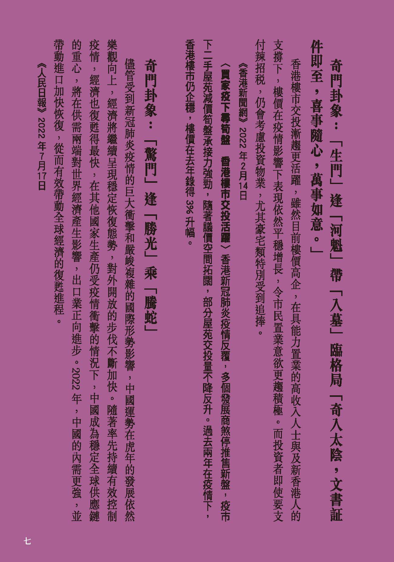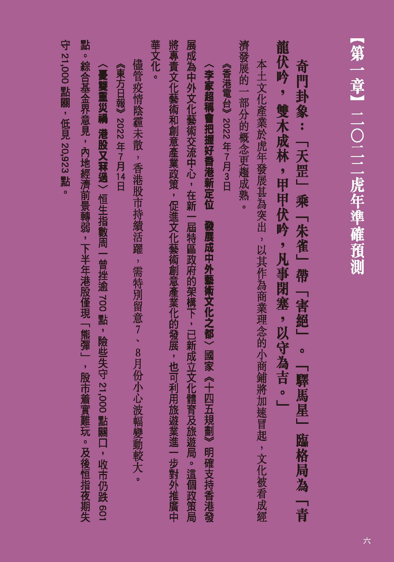 流年運程及玄學文章、訪問、視頻散見於香港多間報章雜誌包括:Cosmopolitan、Bazaar、 Elle、Jessica、Marie Claire、東方新地、東周刊、Ming’s 明周、明報、壹週plus、She.com、TVB周刊、新Monday、Fashion & Beauty、Figaro、經濟日報、東方日報、蘋果日報、星島日報、South China Morning Post、美聯社、成報、香港0、港生活1、太陽報、都市日報、晴報