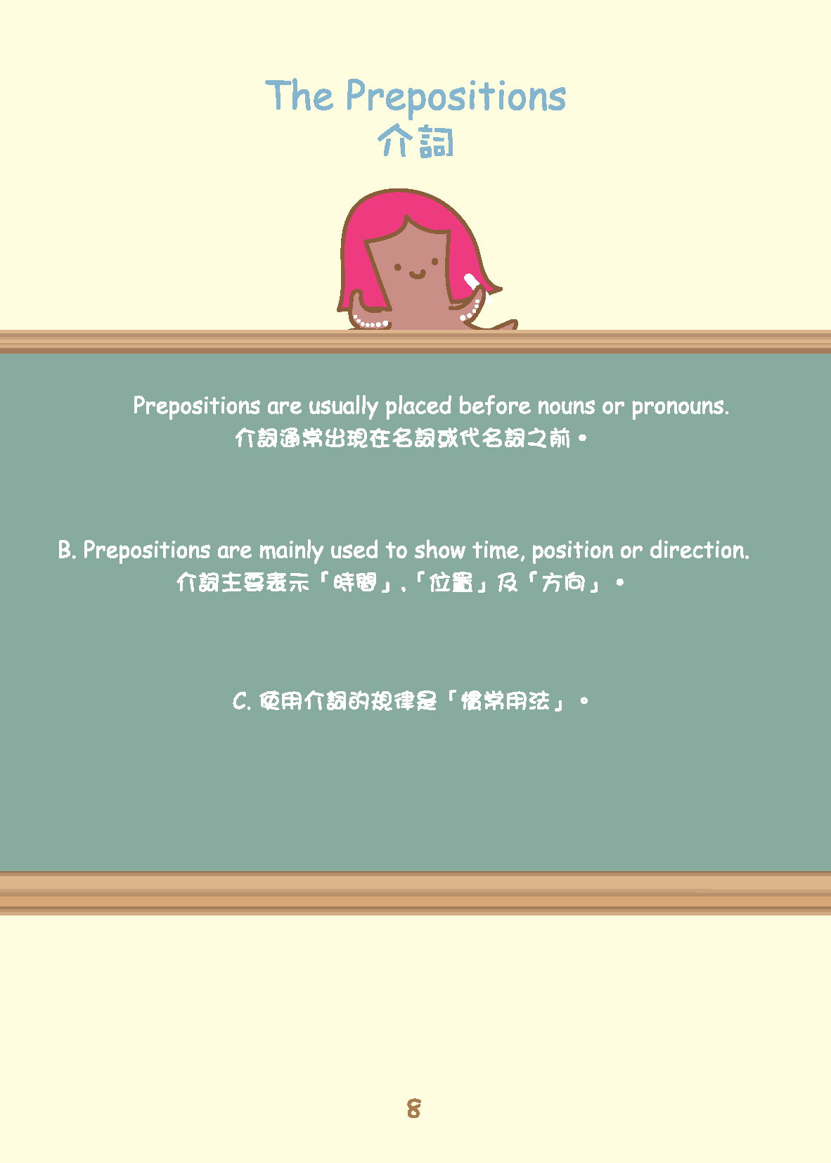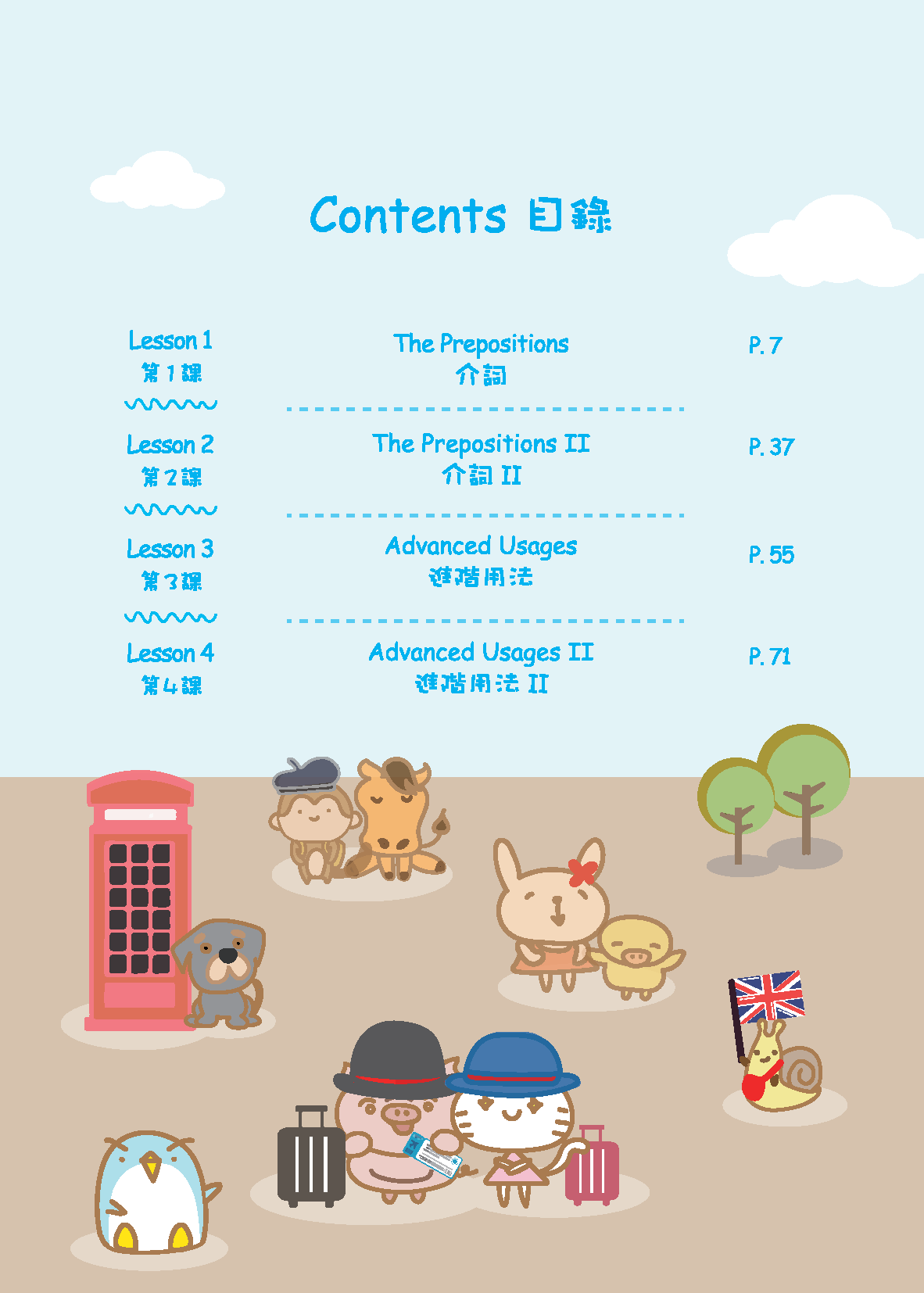 讀者在本書中可找到多個介詞示例、介詞類型。在閱讀示例時,須記住介詞通常傳達諸如比較、方向、地點、目的、資源擁有和時間等概念。