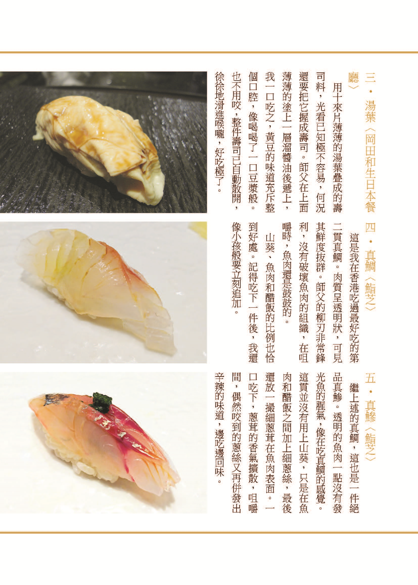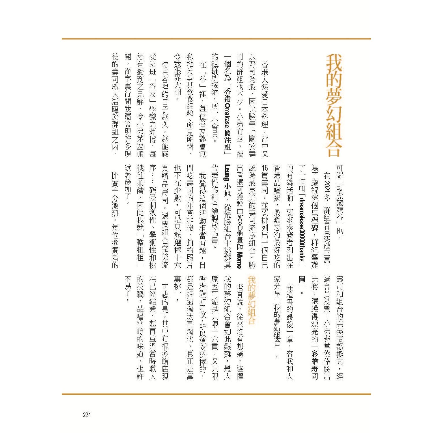 在2021冬,「香港Omakase關注組」的組群會員突破三萬,為了慶祝這個里程碑,群組舉辦了一個叫「dreamakase30000thanks」的有獎活動,要求參賽者列出在香港品嚐過的,最難忘和最好吃的16貫壽司,並要排列出一個自己認為最完美的壽司流序組合,我「膽粗粗」試著參加了。比賽十分激烈,小弟非常僥倖勝出比賽。在這書的最後一章,容我和大家分享「我的夢幻組合」。