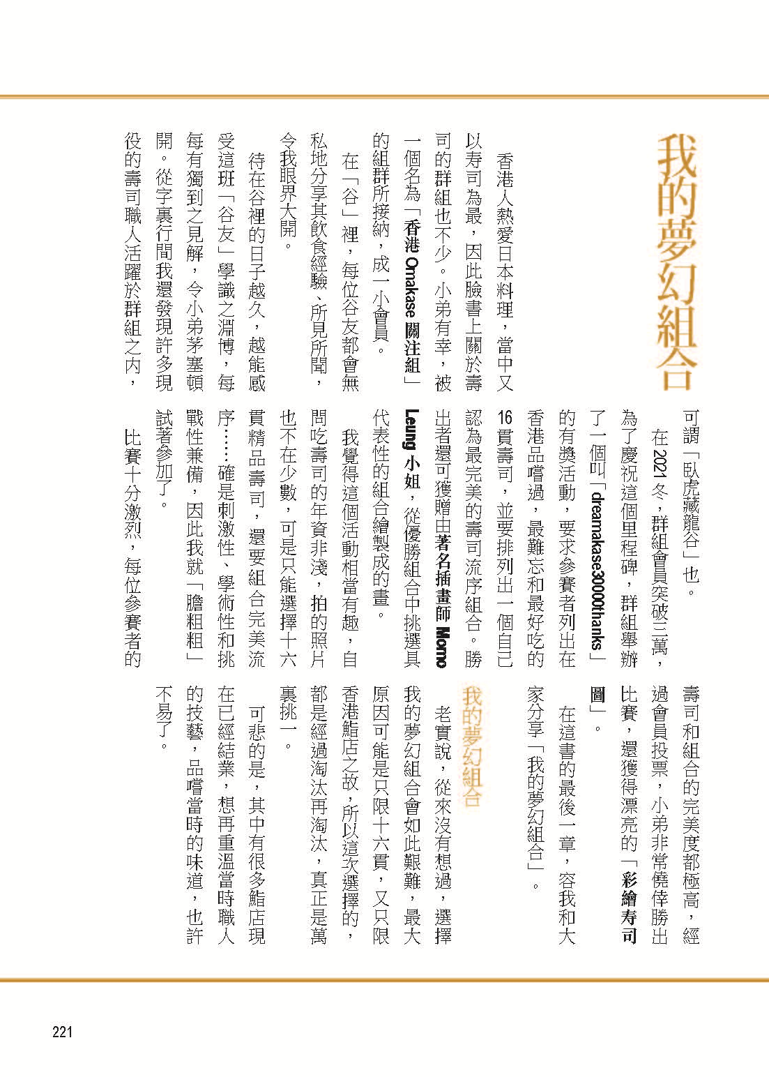 在2021冬,「香港Omakase關注組」的組群會員突破三萬,為了慶祝這個里程碑,群組舉辦了一個叫「dreamakase30000thanks」的有獎活動,要求參賽者列出在香港品嚐過的,最難忘和最好吃的16貫壽司,並要排列出一個自己認為最完美的壽司流序組合,我「膽粗粗」試著參加了。比賽十分激烈,小弟非常僥倖勝出比賽。在這書的最後一章,容我和大家分享「我的夢幻組合」。