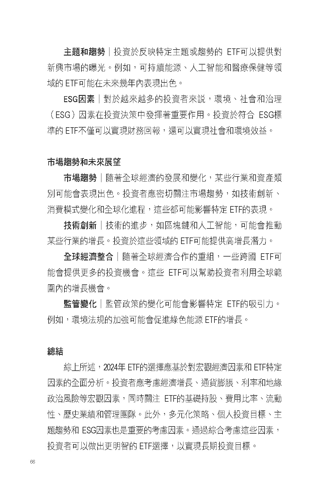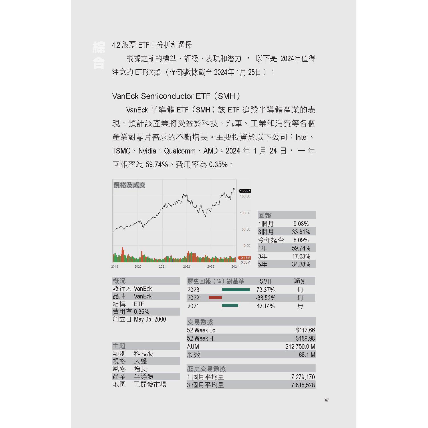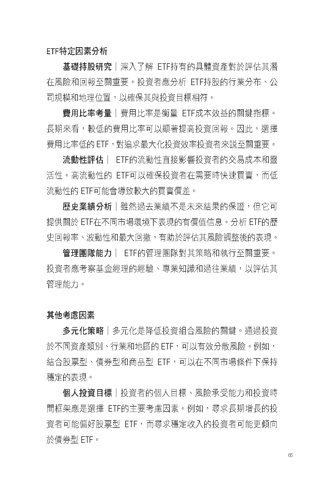在投資策略部分,本書提供了多種ETF投資組合模型,包括平衡型、保守型和積極型,並根據不同的風險偏好和投資目標給出具體的配置建議。此外,書中還詳細介紹了如何進行年中投資組合的調整和重新平衡,以應對市場的波動和變化。