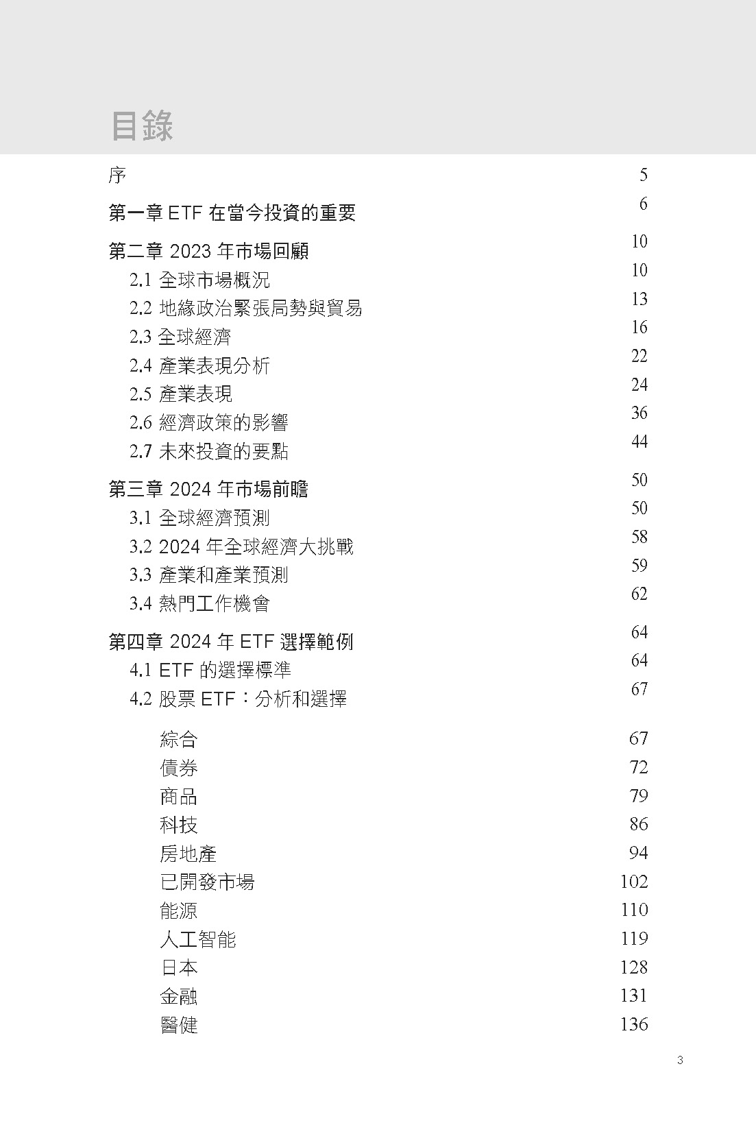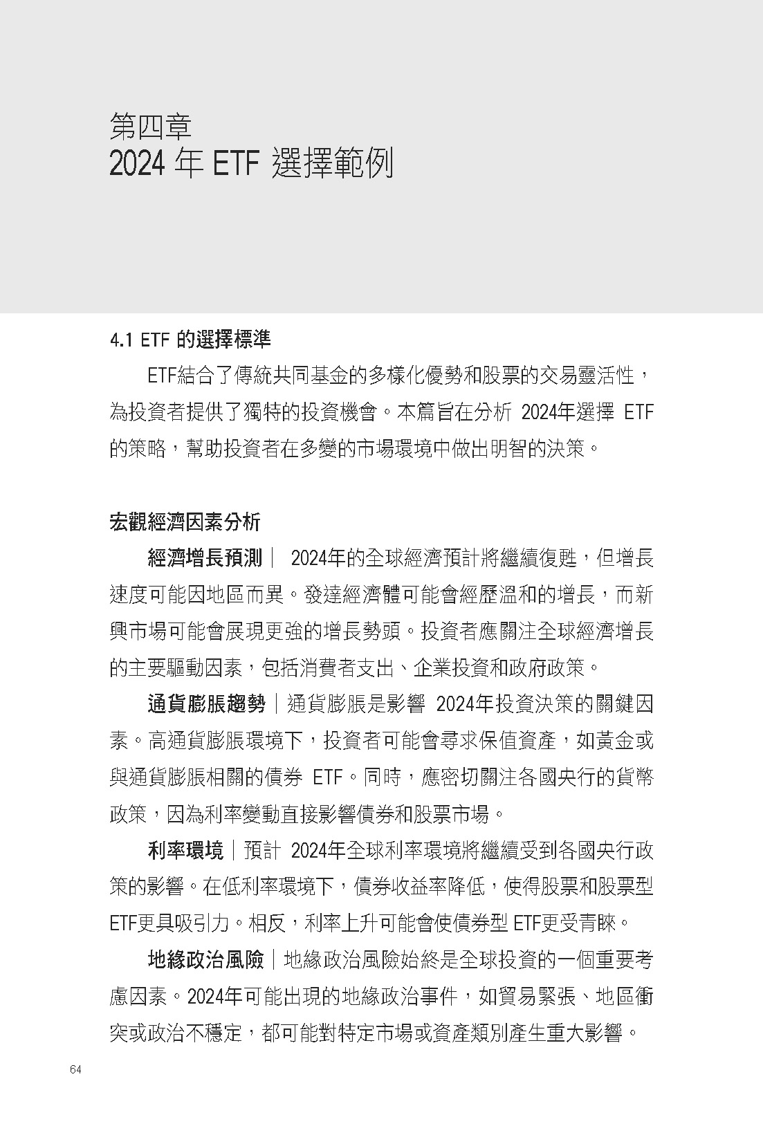 《2024全球經濟與ETF投資》是一本針對投資者的實用指南,旨在提供深入的市場分析和策略建議,幫助讀者在2024年的多變經濟環境中做出明智的投資決策。本書涵蓋了從全球經濟趨勢、地緣政治風險,到科技創新和環境政策等多方面的內容,並針對交易所交易基金(ETF)作為投資工具的實際應用。