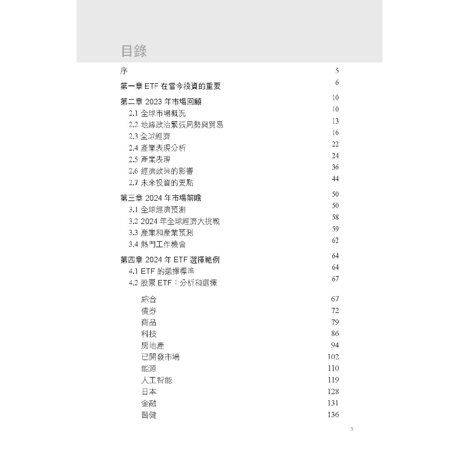 書中對2024年的全球經濟進行了分析,包括疫情後的經濟復甦情況、不均衡的全球增長、通脹壓力、以及地緣政治和貿易政策等因素如何影響市場。書中還深入探討了科技創新和數字化轉型對經濟的驅動作用,以及環境政策和可持續發展趨勢對投資的影響。