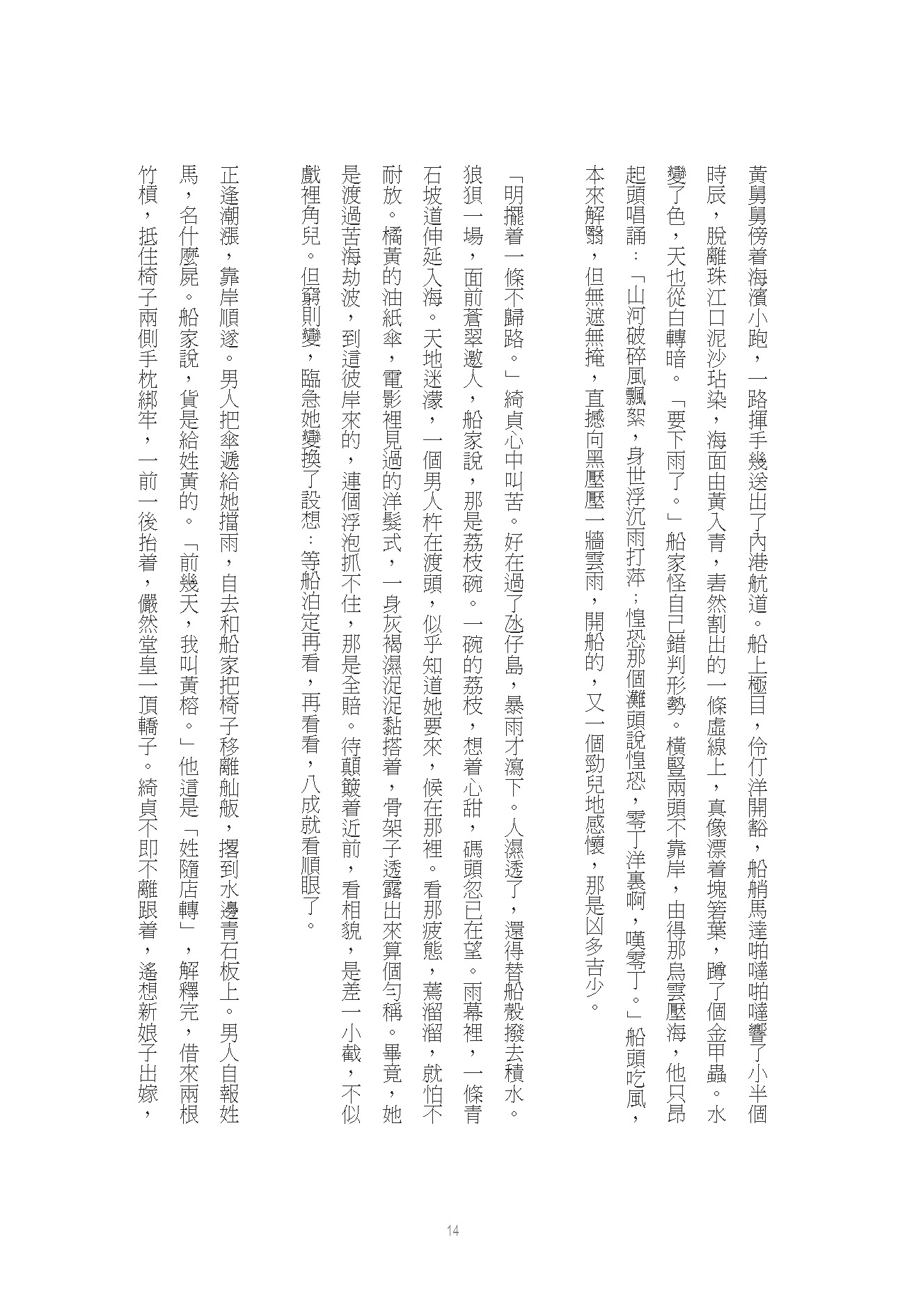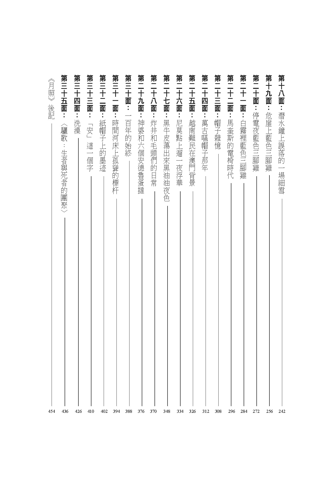 從《雪狼湖》到《花渡》到《月照》,一函「雪花月」,相續二十八載,計六十萬言。這不是什麼三部曲,是暈染以墨,我的澳門三疊紀。文學的過路灣,或者馬貢多,不能憑一幅車船路線圖去尋覓。我少年時,半島鬧市有「21a」敞篷雙層巴士,直達路環黑沙。樓上放目,雲低天闊。但就再搭上那輛車,你卻回不了那車站;畢竟「黑沙」是一段時光,不是一個地點。車門打開,你看不到某一場颱風過後,庭前連枝的那一行玉樹;見不着灘頭,你和某人的相濡相擁;而月亮,自古以來,數那一夜圓滿。「『三疊紀』所紀,就那敞篷公車,千迴百轉,卻總錯過了的時光。」我這樣歸結。——《月照》後記