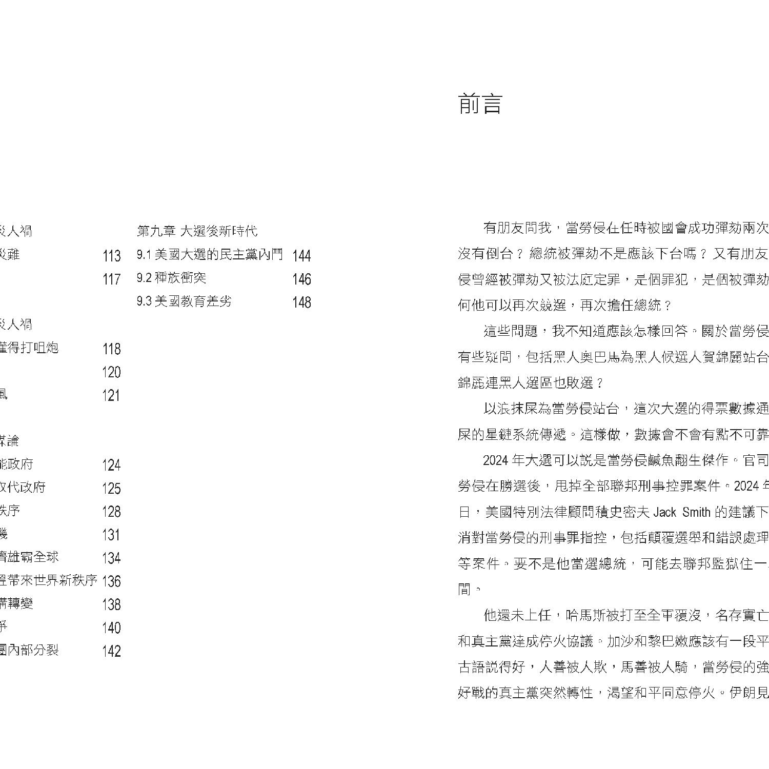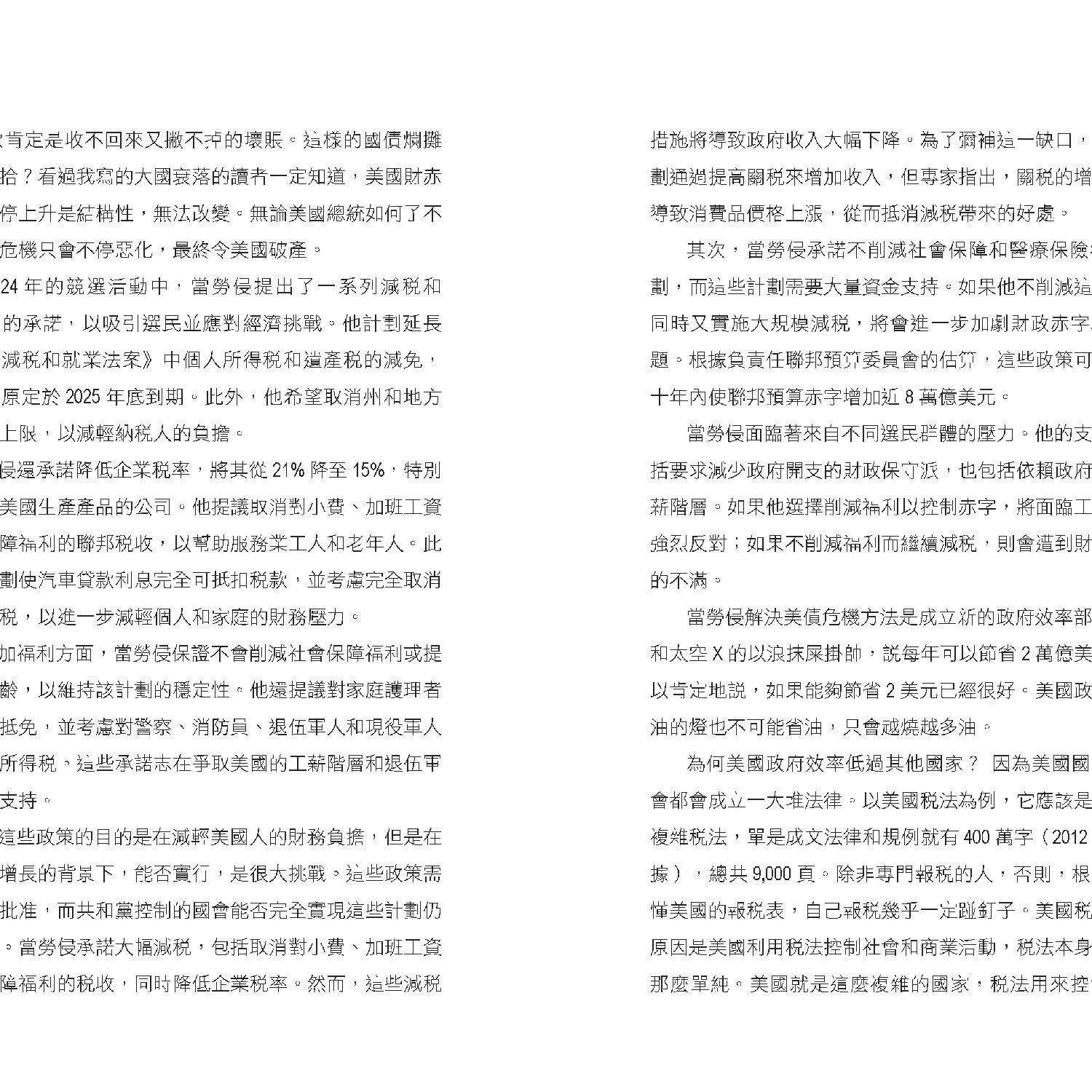書中首先聚焦於特朗普的政治策略和經濟政策。他在2024年大選中勝出,共和黨全面掌控白宮和國會,這被視為對拜登政府政策不滿的反映。特朗普計劃對中國商品徵收高達60%的關稅,旨在削弱中國經濟影響力並促進美國本土生產。這一政策可能加劇中美貿易緊張,並導致全球供應鏈重組。作者指出,許多企業已開始將生產基地從中國轉移至越南、印度等地,以應對高額關稅帶來的風險。