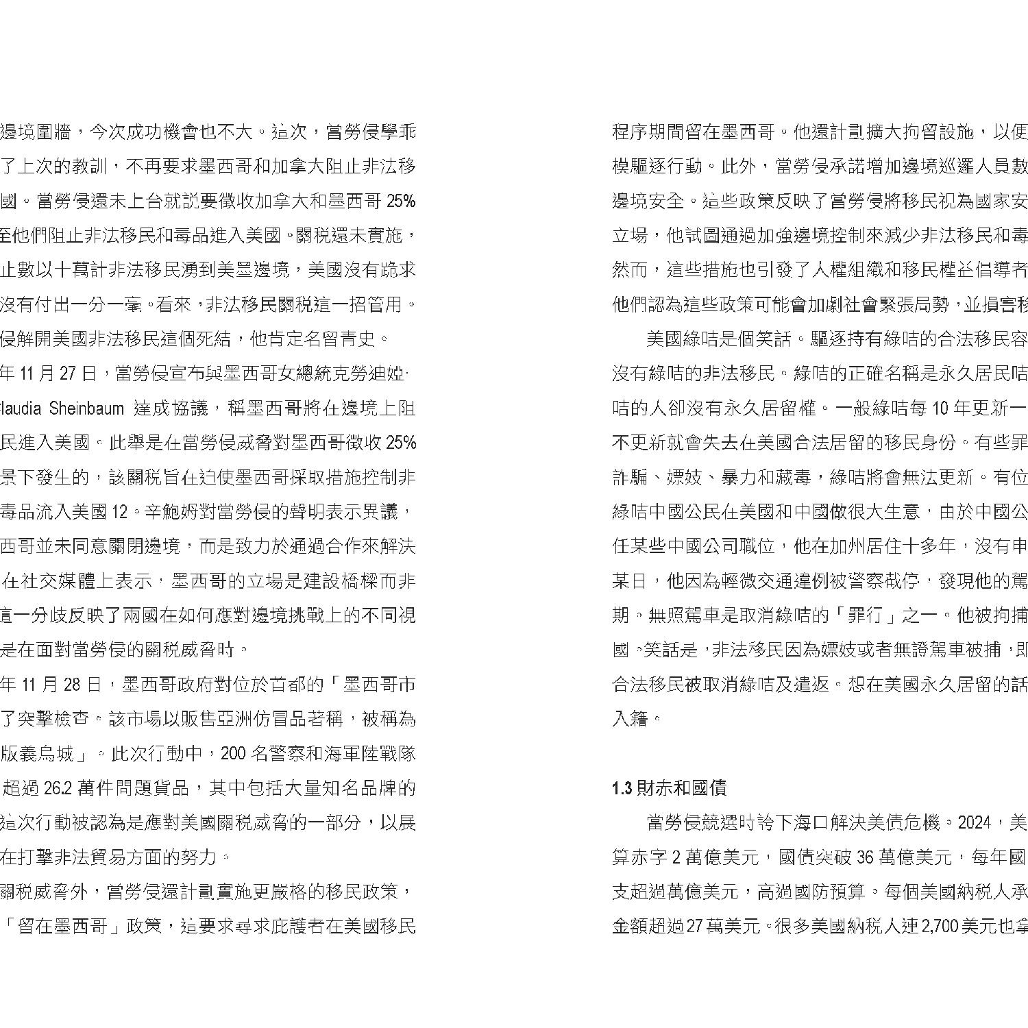 國內方面,特朗普面臨非法移民、財政赤字和社會分裂等挑戰。他提出減稅和增加福利的政策,但這可能進一步惡化財政狀況。同時,他計劃動員國民警衛軍驅逐非法移民,試圖解決移民危機,但執行難度極高。此外,書中批評特朗普否認氣候變化威脅,並計劃增加石油生產以降低油價,此舉可能加劇環境問題。