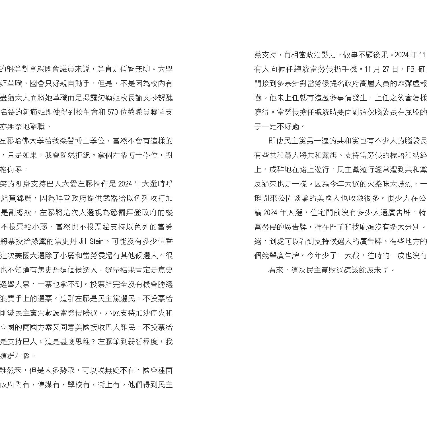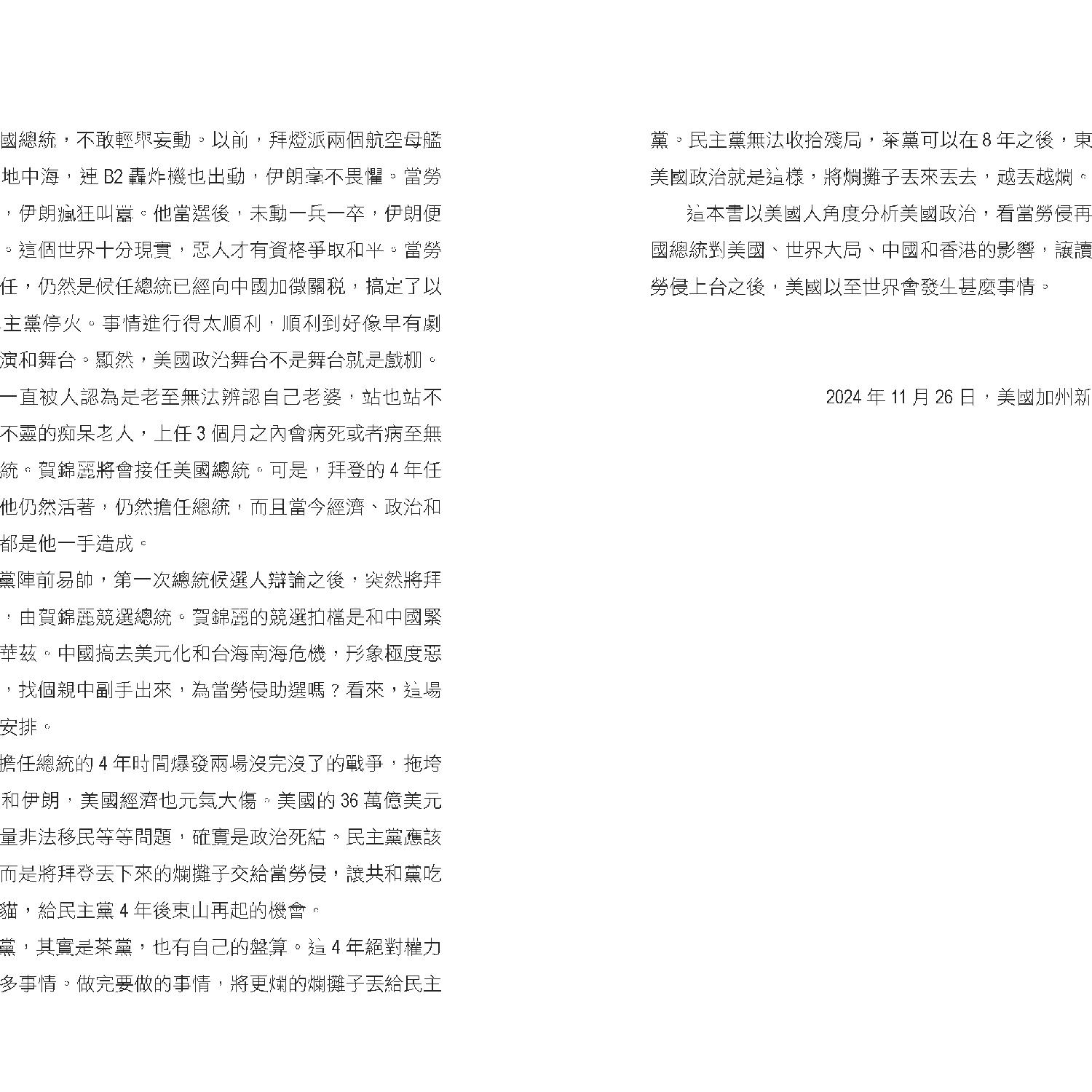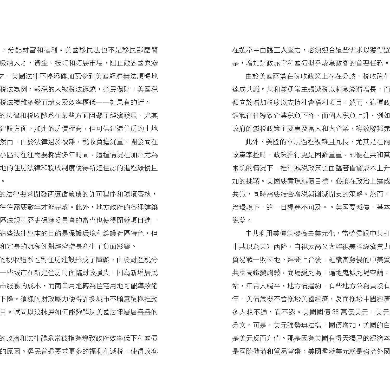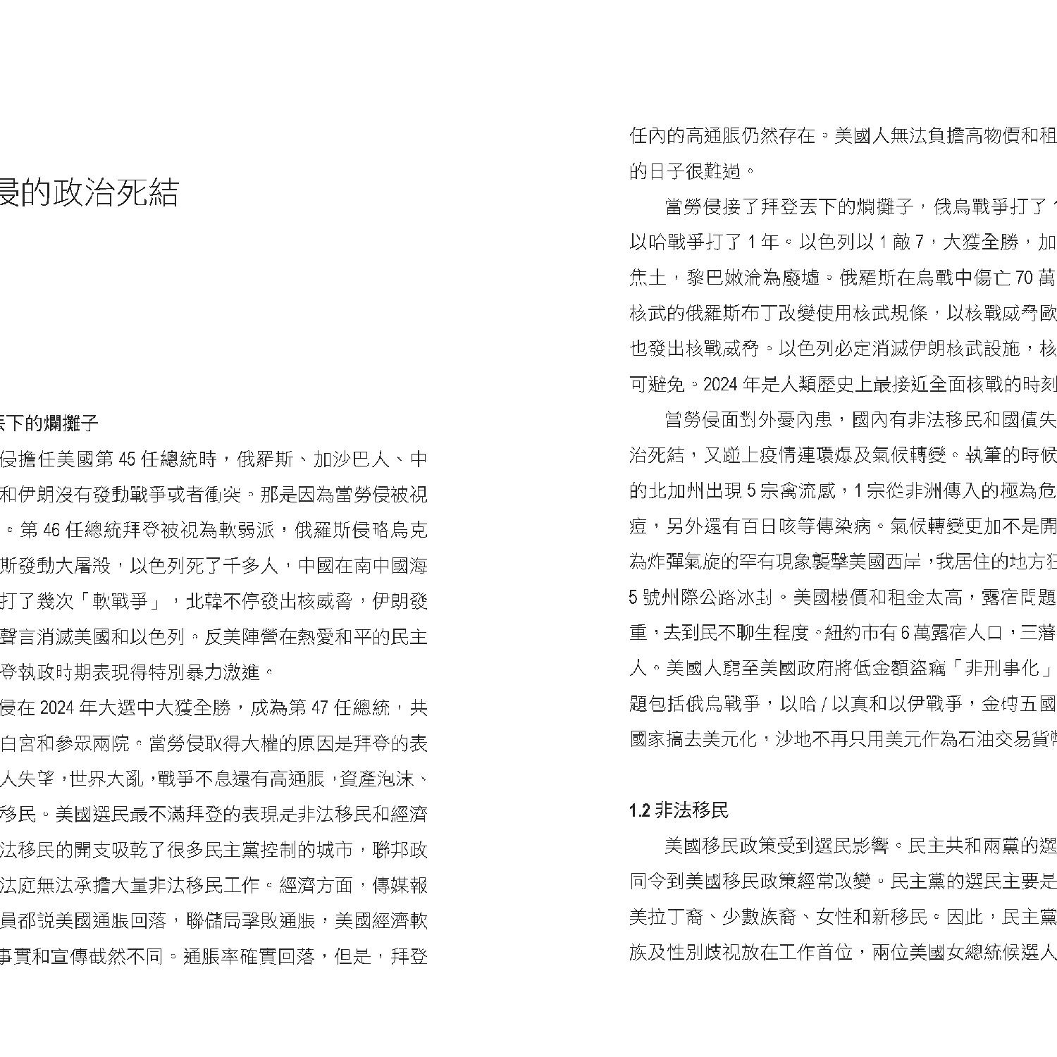 作者特別強調,美國內部的政治極化與社會分裂在特朗普執政下可能進一步加劇。共和黨與民主黨在多個議題上分歧嚴重,而特朗普「美國優先」的立場或將加深美國與盟友之間的矛盾。