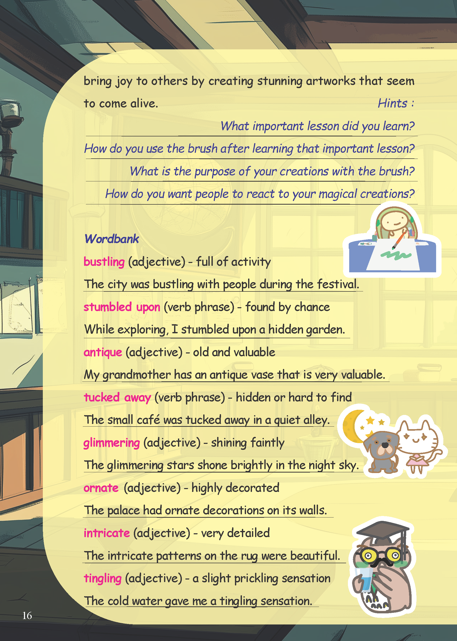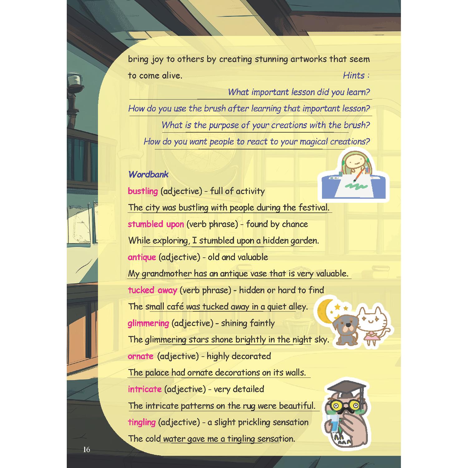 在引導學生思考各部分內容時,書中提供適用的「動詞」、「形容詞」及描述「環境」、「氣氛」等增強字庫的生字和例句,幫助學生豐富語言表達。