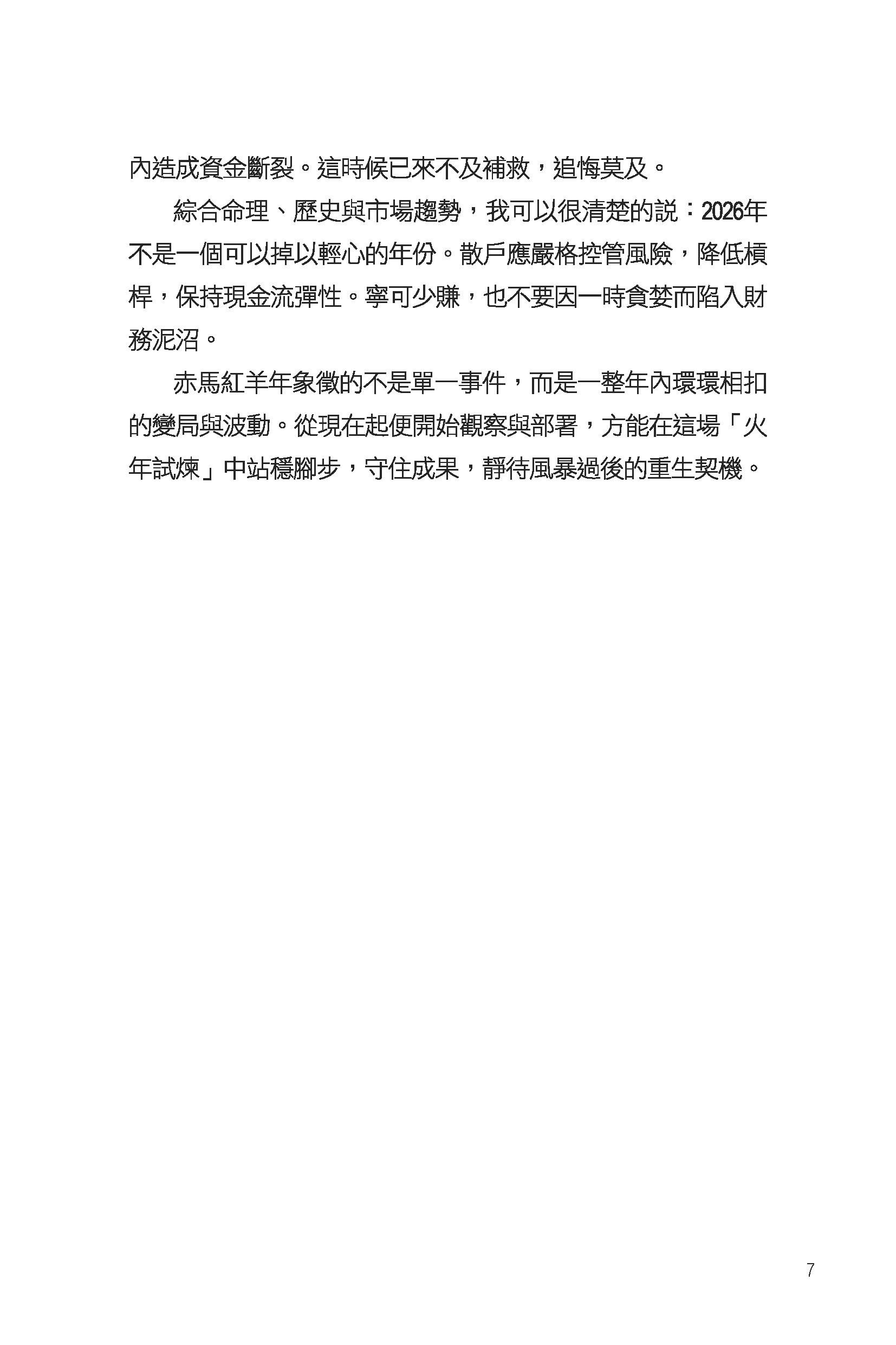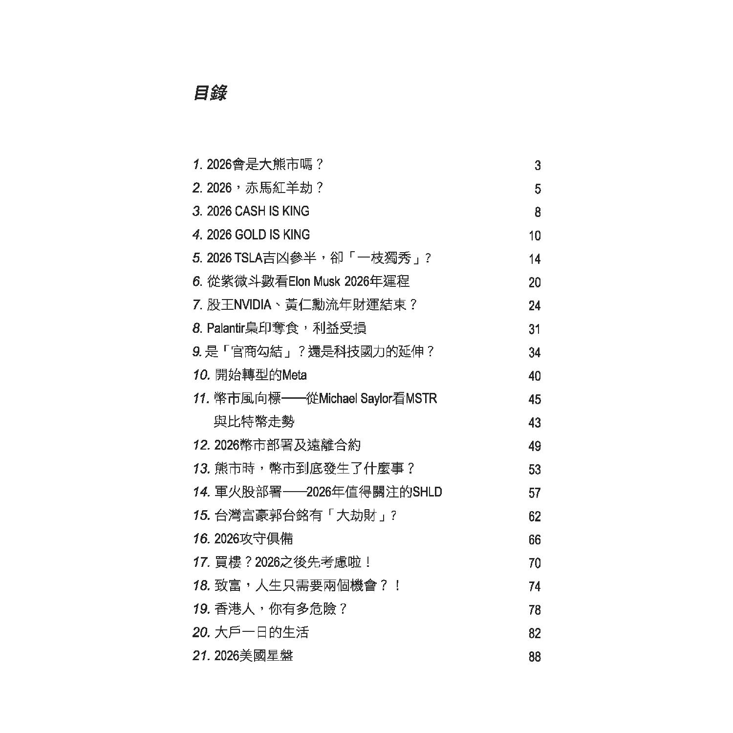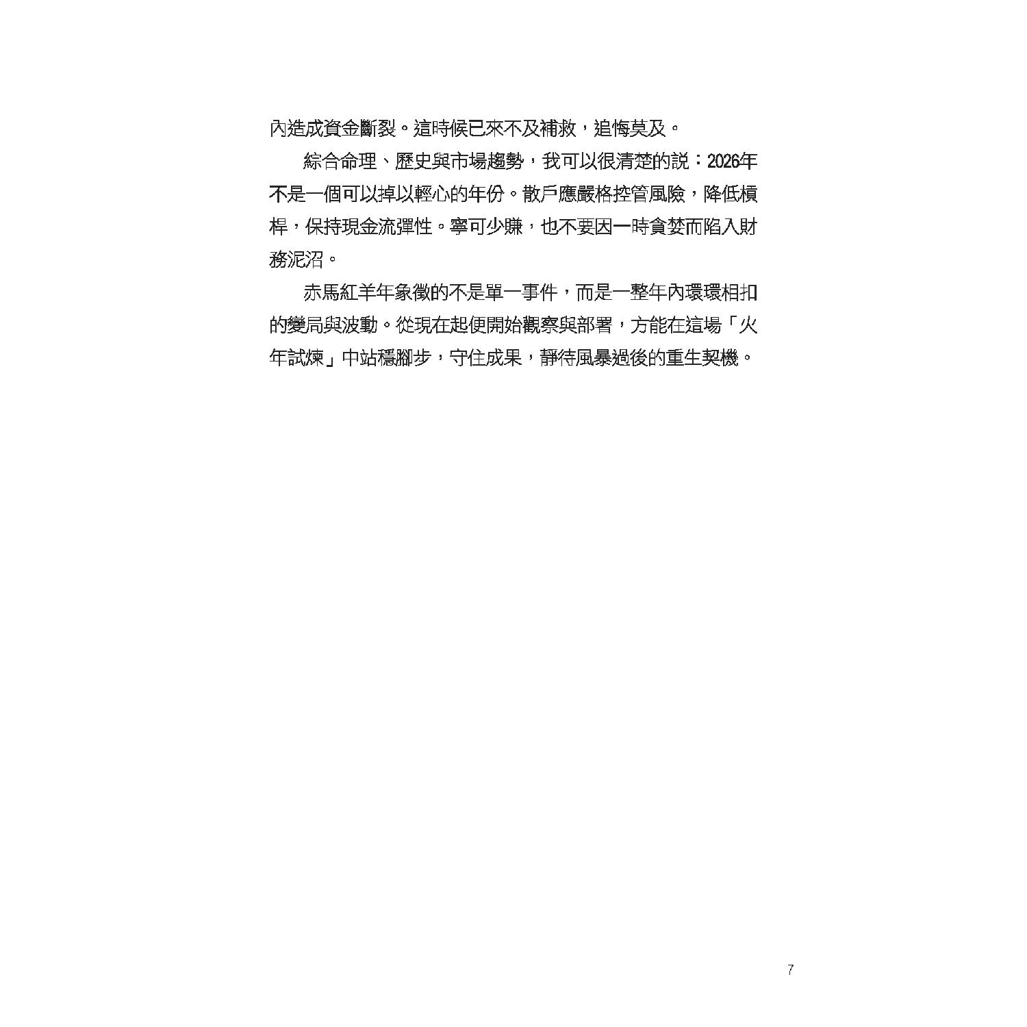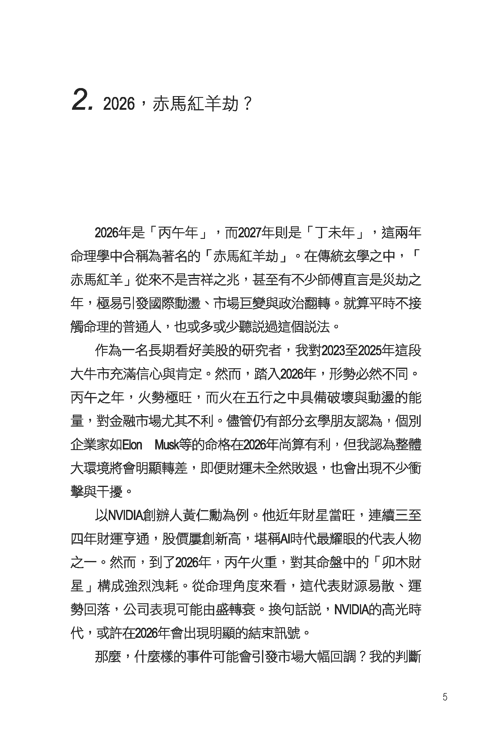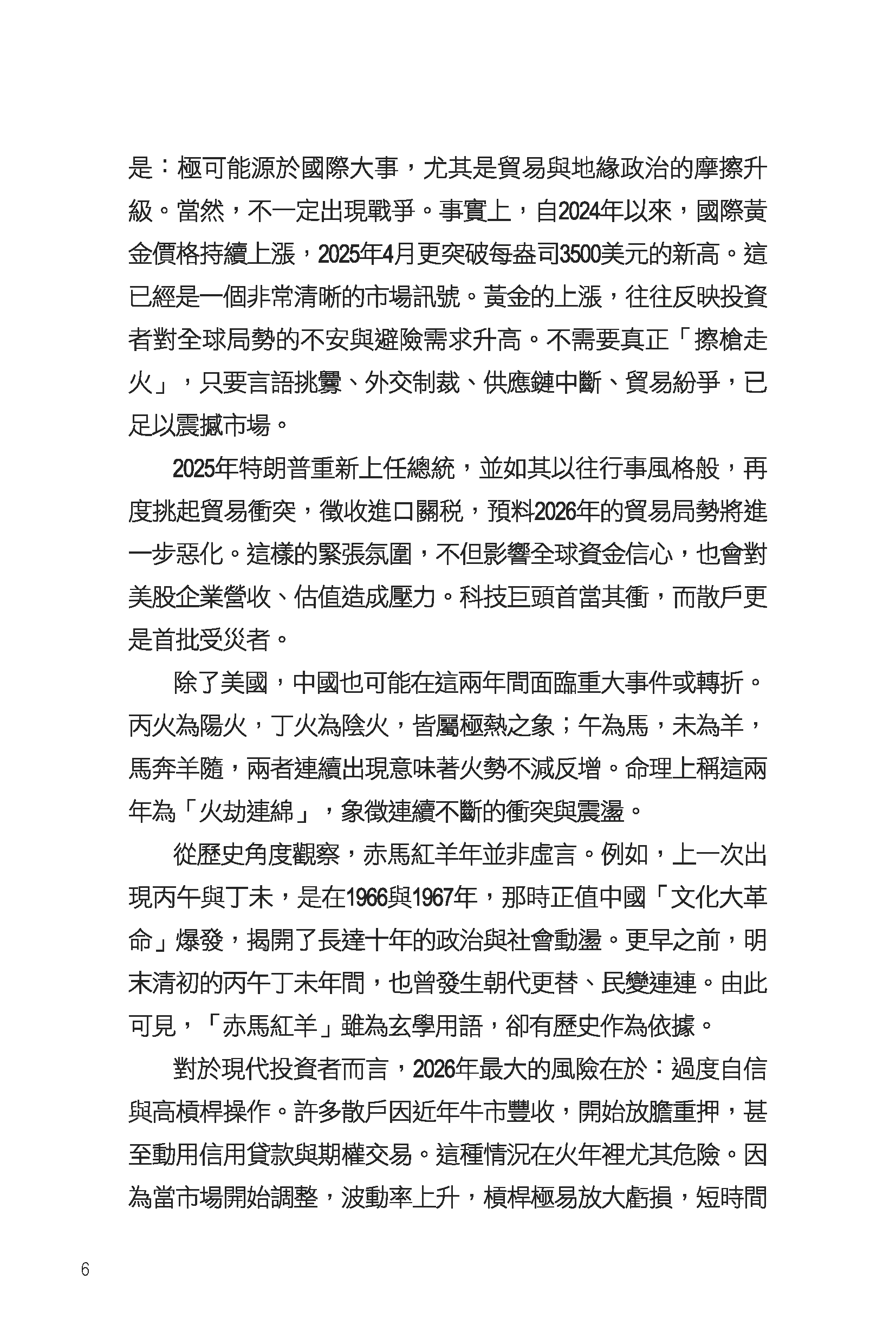 2026年丙午火年,「火劫連綿」,象徵金融動盪、地緣衝突與資產破耗之象。大市轉熊,槓桿者必傷。面對資金退潮與政治不穩,謹記「現金黃金為王」,方可守得雲開。本書並提供詳細流月指引與避險策略,指點何時減倉、何時觀望、何時低接。