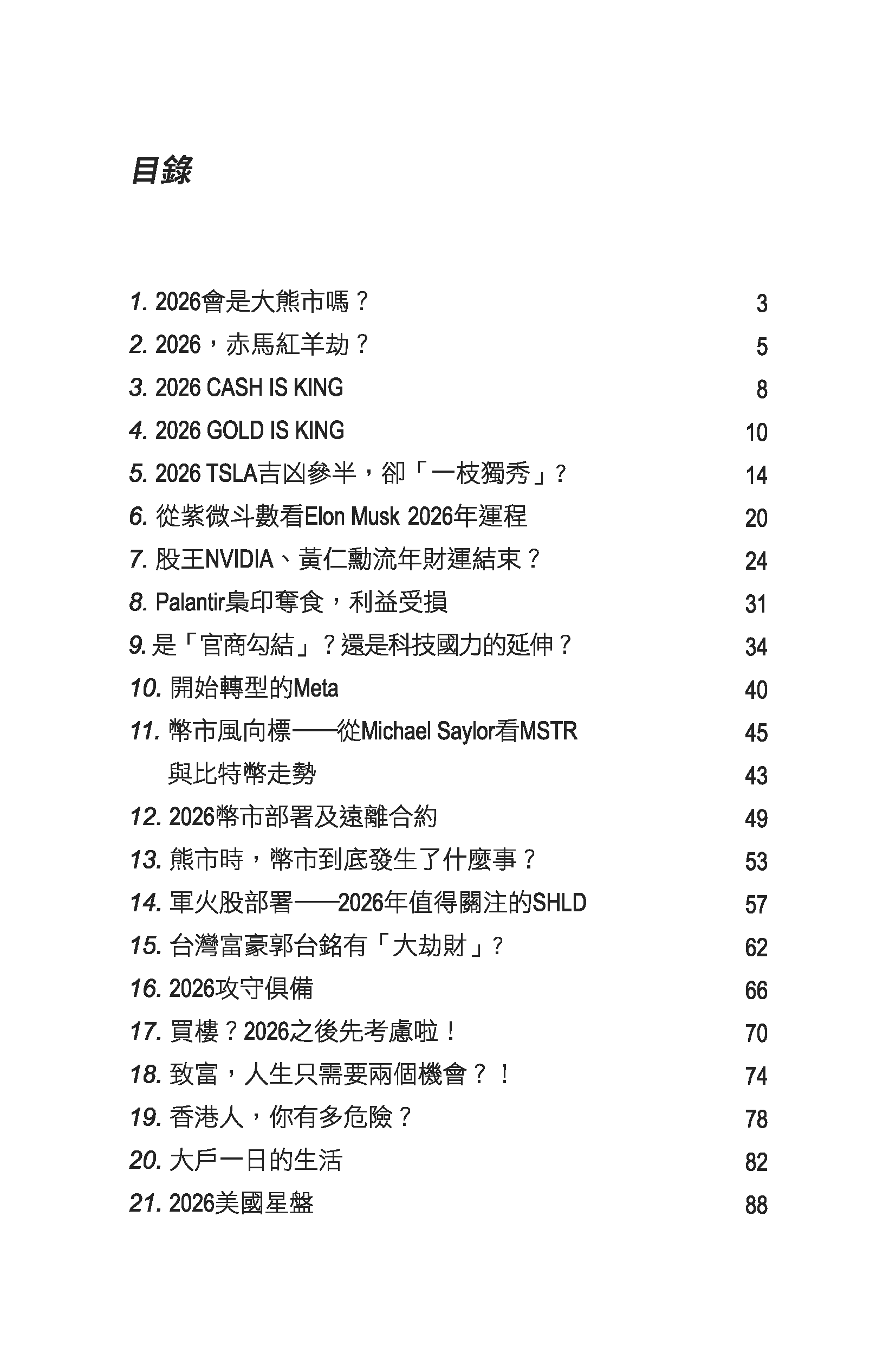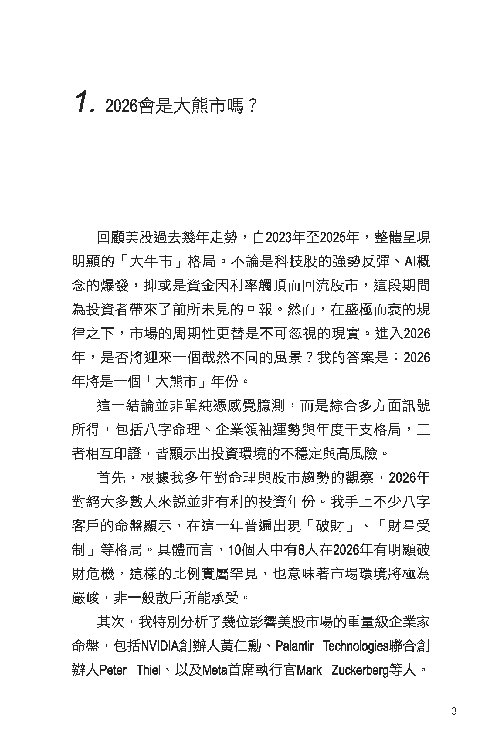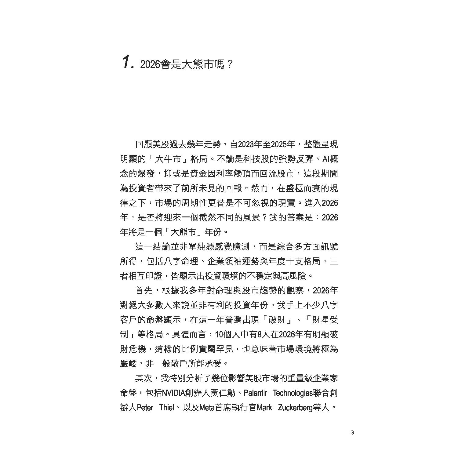 《美股通勝2026》是一部橫跨命理、金融與戰略佈局的金融實戰通勝。無論是資深投資者,抑或關注運勢的職場人士,都能從中找到「避凶趨吉、攻守有道」的智慧。2026,危中有機——先知者,才能先行。