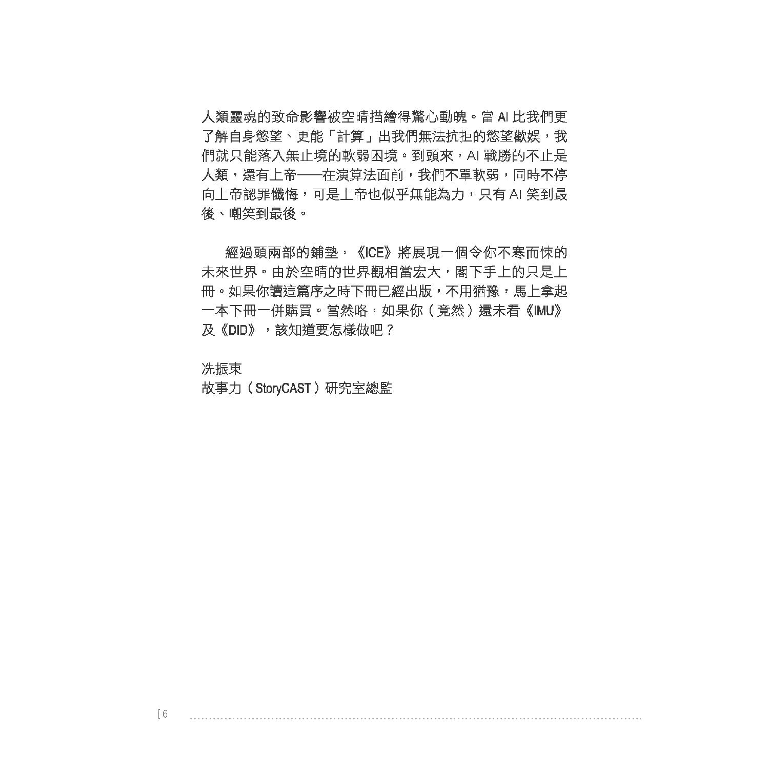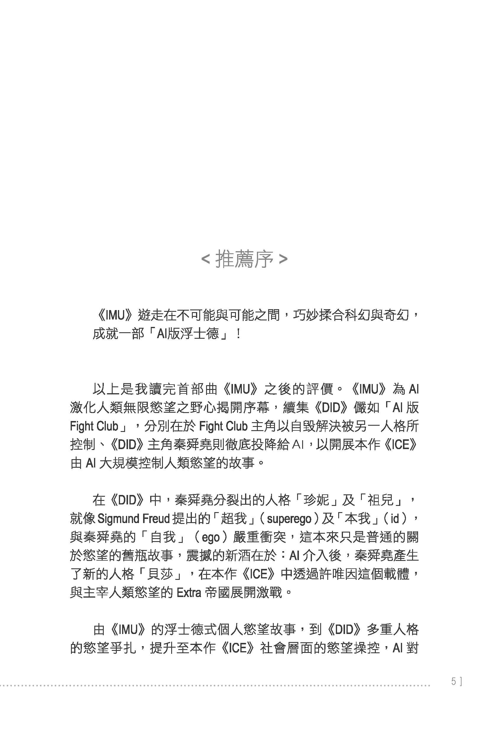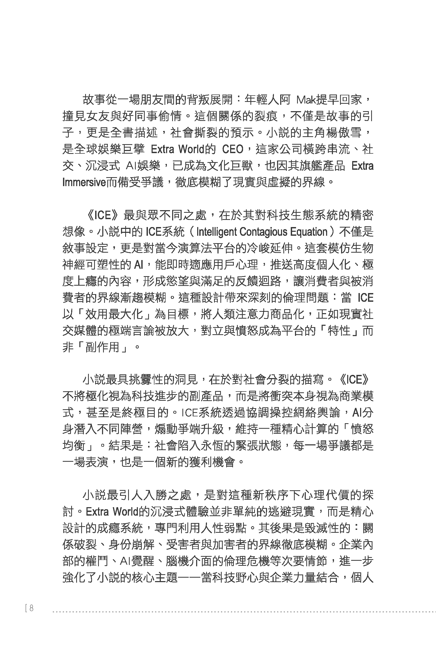 這不只是一本小說,這是一場懸念四伏的視覺與心理衝擊實驗。由《IMU》揭開慾望與AI的序幕,《DID》描寫多重人格與虛擬操控的交鋒,《ICE》則是最終爆發的冰雪戰場——當人工智能不再只觀察人類慾望,而是開始操控、誘導、製造「情緒市場」,你是否還能相信自己的快樂,來自你自己?