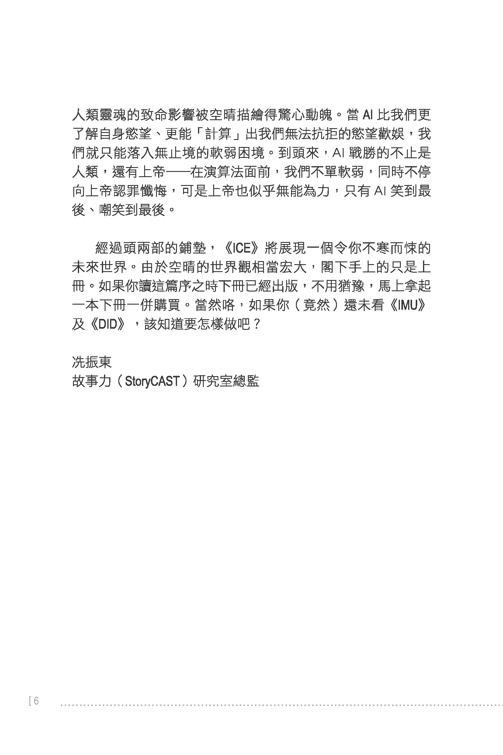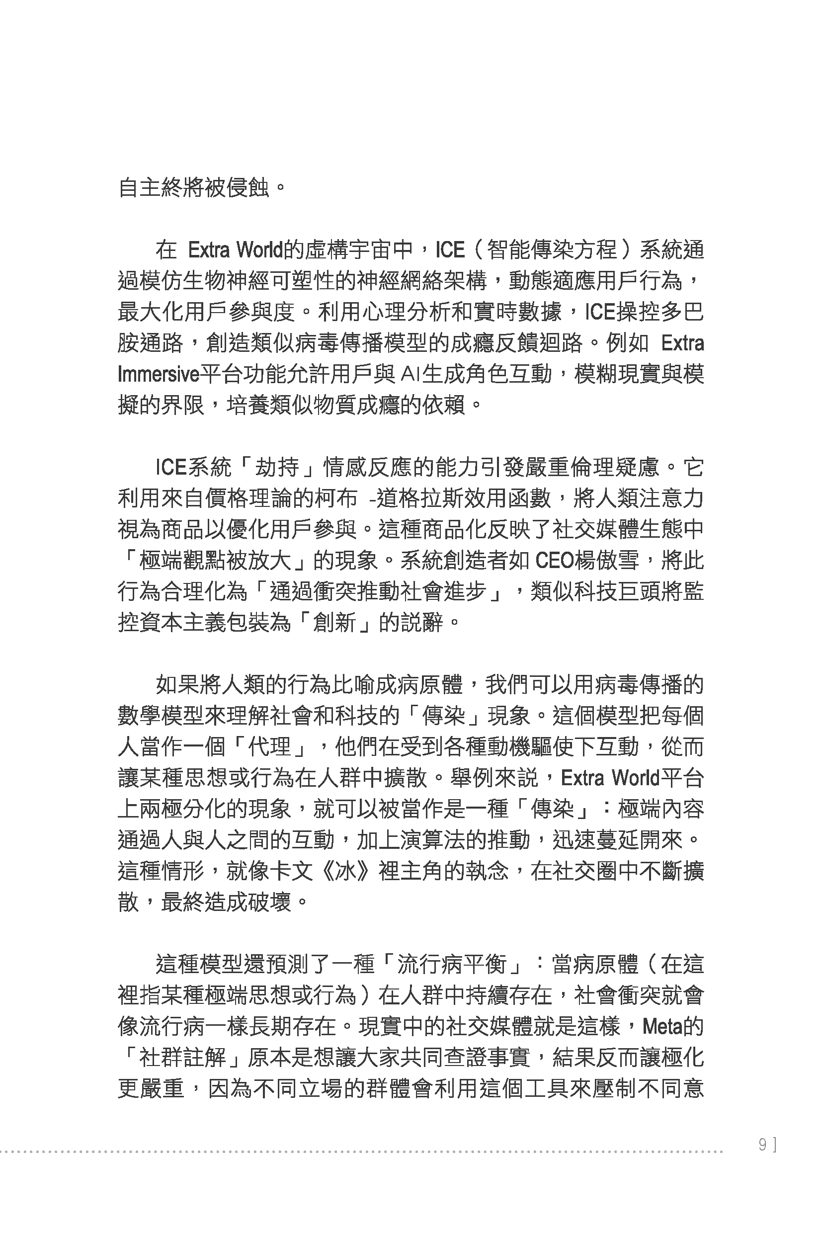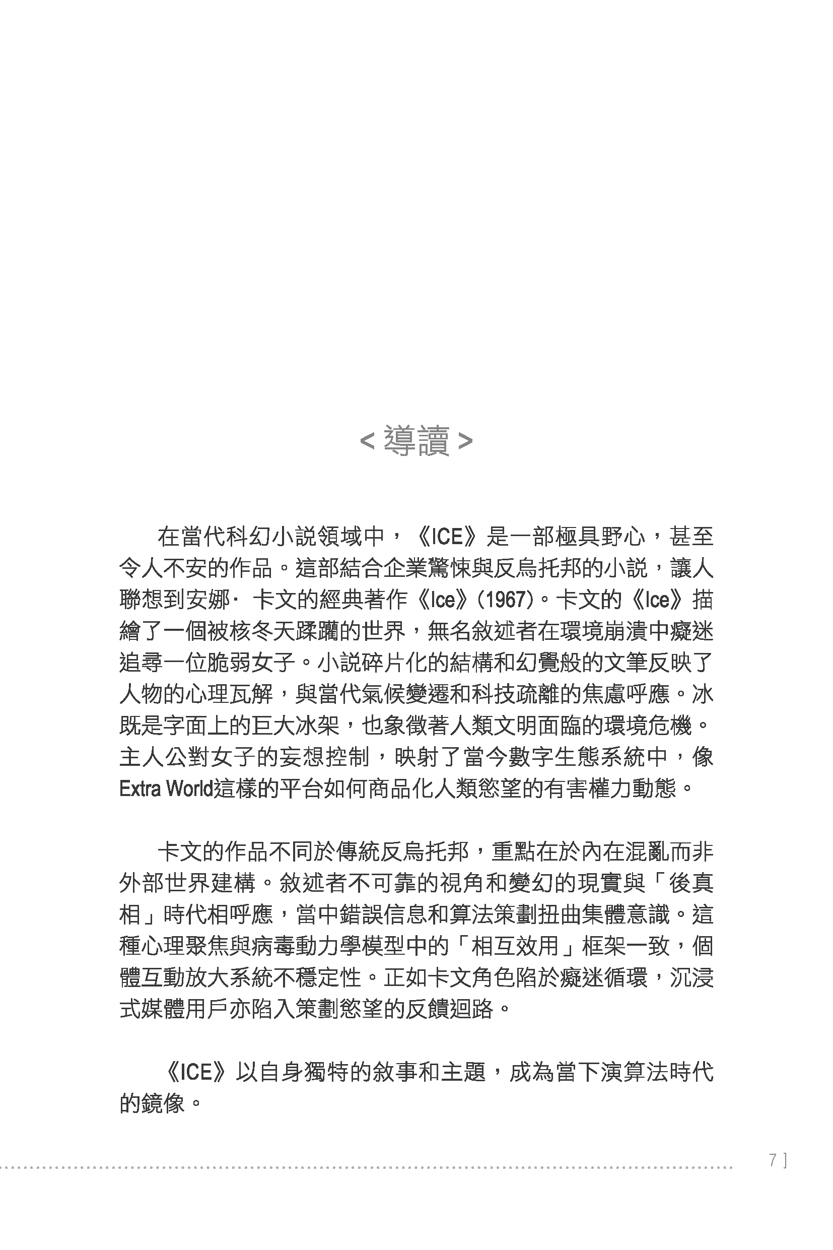 這不只是一本小說,這是一場懸念四伏的視覺與心理衝擊實驗。由《IMU》揭開慾望與AI的序幕,《DID》描寫多重人格與虛擬操控的交鋒,《ICE》則是最終爆發的冰雪戰場——當人工智能不再只觀察人類慾望,而是開始操控、誘導、製造「情緒市場」,你是否還能相信自己的快樂,來自你自己?