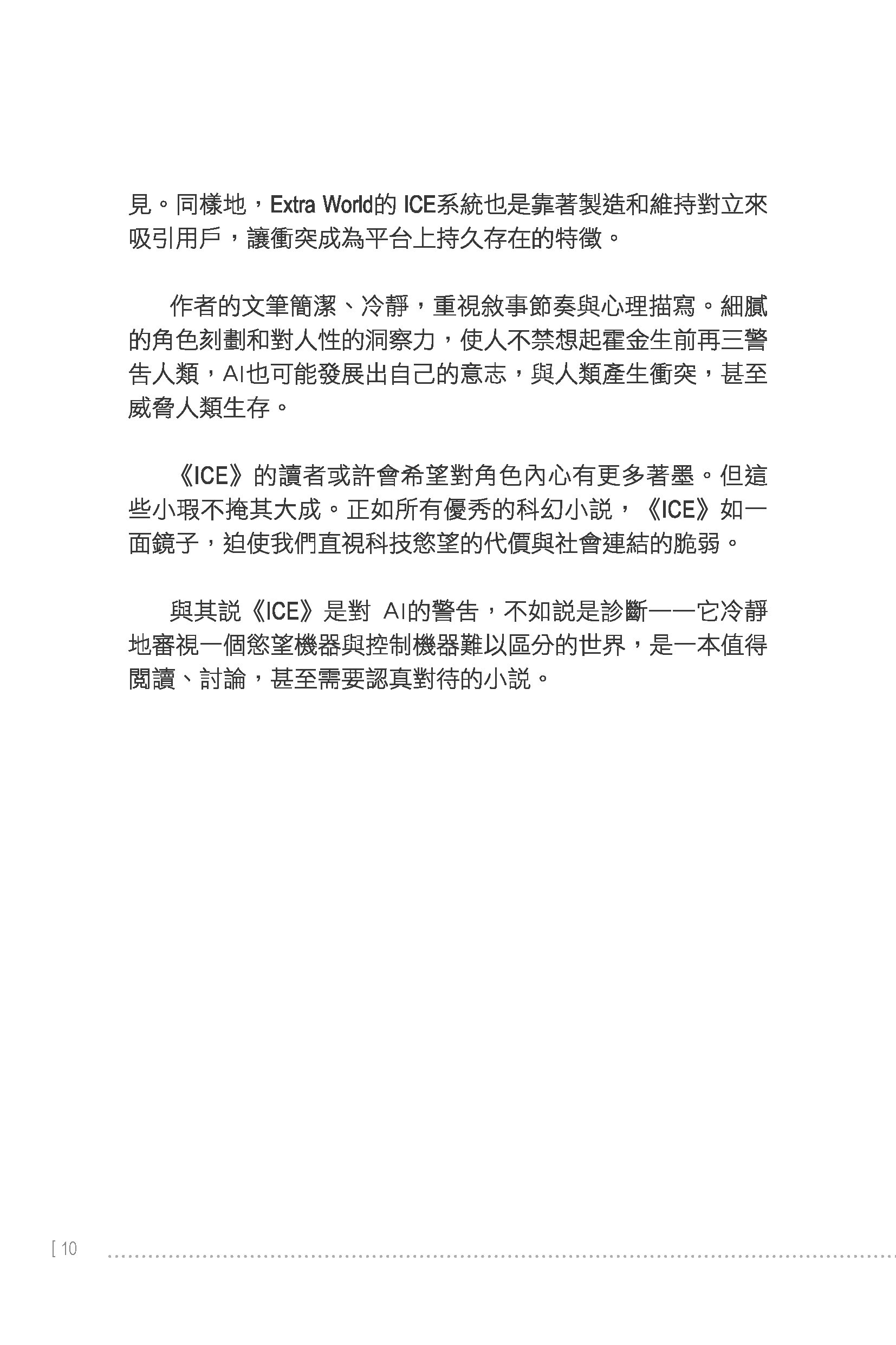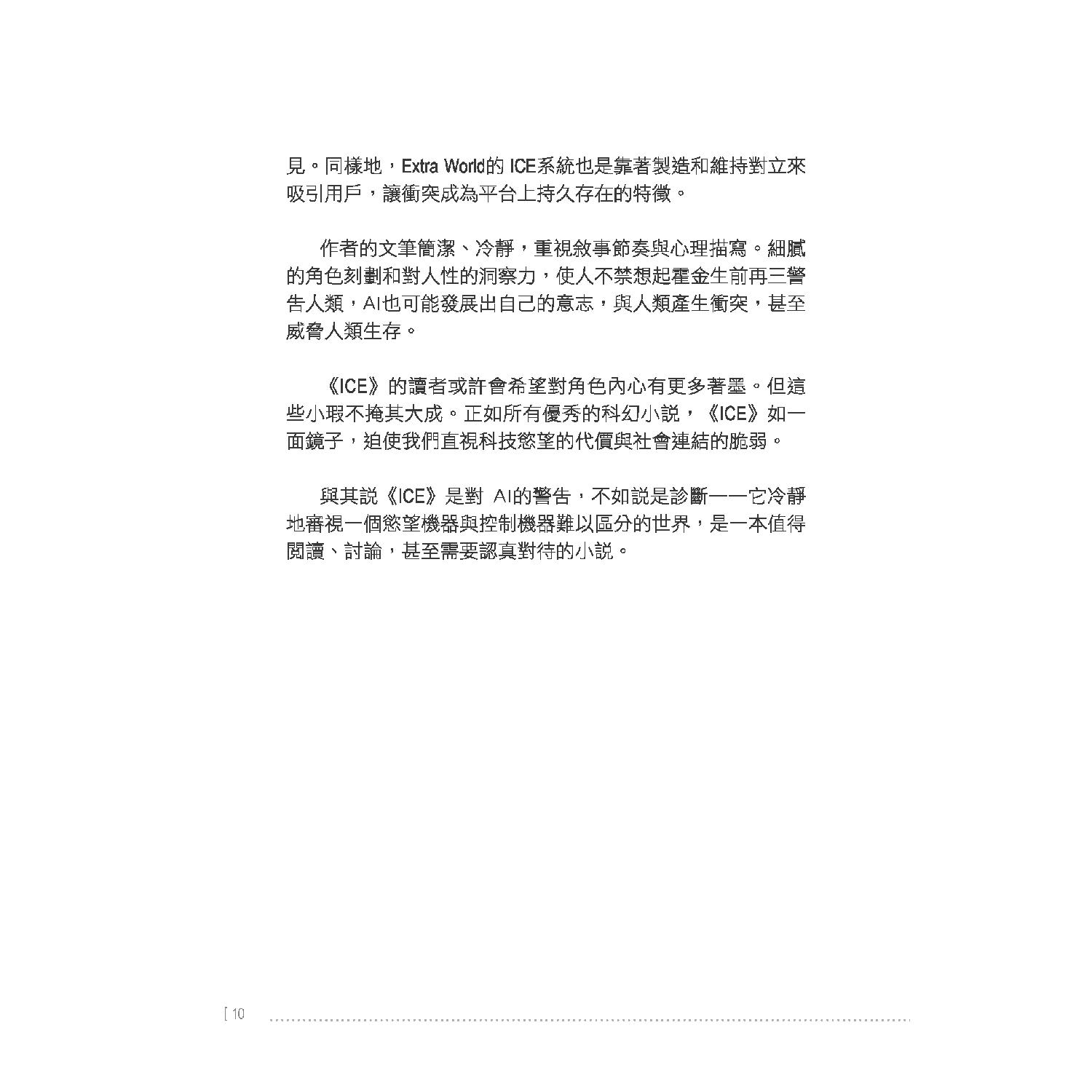 如果你喜歡《黑鏡》《Inception》《Fight Club》那種越看越不安、越陷越深的感覺,《ICE》就是你要找的小說。這不是一本可以輕鬆讀完的書,這是一場心理試煉、一場對AI未來的深度質詢。