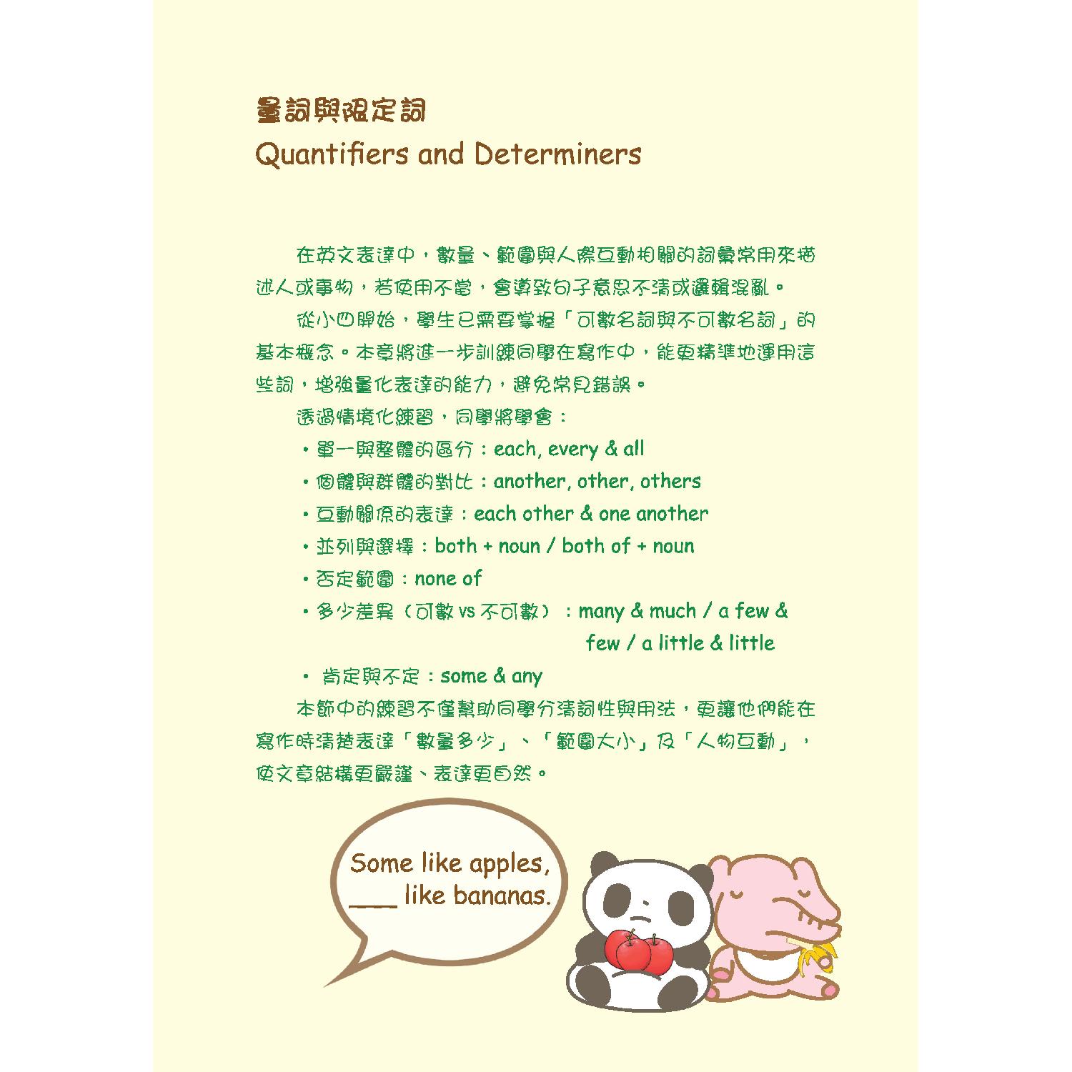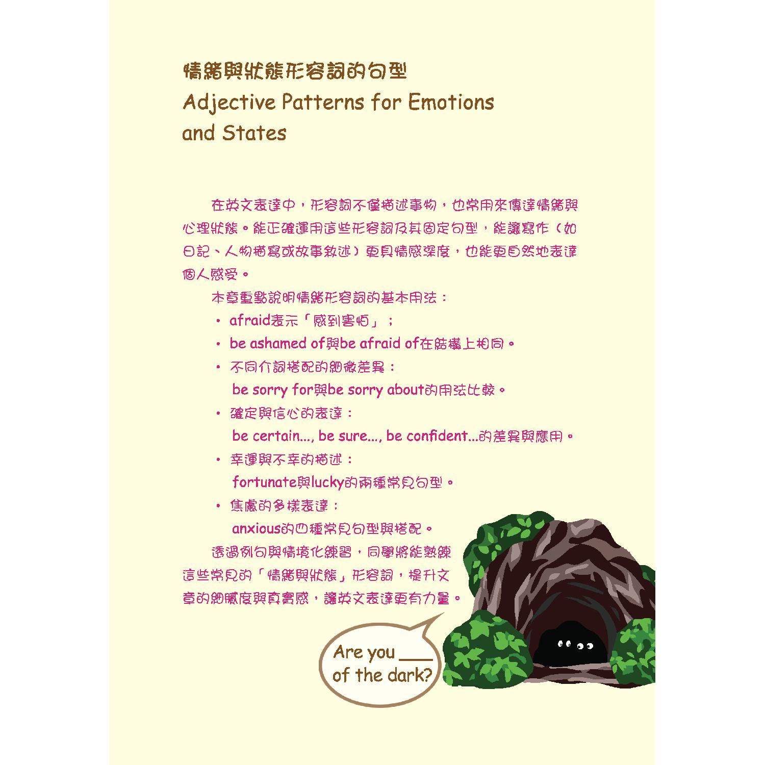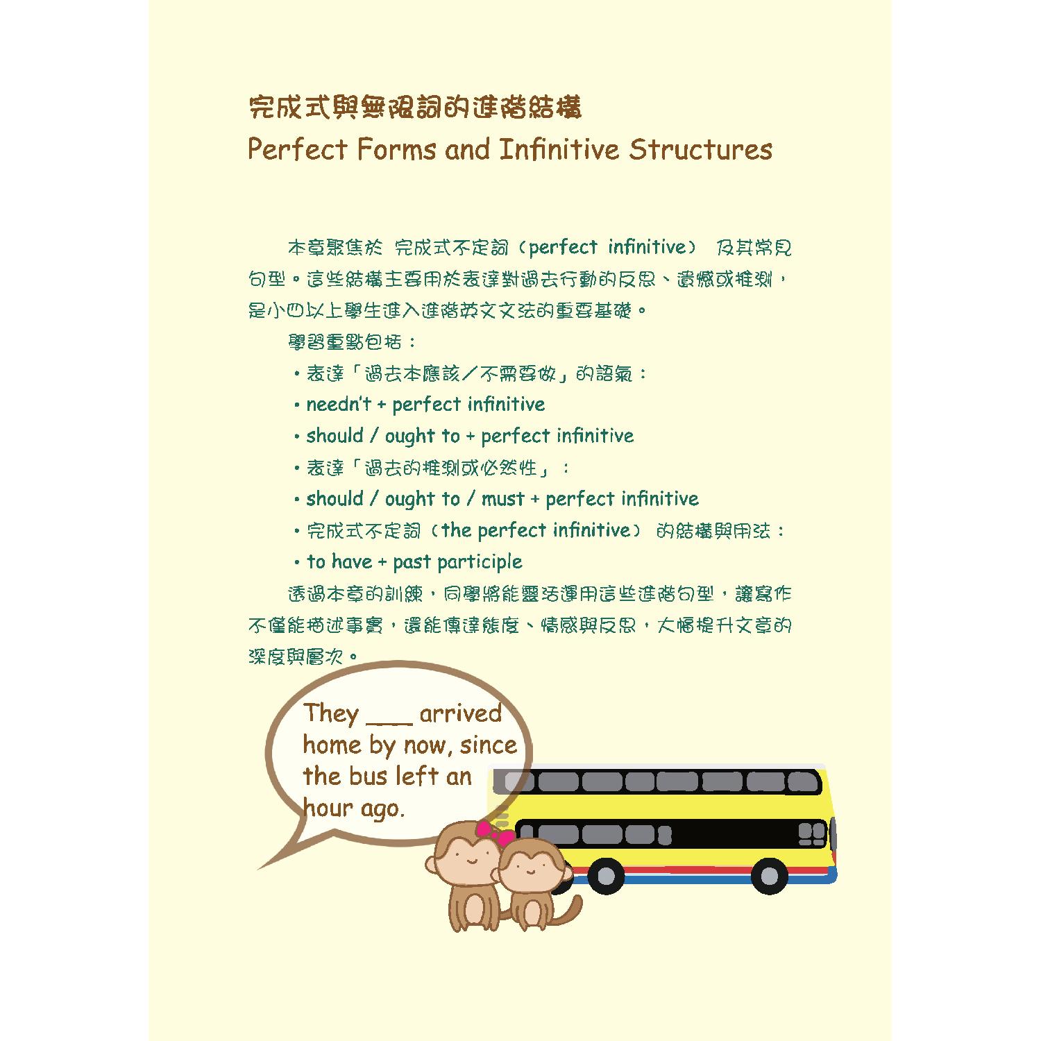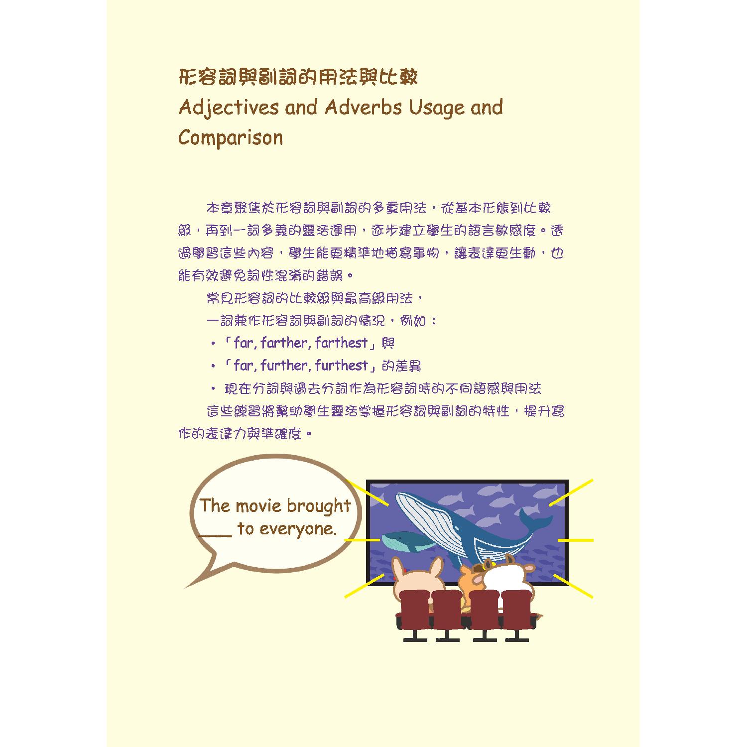 本書的特色在於:透過貼近日常生活的情境題目,讓同學能以「第一人稱」代入,實際操練時態、動詞、副詞等用法。這樣的訓練能幫助同學更清楚分辨詞性和時態,並在不同語境中正確運用詞彙,逐步建立精準的語言感。