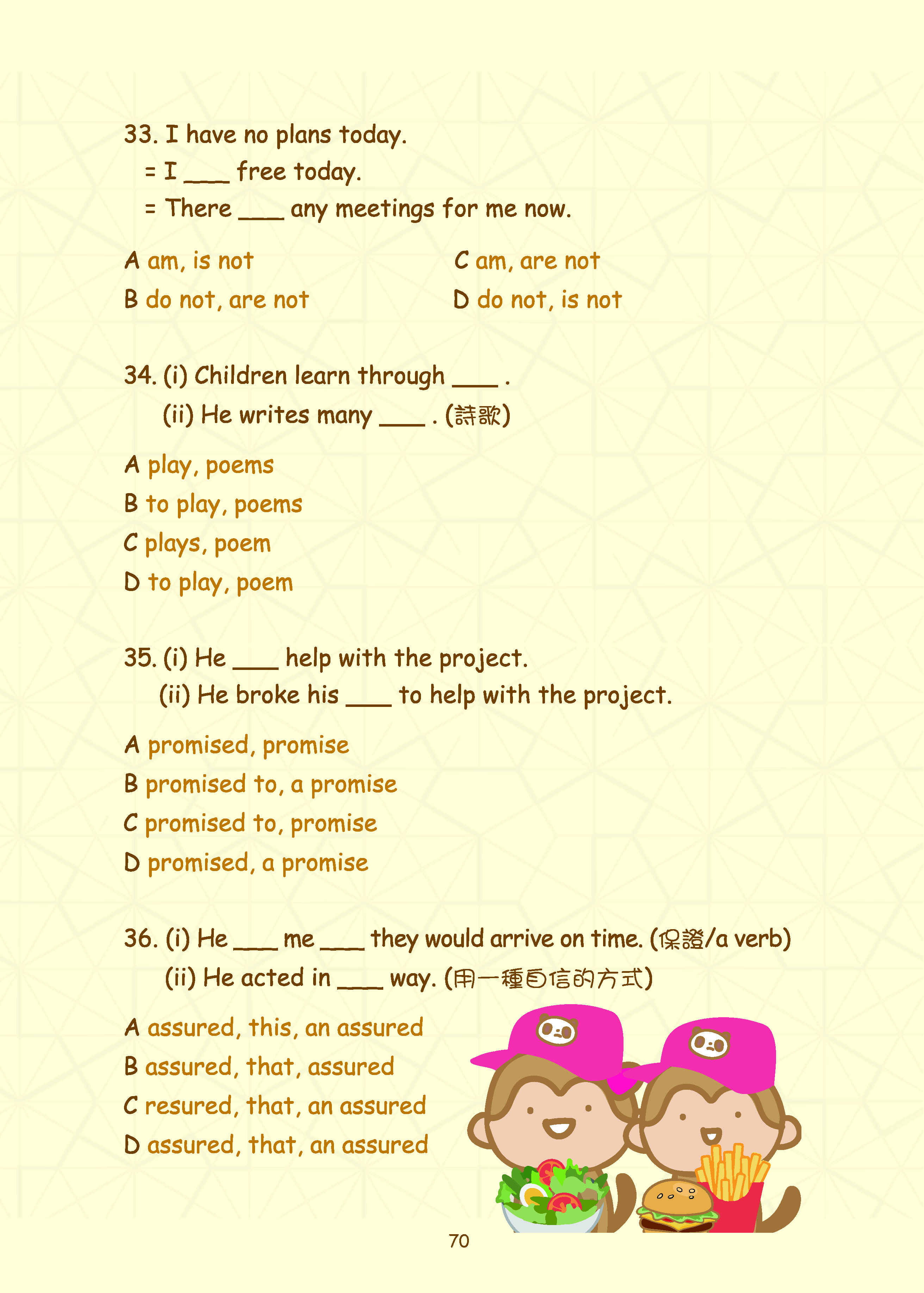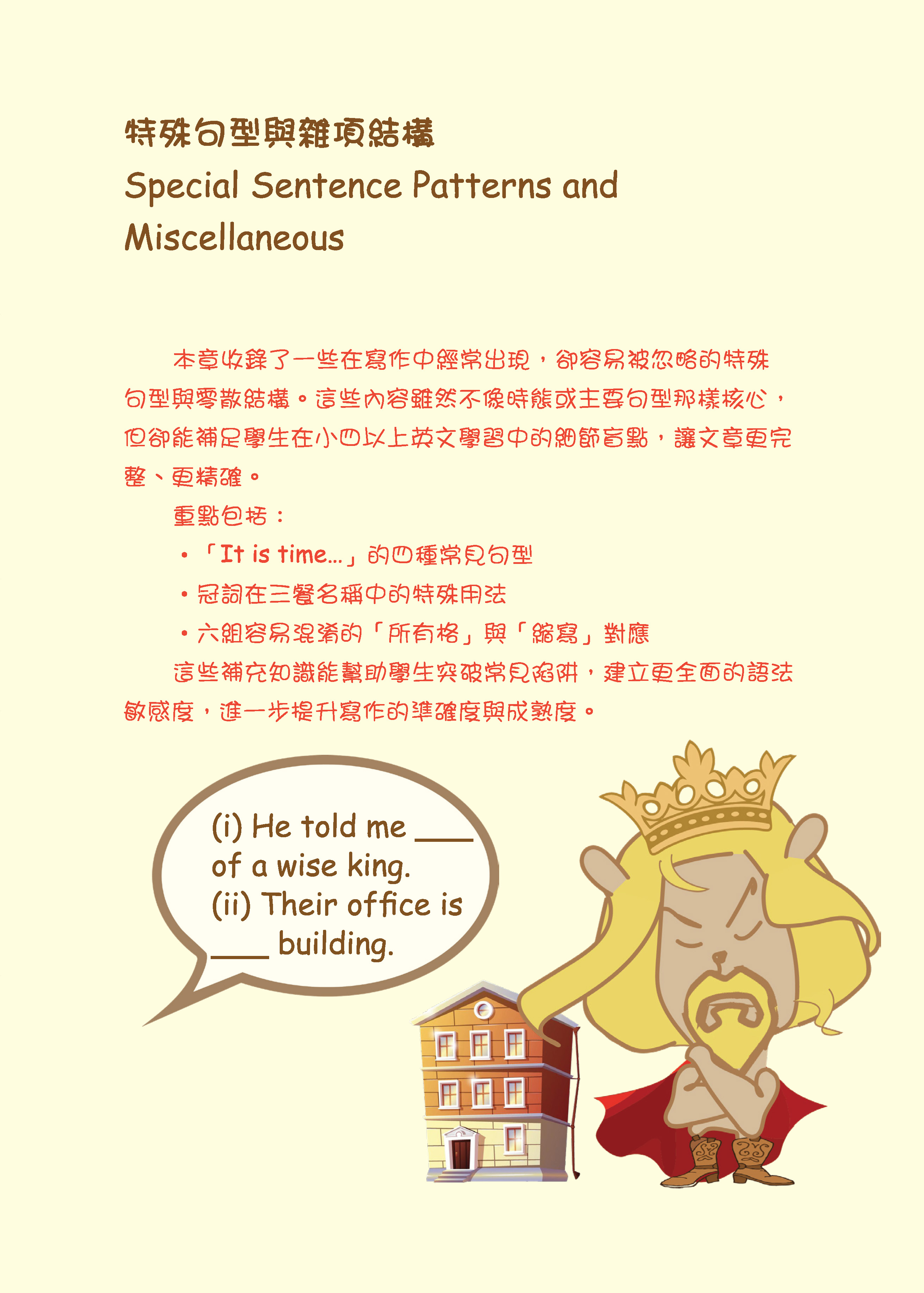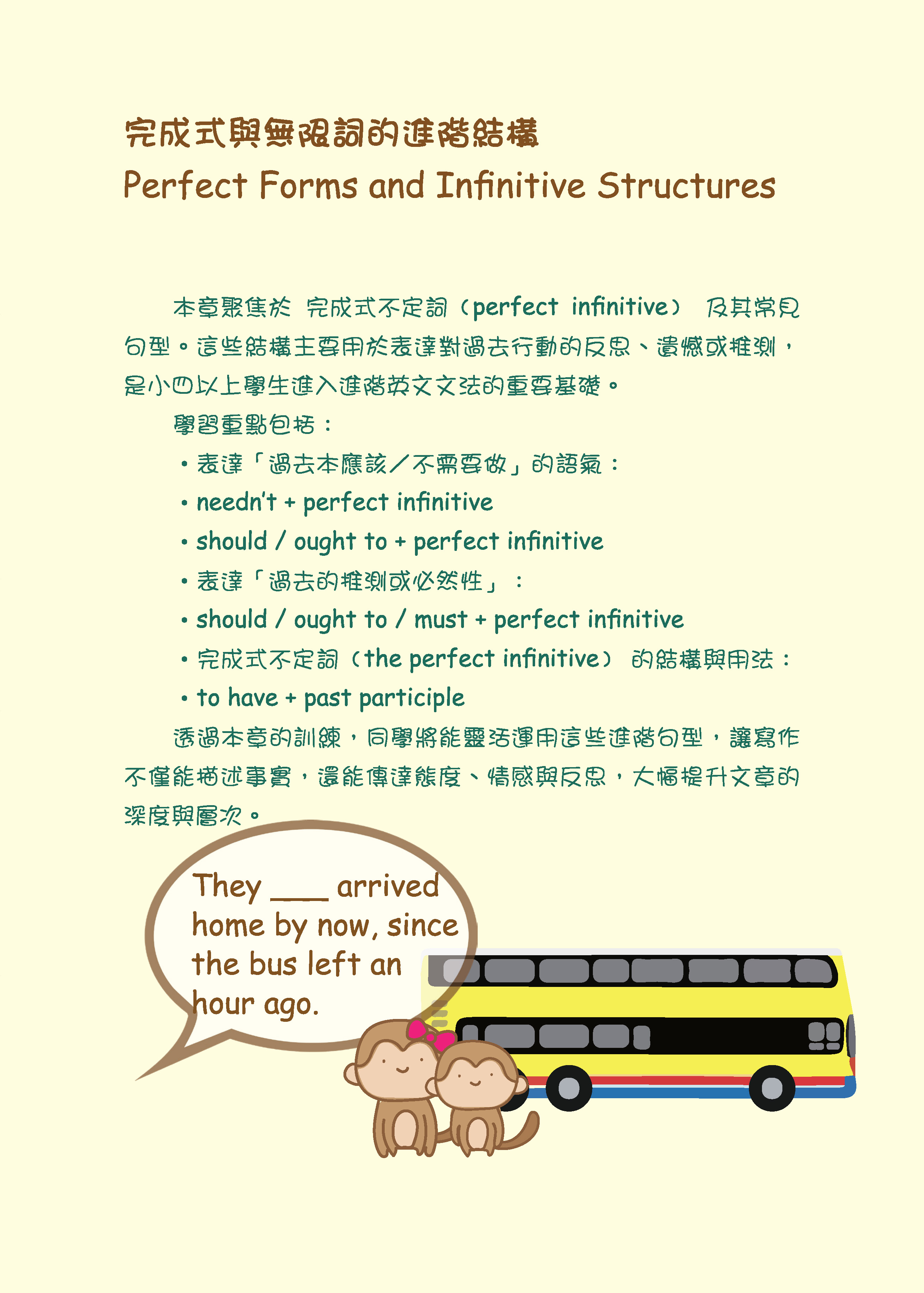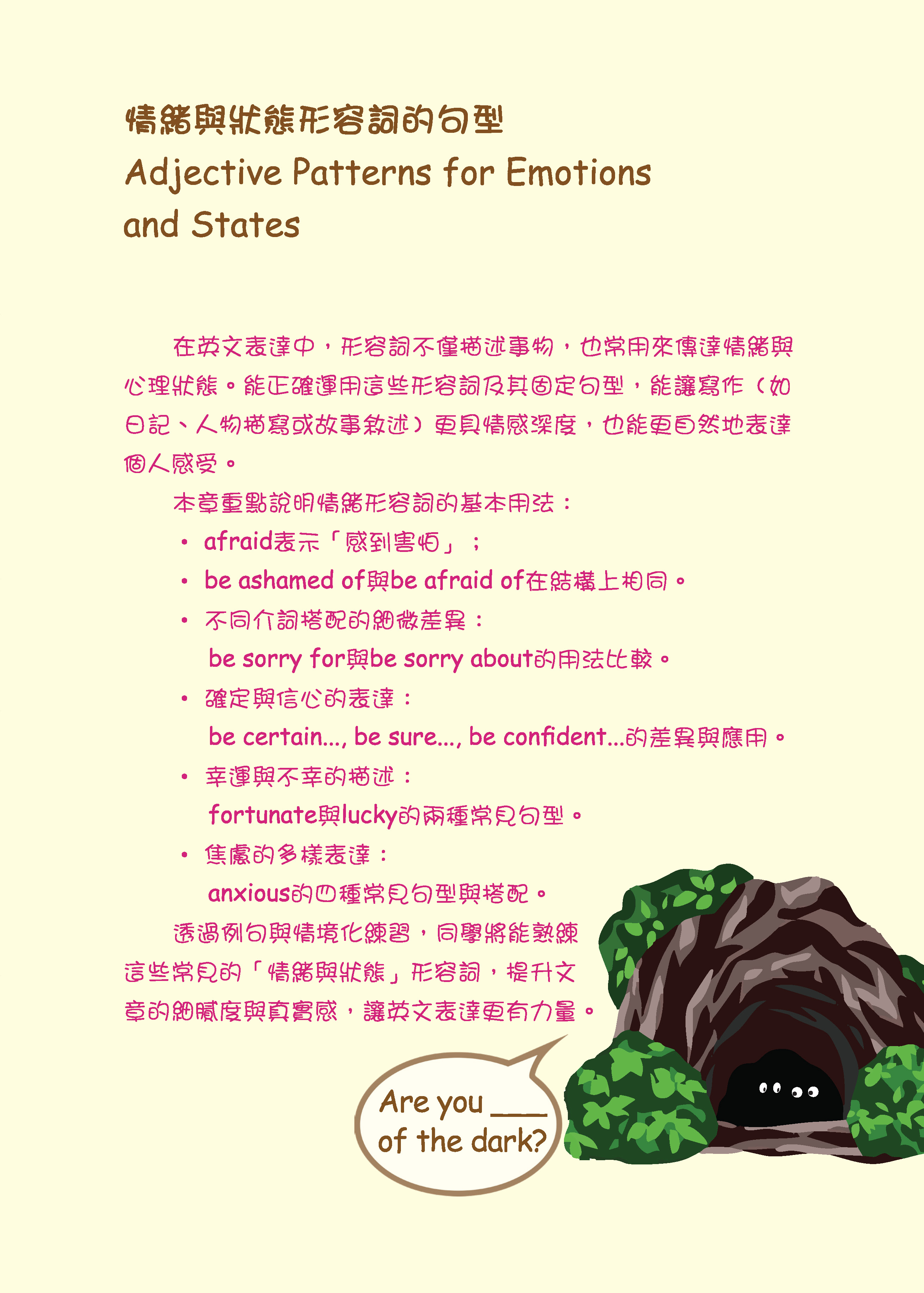 本書的特色在於:透過貼近日常生活的情境題目,讓同學能以「第一人稱」代入,實際操練時態、動詞、副詞等用法。這樣的訓練能幫助同學更清楚分辨詞性和時態,並在不同語境中正確運用詞彙,逐步建立精準的語言感。