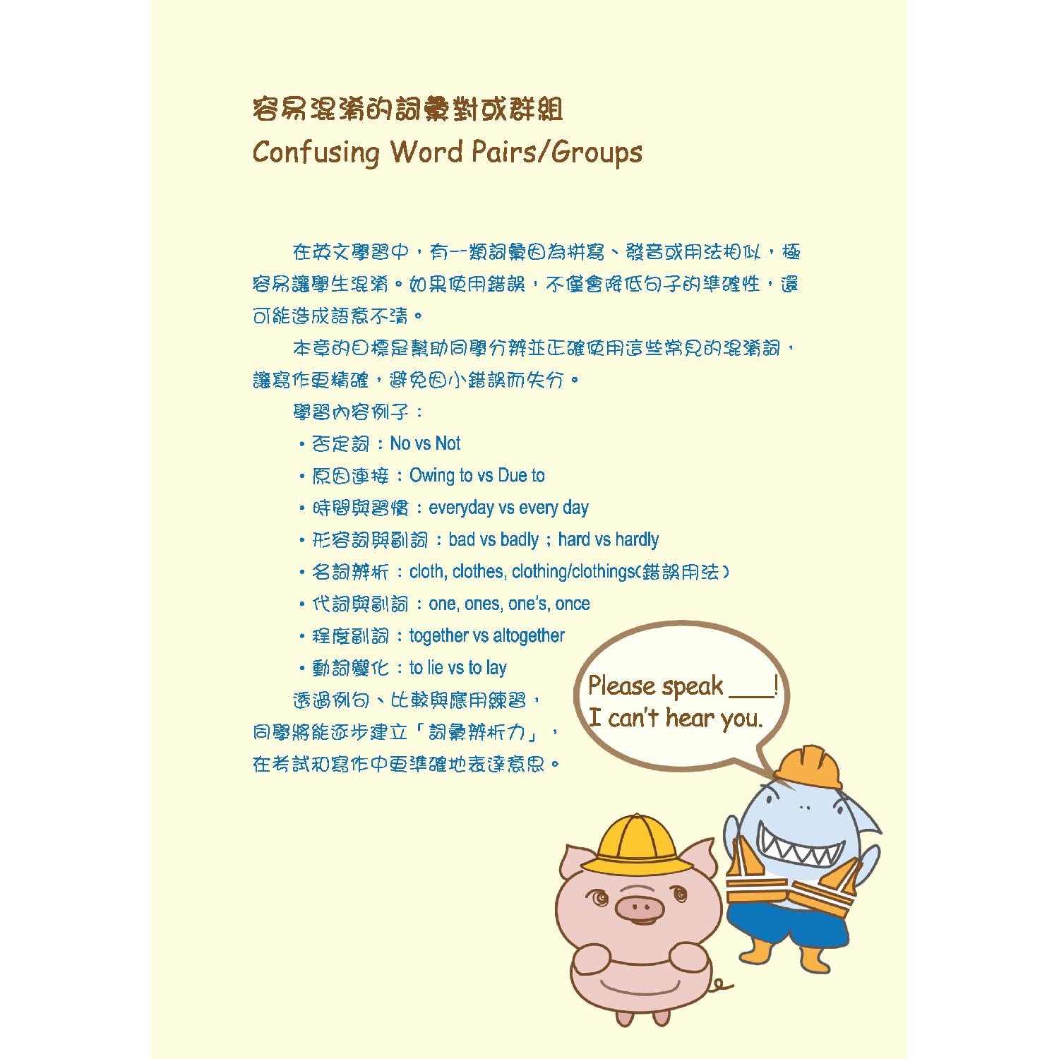 《Grammar農莊Mastering Confusing Words》專為同學設計,針對那些容易混淆的英文詞彙進行強化練習。這些詞常因為拼寫、發音或用法相似,讓學生在寫作和考試中出錯,影響表達的準確度和分數。