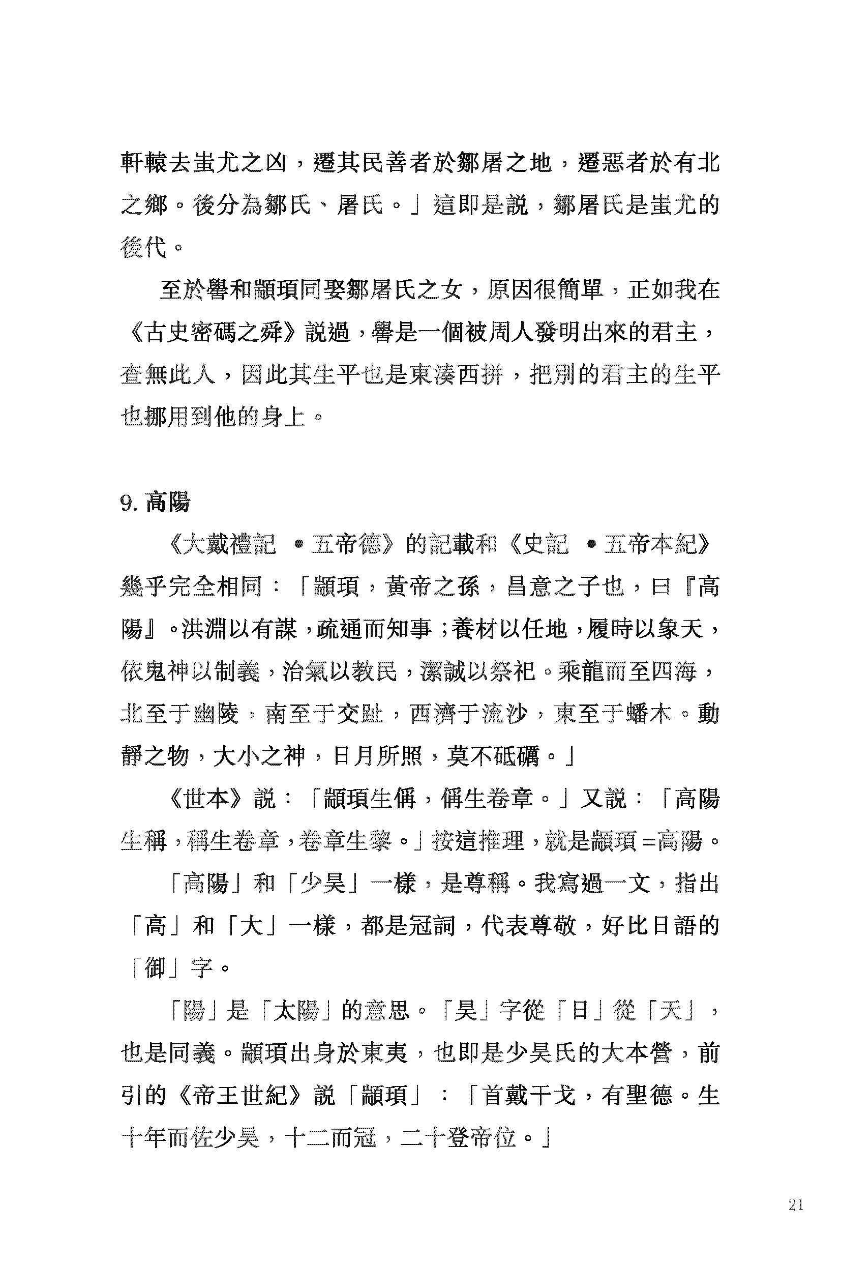 本書以「顓頊」與「祝融」為核心,展開了一幅更為宏大的史前畫卷。作者的核心論點石破天驚:上古帝王並非真實的個人,而是後世政治建構、氏族記憶與神話傳說融合的產物。書中詳盡考證,「顓頊」很可能是一個政權的共名,而非單一君主;而橫跨數千年的「祝融」,其真實身份是世襲的「火正」官職,亦即後世的國防部長。
