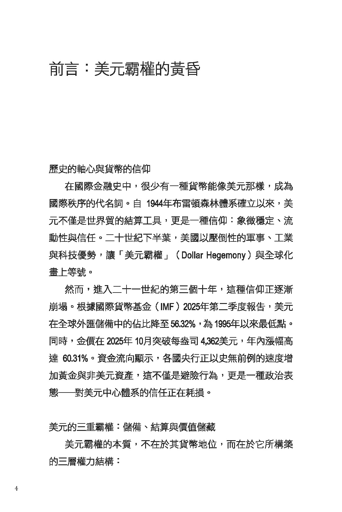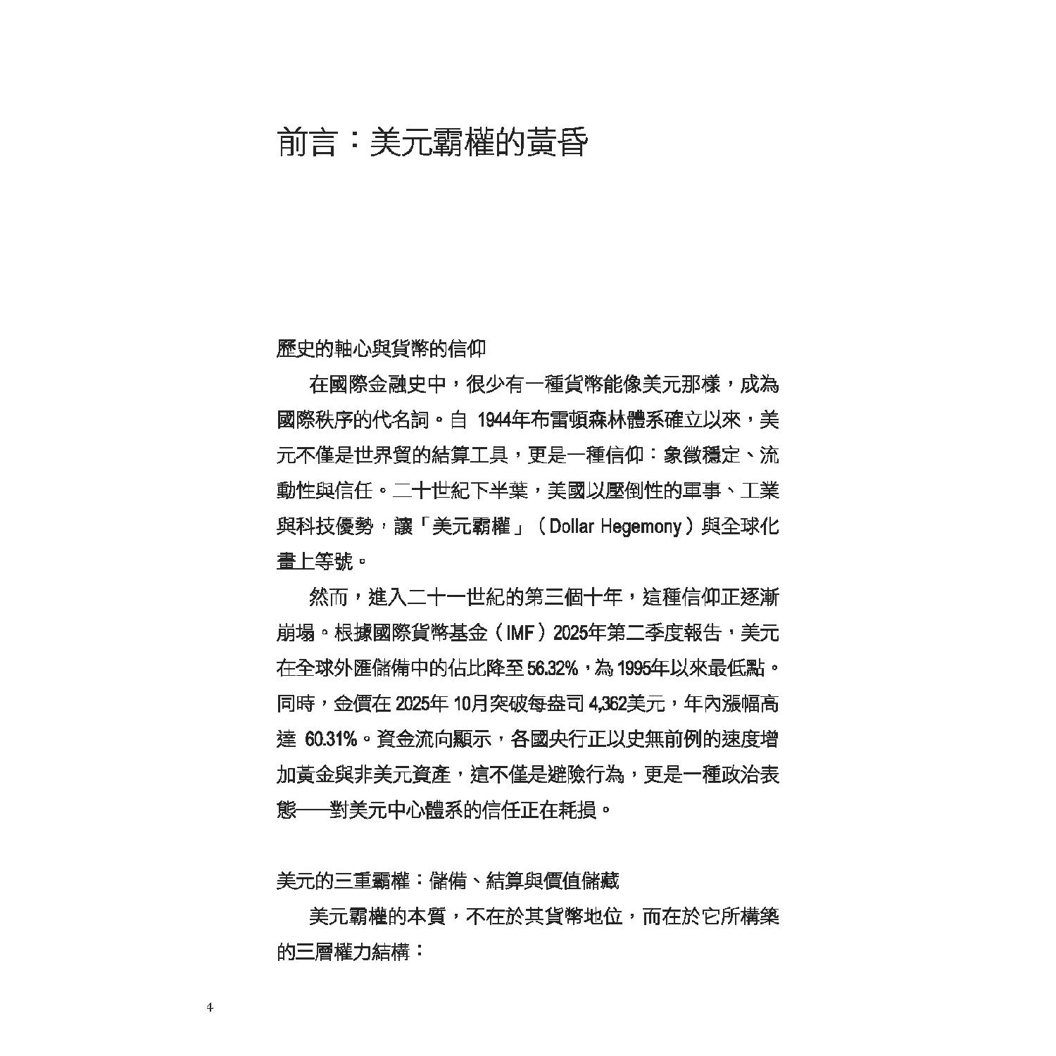 自布雷頓森林體系解體以來,美元憑藉軍事、能源與金融規則主導世界超過七十年。然而,俄烏戰爭引爆金融制裁、SWIFT 成為武器、各國央行瘋狂囤金、BRICS 結算轉向本幣……世界正快速走向「去美元化」的新紀元。