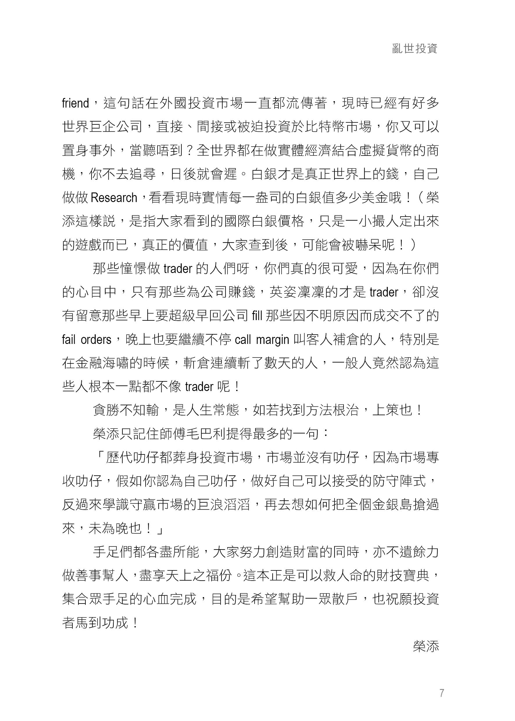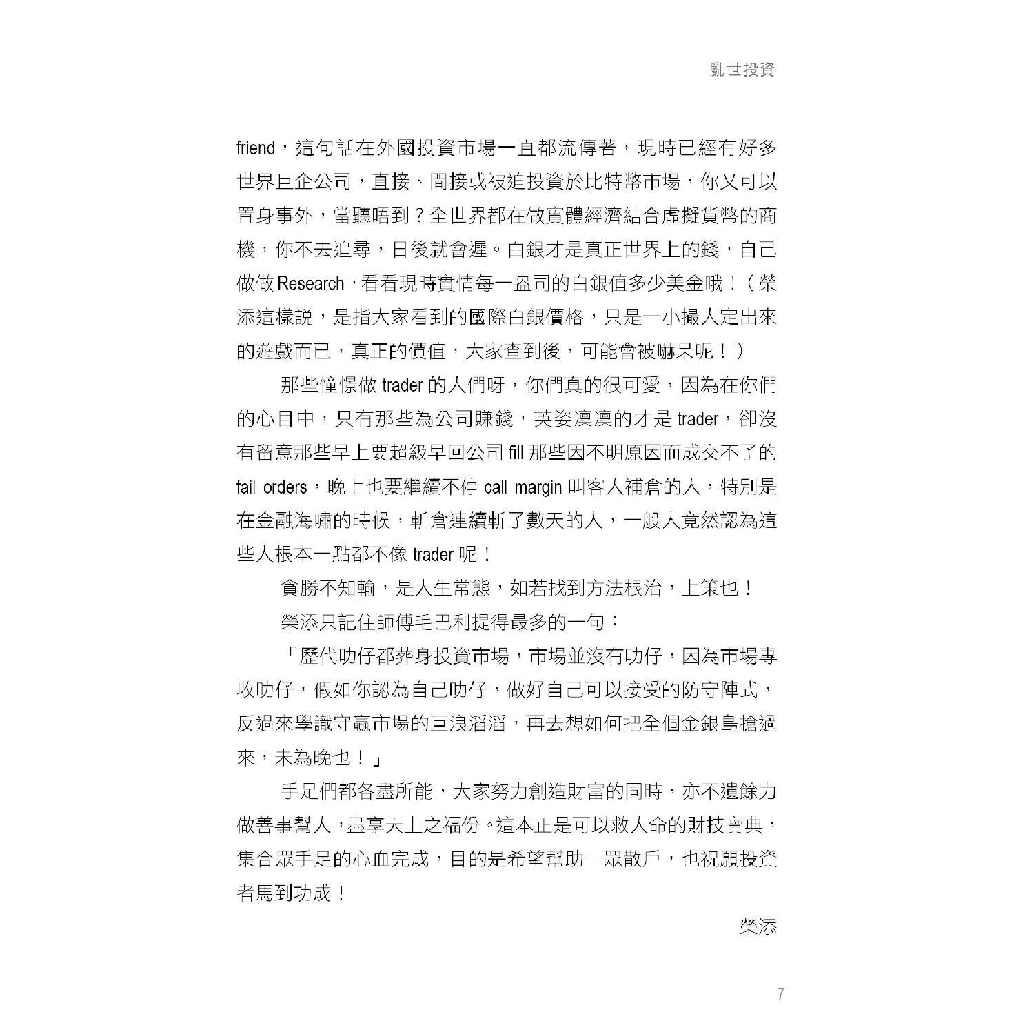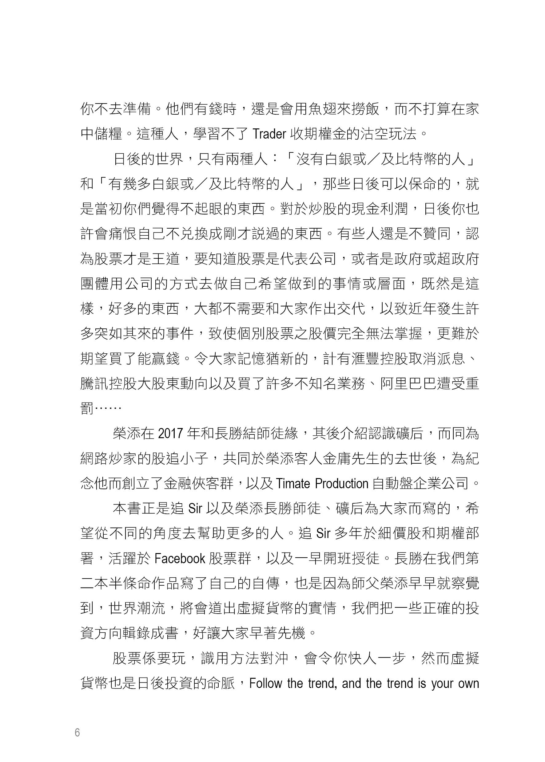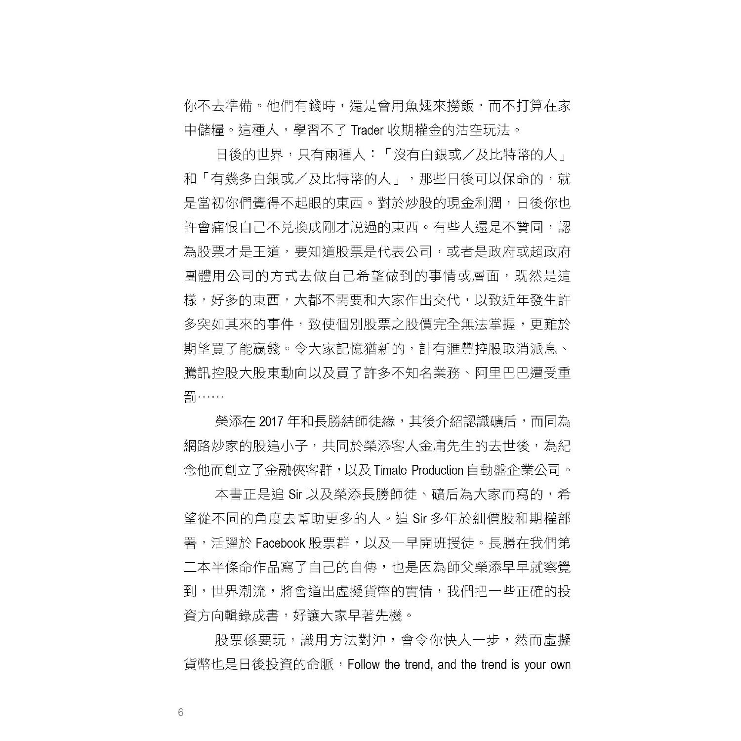 本書希望從不同的角度去幫助更多的人。追Sir多年於細價股和期權部署,活躍於Facebook 股票群,以及一早開班授徒。長勝也是因為師父榮添早早就察覺到,世界潮流,將會導出虛擬貨幣的實情。我們把一些正確的投資方向輯錄成書,好讓大家早著先機。