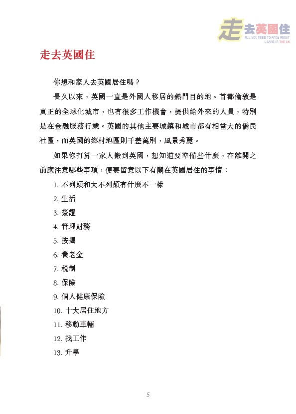 移居英國時,要開設合適的銀行帳戶,以隨時管理自己的資金。在到達英國之前,可先研究包括英國的零售銀行和手機銀行的選擇。本書也介紹了英國的退休金制度,以幫助你了解你退休時將獲得多少錢,領取退休金的年齡以及需要哪些供款。在英國無論是工作或是已經退休,通常需要納稅。徵稅的稅率取決於你的稅收居民身份和個人情況。