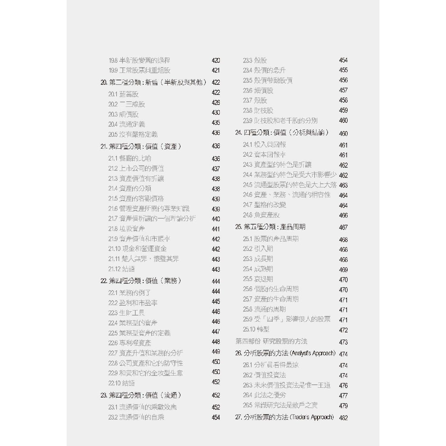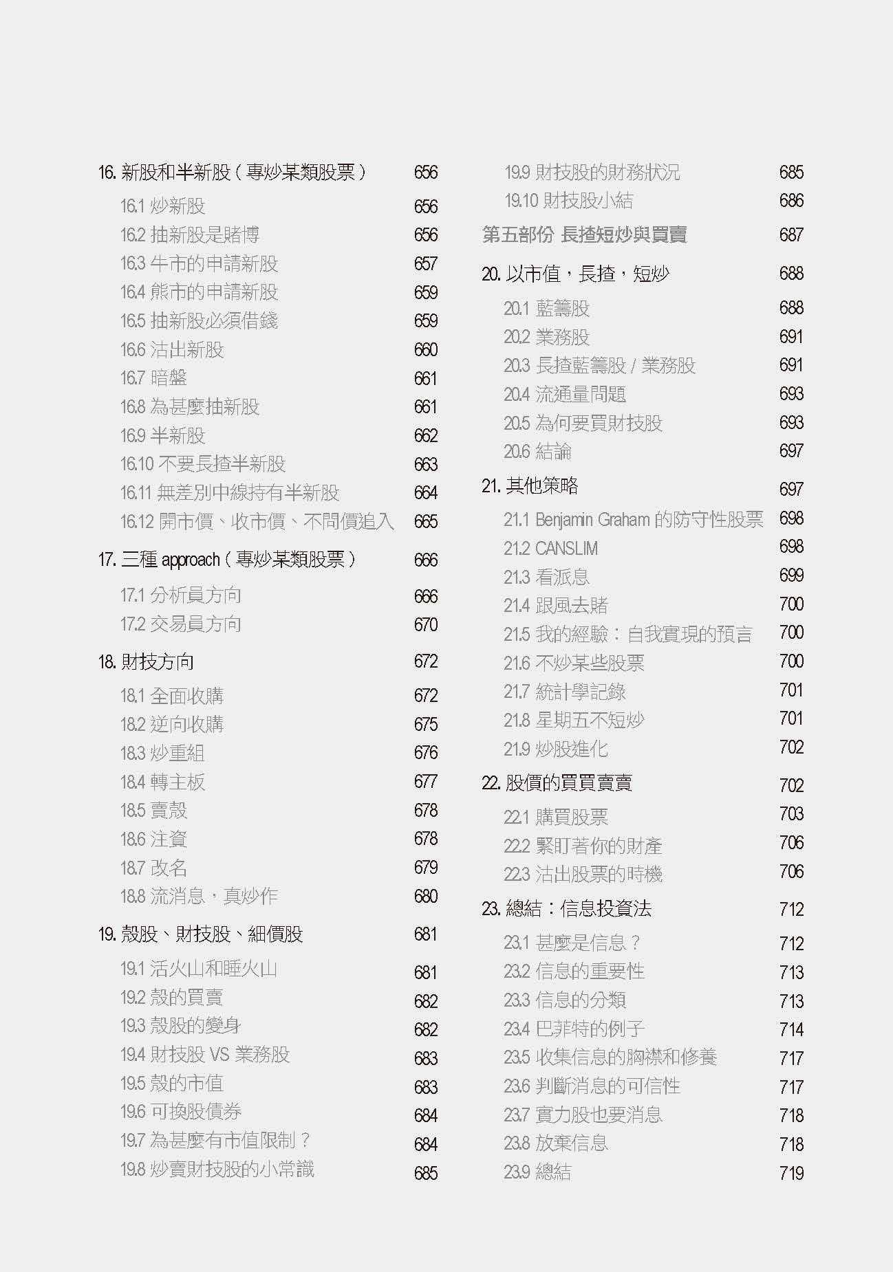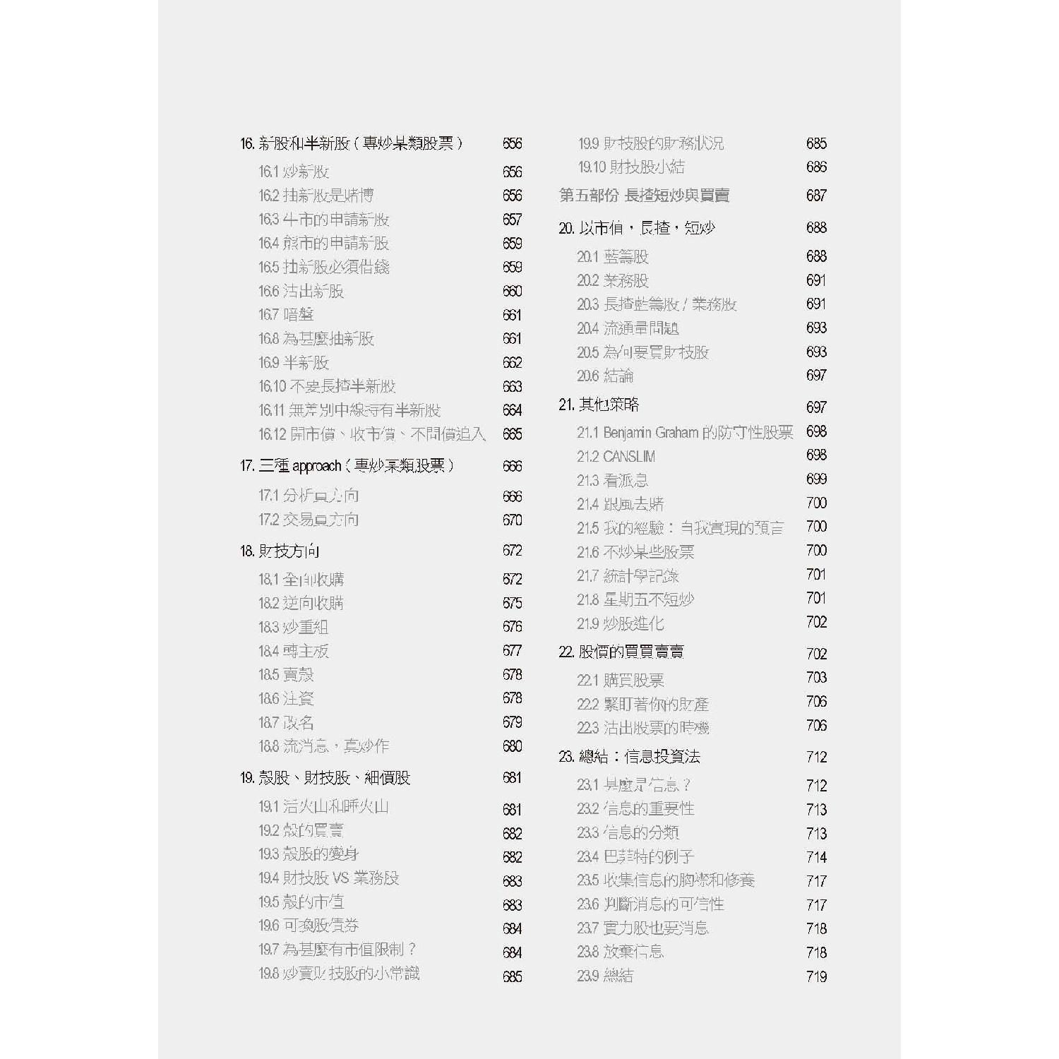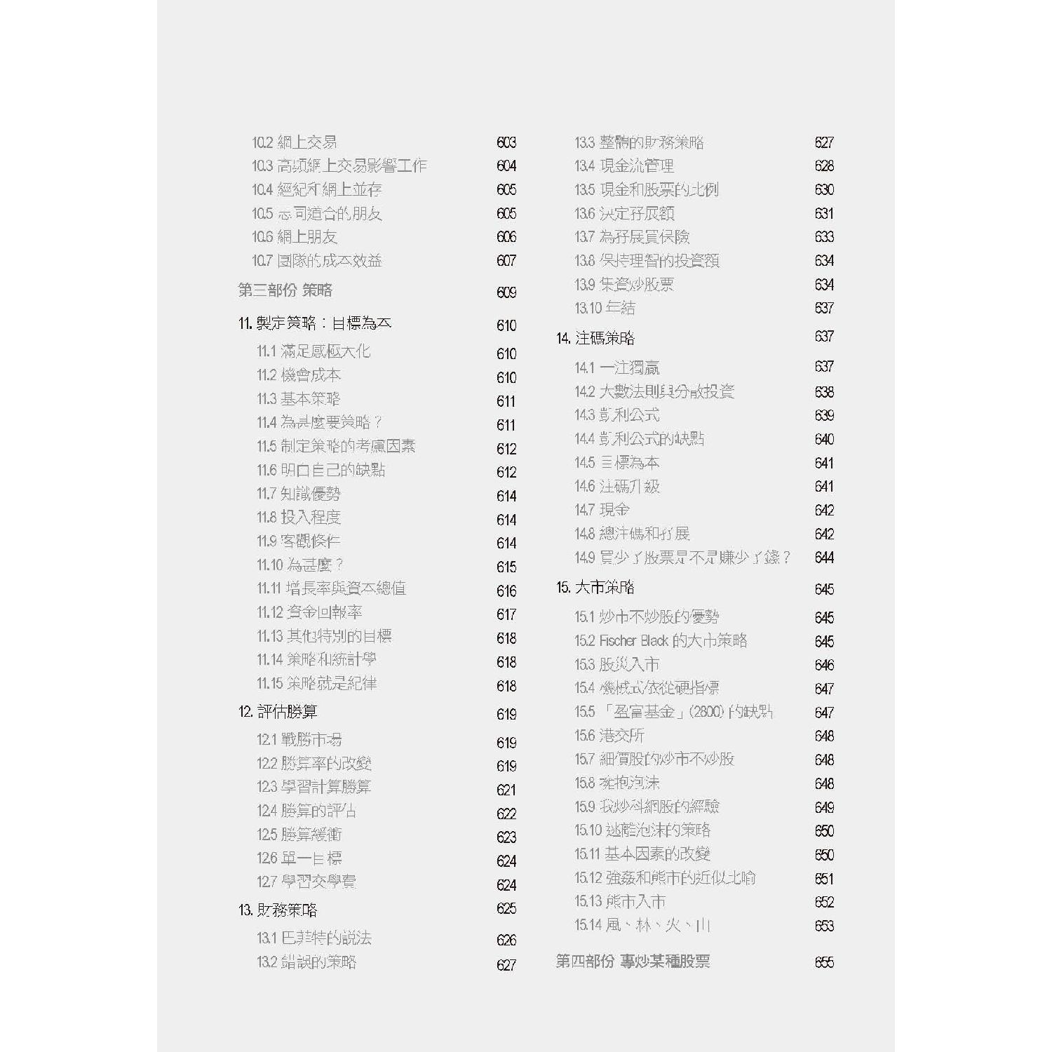 第三個部份為炒股實戰,講的是投資股市的實務,與第二部份的理論相輔相成,密不可分。本部分融合更多更新的炒股知識,尤其關於買賣股票的成本、風險、回報和值博率、時間值、證券商的專業、投資者分類、策略制定、勝算評估、財務/注碼 / 大市策略、長揸短炒分析等等方面,可謂鉅細無遺,推陳出新。