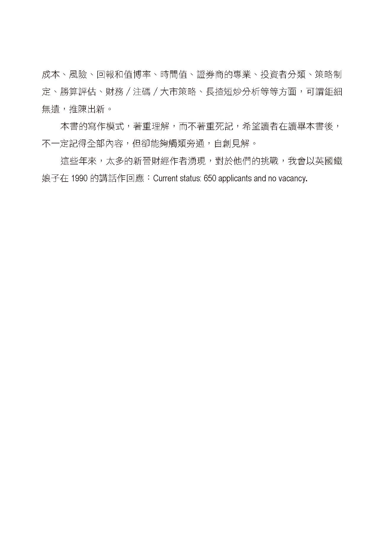 這些年來,太多的新晉財經作者湧現,對於他們的挑戰,作者以英國鐡娘子在1990的講話作回應:Current status: 650 applicants and no vacancy.