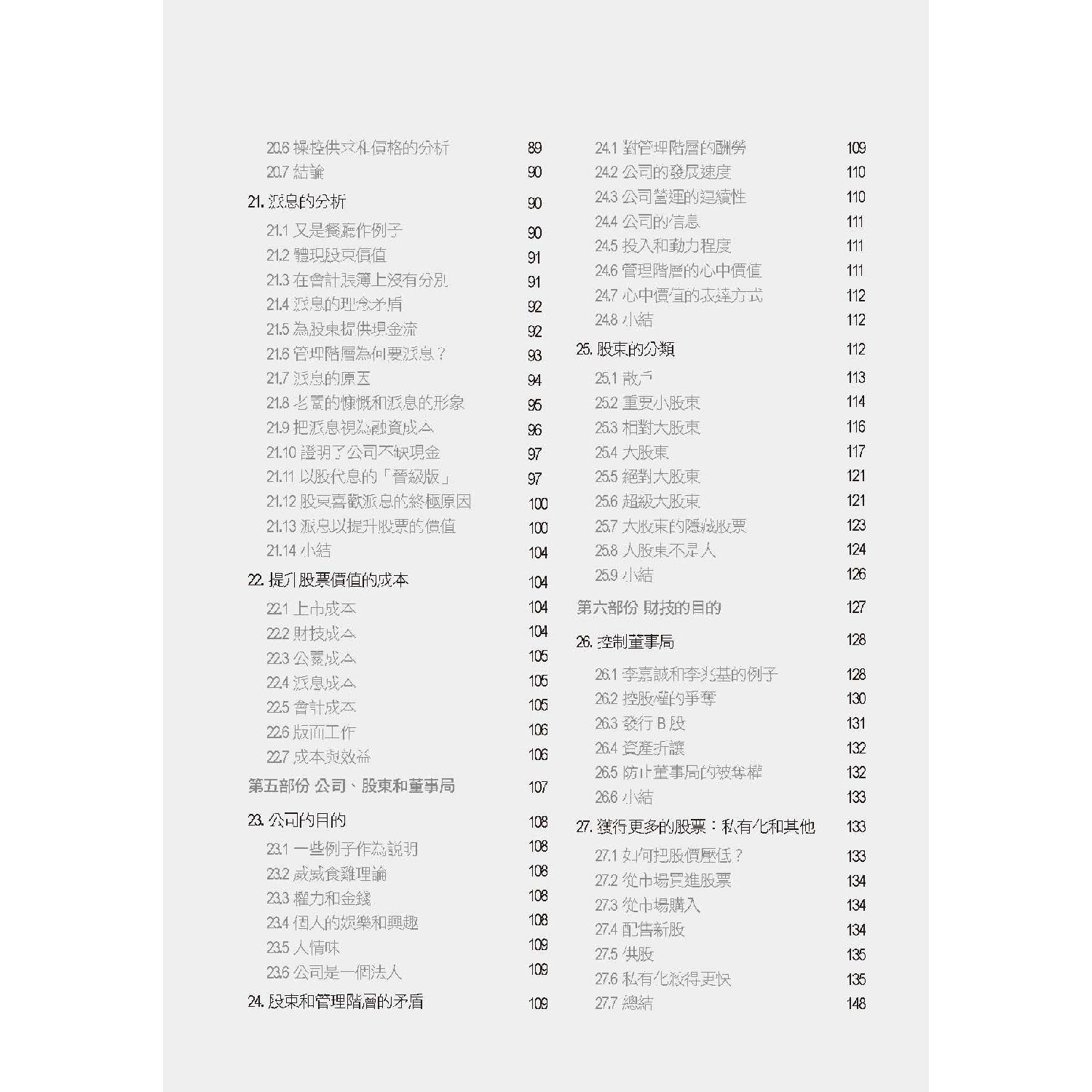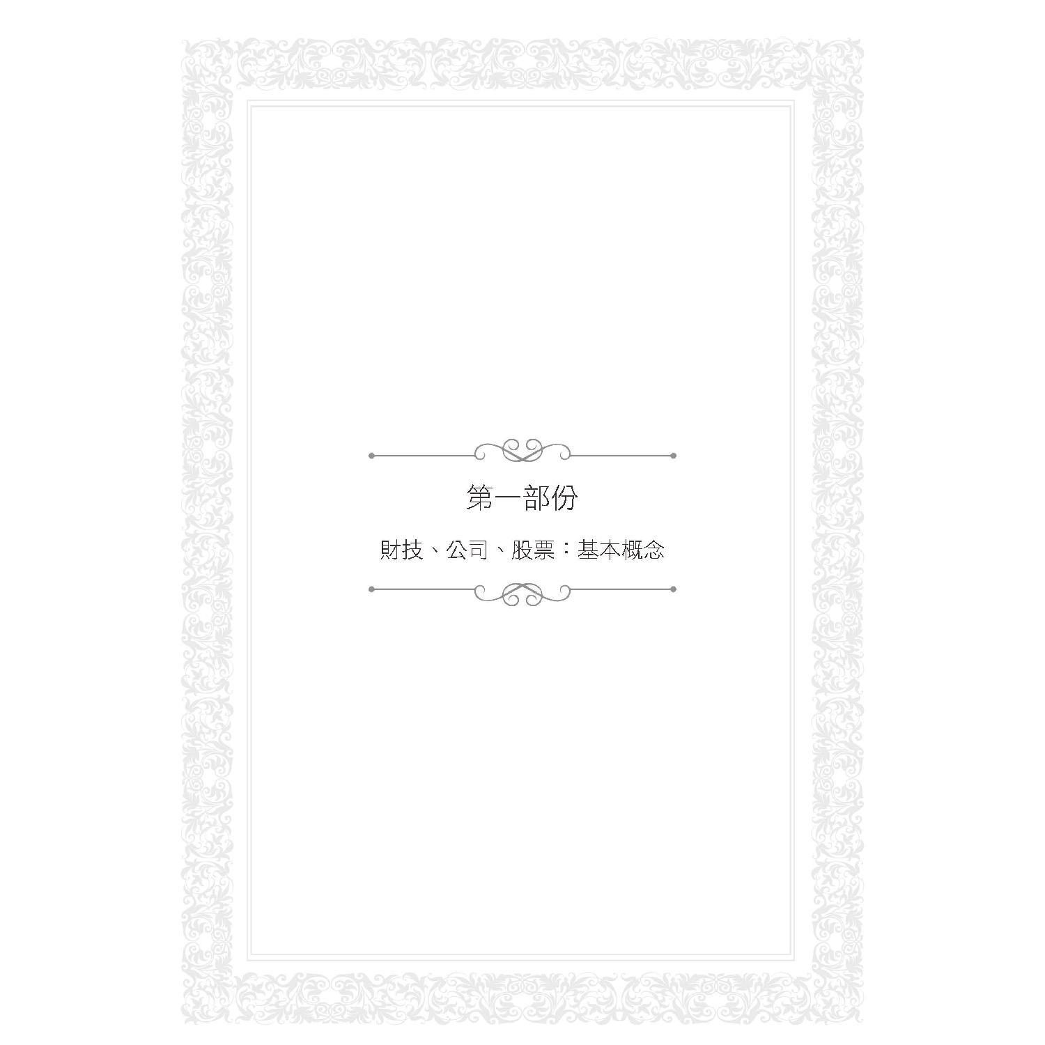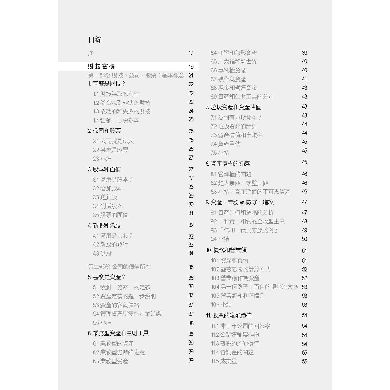 第一個部份是財技密碼,內容是有關公司財技的基本知識,以及操作的過程;前者的內容,其實首尾呼應,必須通曉了下篇某部份,才能夠貫徹理解,因此,建議初學讀者須得把本部份通讀兩遍,才可融會貫通,更好地理解整套財技的概念。