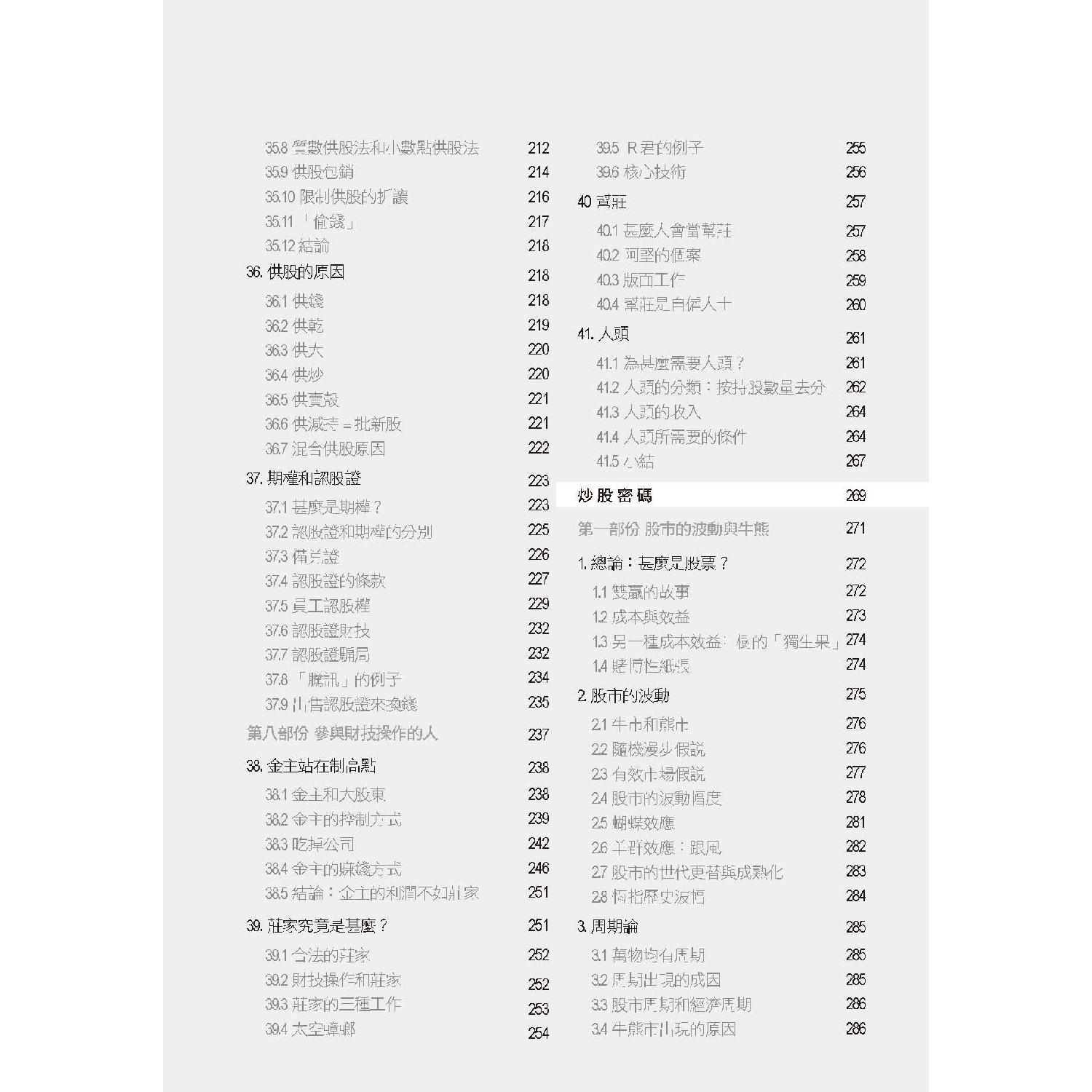 第二個部份是炒股密碼,講的是理論;作者兼收並蓄,集各家知識,成一家之言,詳細解說由其首先提出的財技炒股法,年輕一代股民可說無不受到這方法的影響。作者自評此部份內容結構硬淨,理論架構如鋼筋般堅實,布局和推理無懈可擊。