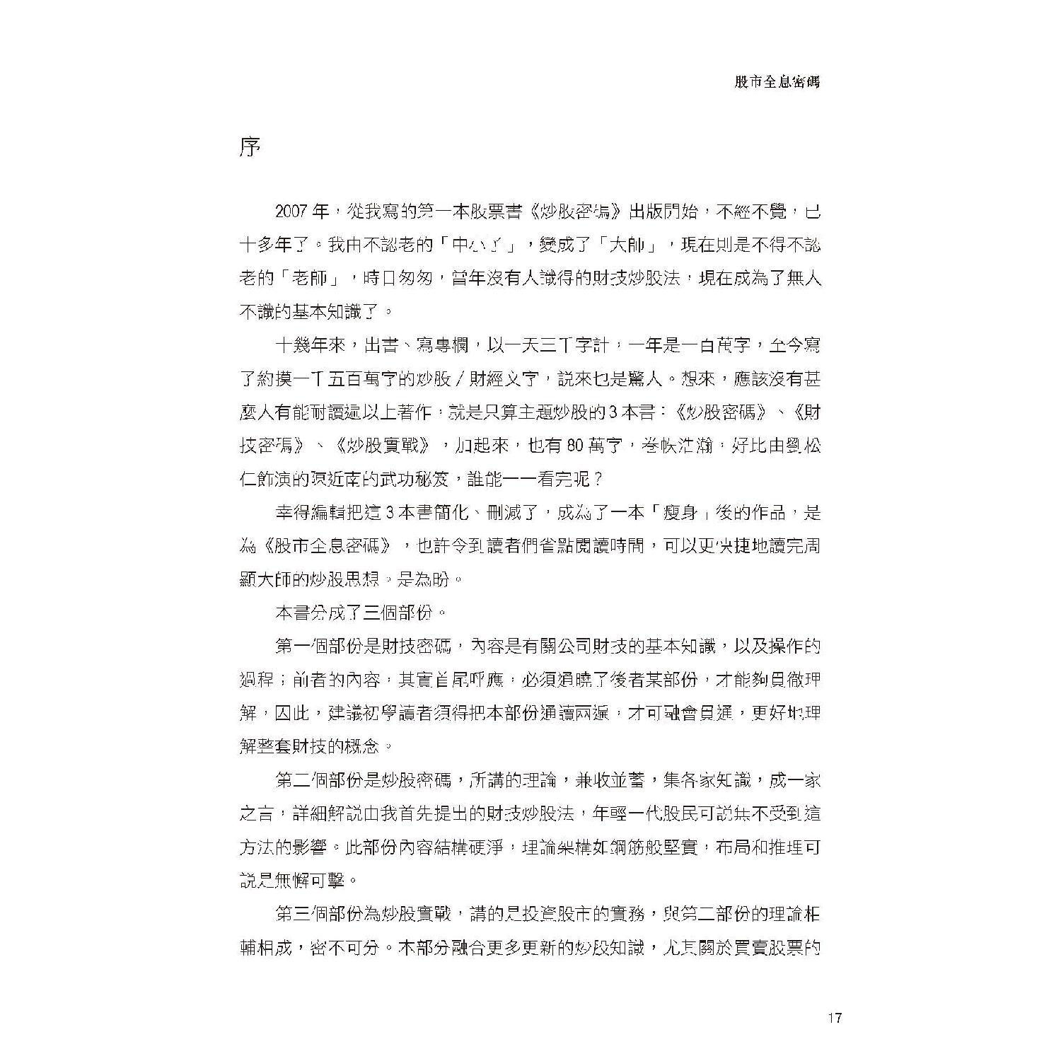幸得編輯把這3本書簡化、刪減了,成為了一本「瘦身」的作品,是為《股市全息密碼》,也許令到讀者省點閱讀時間,可以更快捷地讀完周顯大師的炒股思想。是為序。」── 周顯