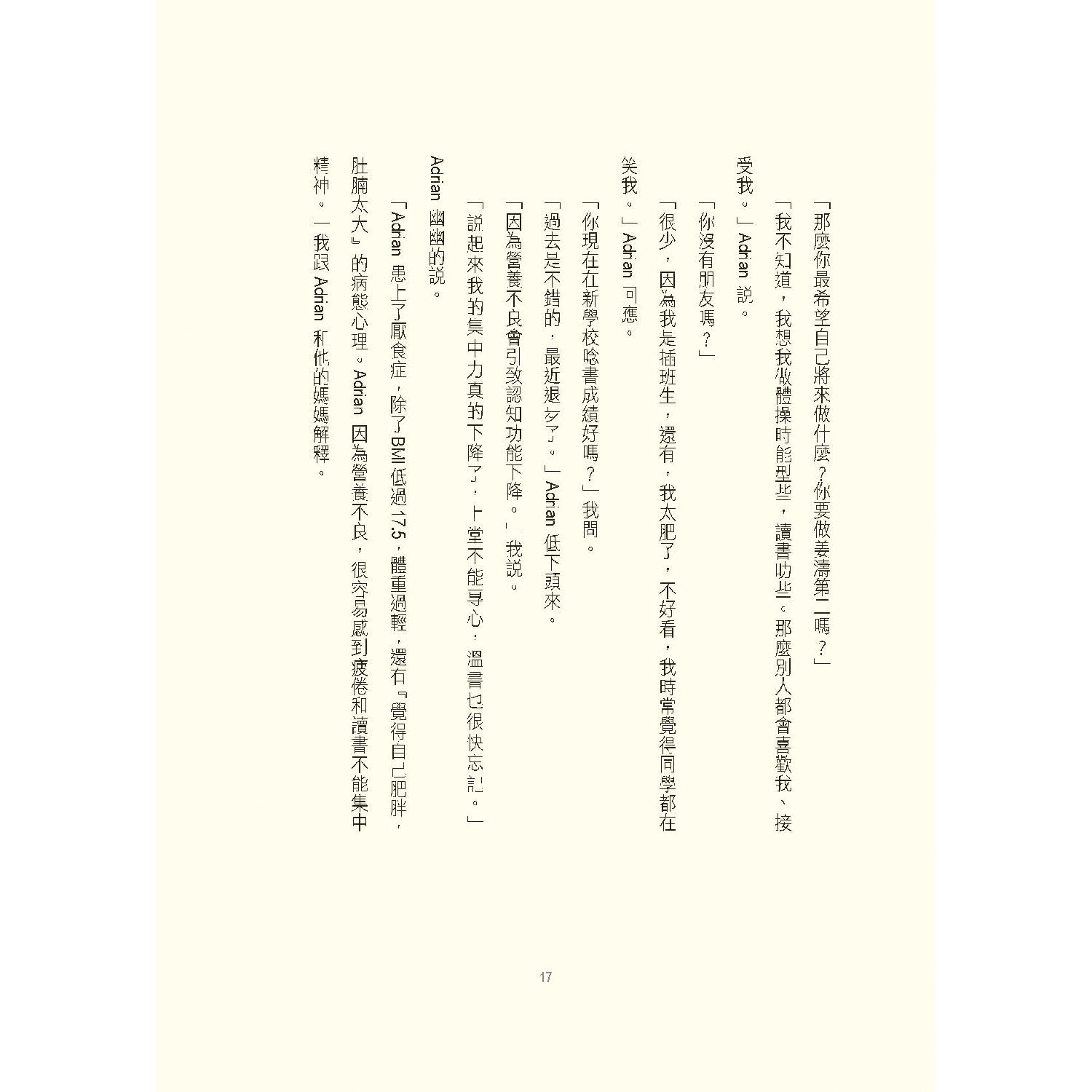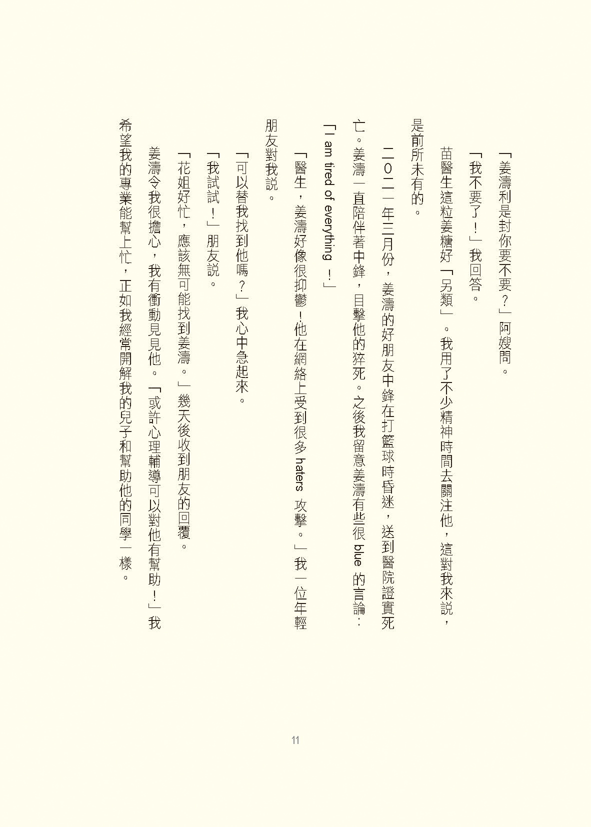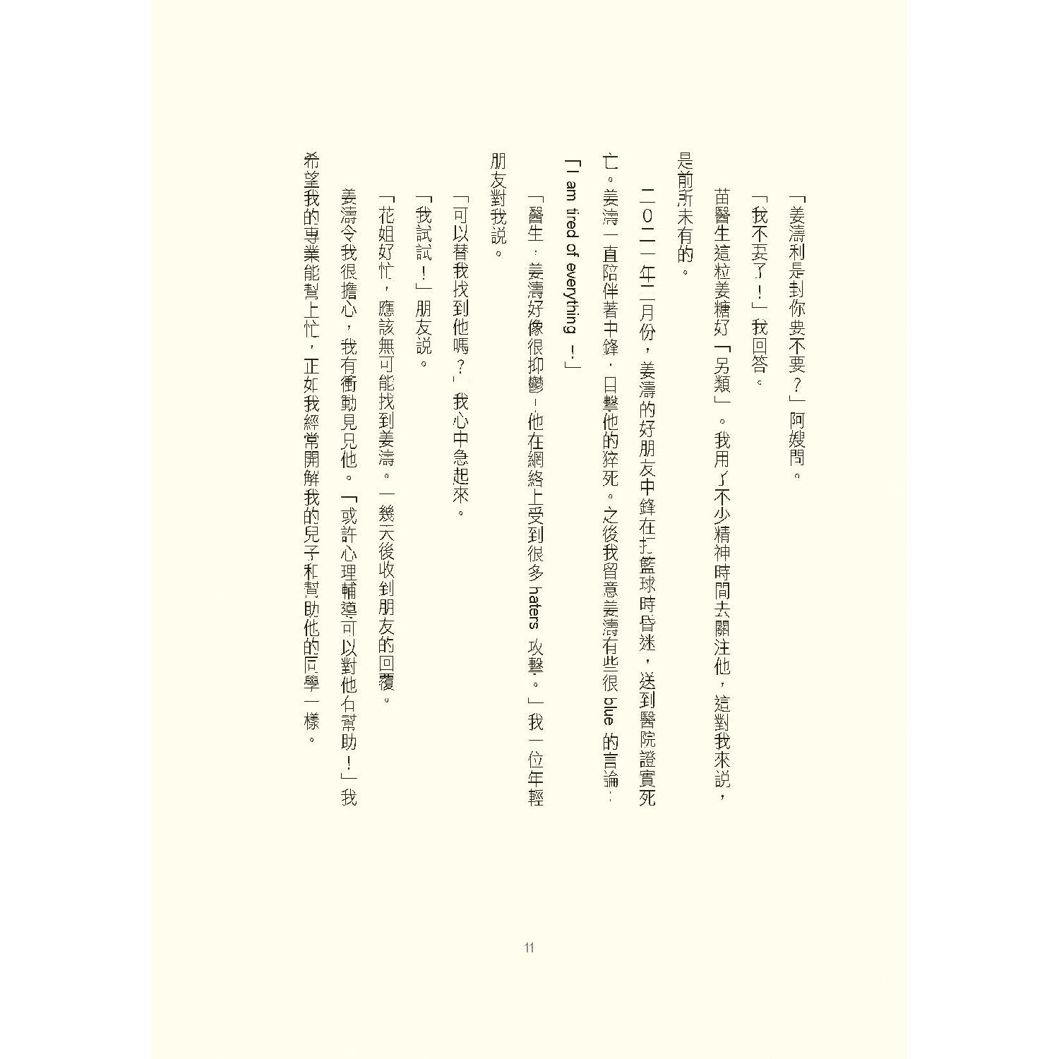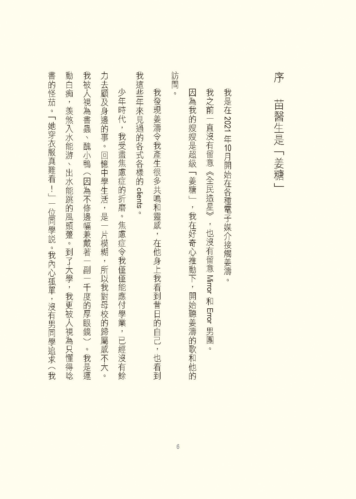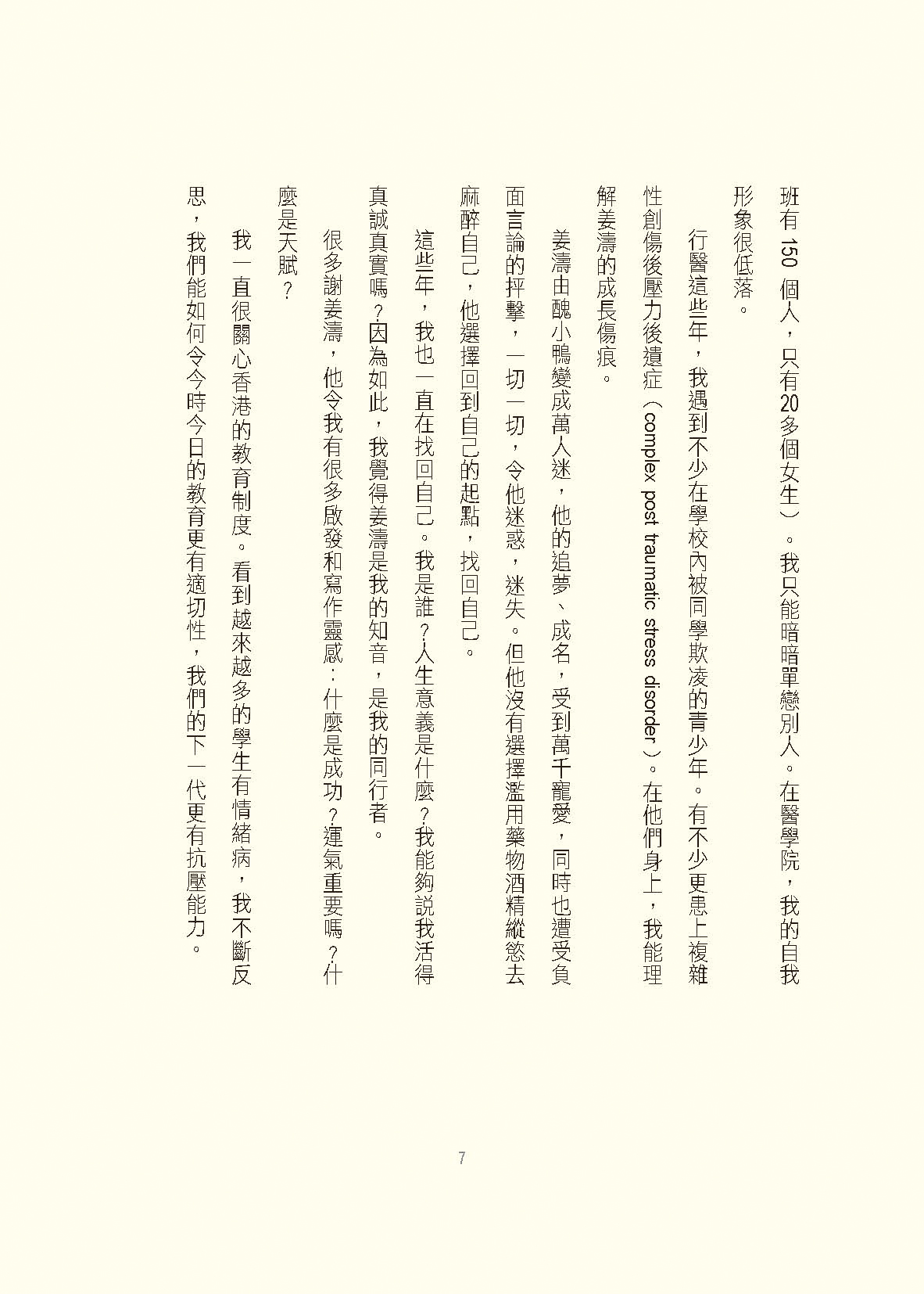 行醫這些年,我遇到不少在學校內被同學欺凌的青少年。有不少更患上複雜性創傷後壓力後遺症(complex post traumatic stress disorder)。在他們身上,我能理解姜濤的成長傷痕。姜濤由醜小鴨變成萬人迷,他的追夢、成名,受到萬千寵愛,同時也遭受負面言論的抨擊⋯⋯一切一切,令他迷惑,迷失。