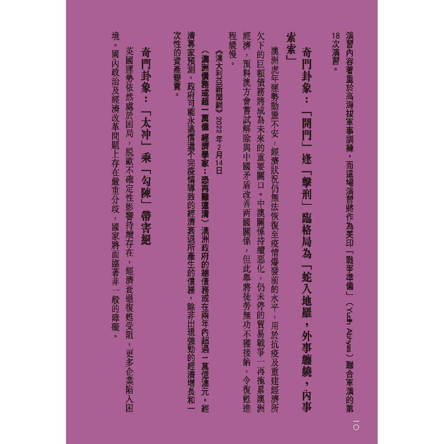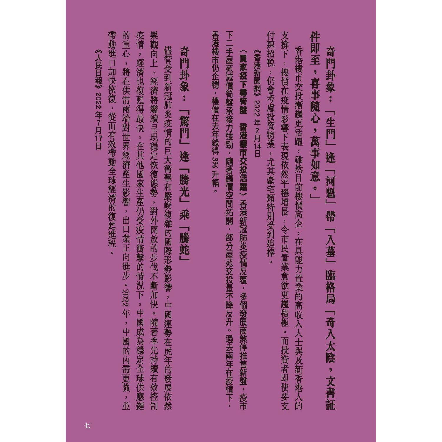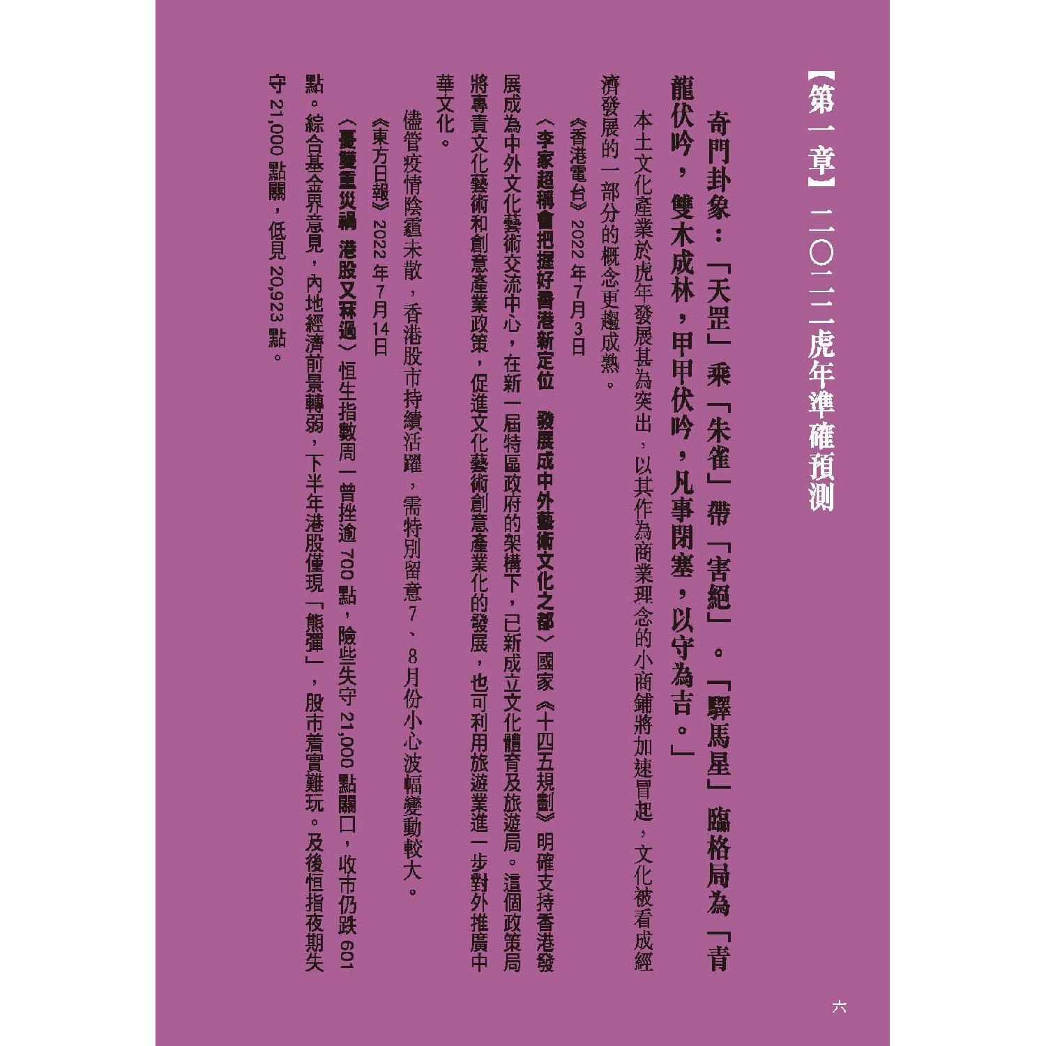 流年運程及玄學文章、訪問、視頻散見於香港多間報章雜誌包括:Cosmopolitan、Bazaar、 Elle、Jessica、Marie Claire、東方新地、東周刊、Ming’s 明周、明報、壹週plus、She.com、TVB周刊、新Monday、Fashion & Beauty、Figaro、經濟日報、東方日報、蘋果日報、星島日報、South China Morning Post、美聯社、成報、香港0、港生活1、太陽報、都市日報、晴報