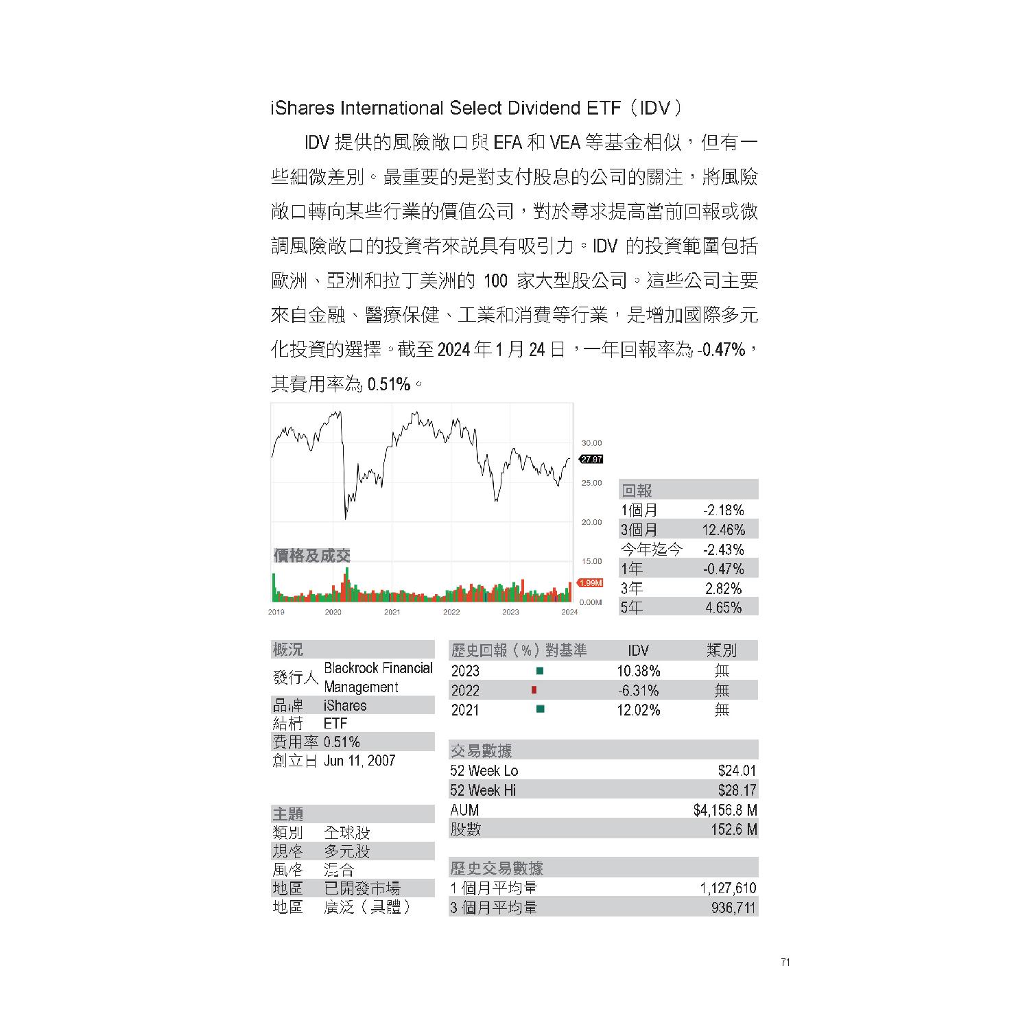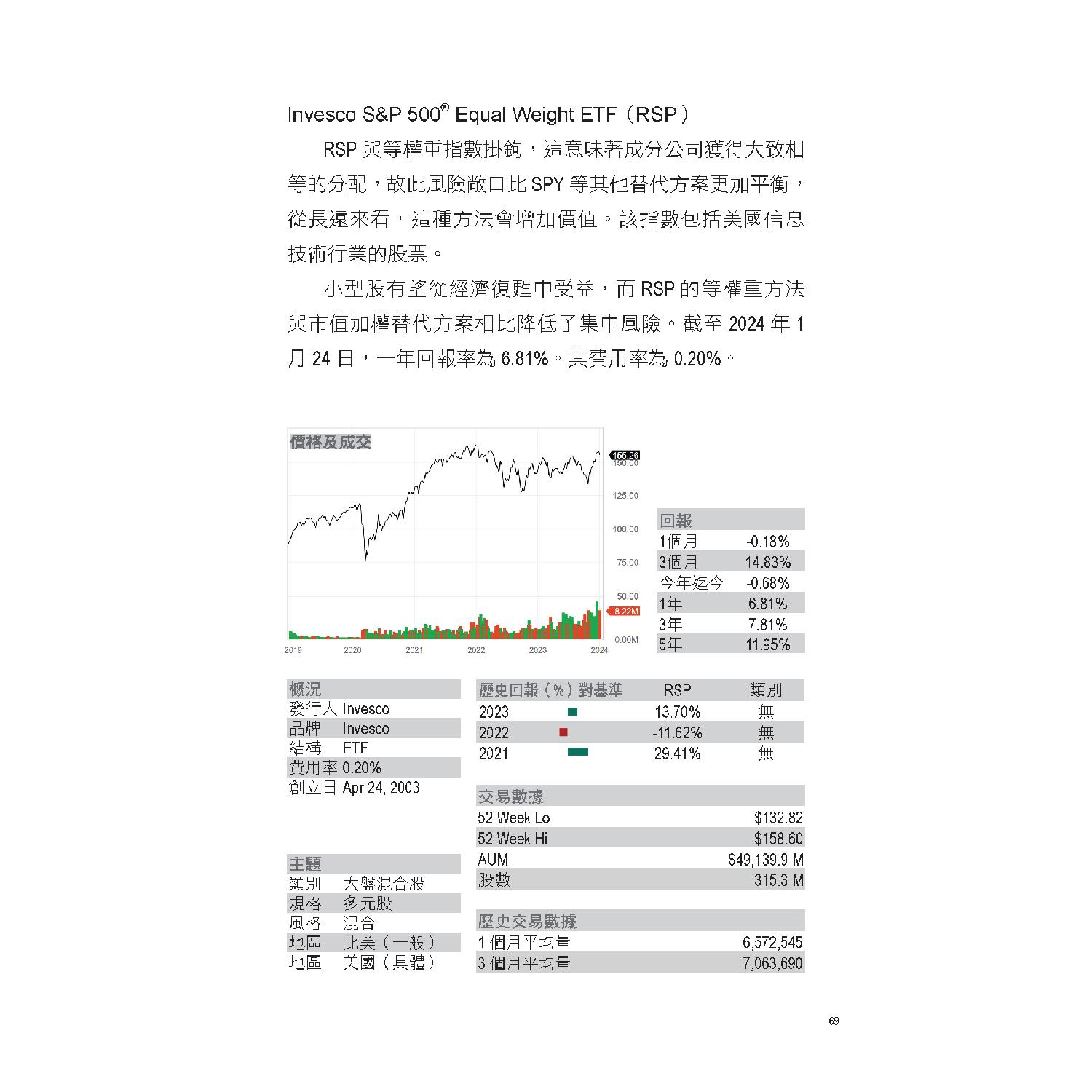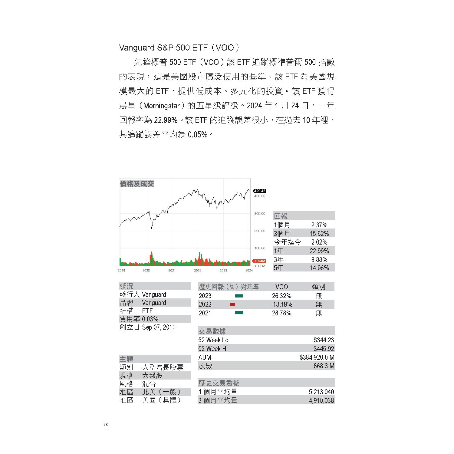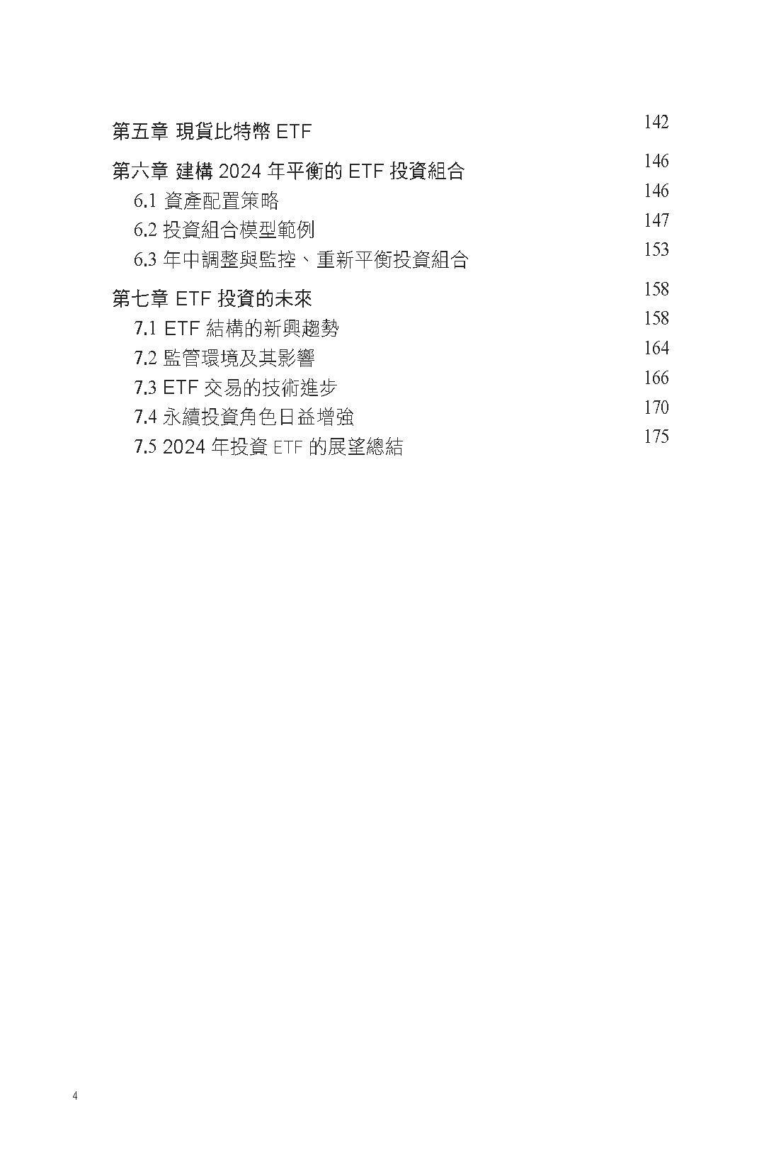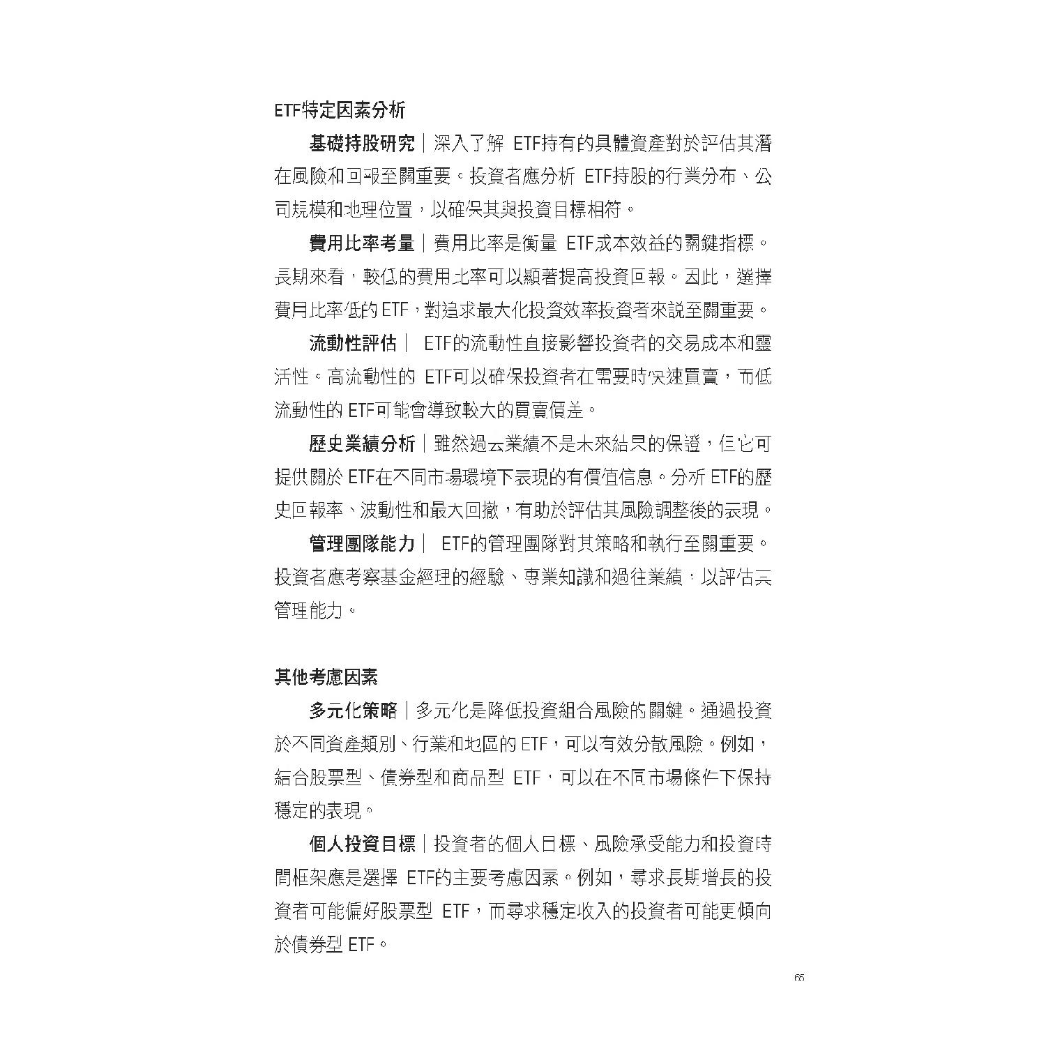 在投資策略部分,本書提供了多種ETF投資組合模型,包括平衡型、保守型和積極型,並根據不同的風險偏好和投資目標給出具體的配置建議。此外,書中還詳細介紹了如何進行年中投資組合的調整和重新平衡,以應對市場的波動和變化。