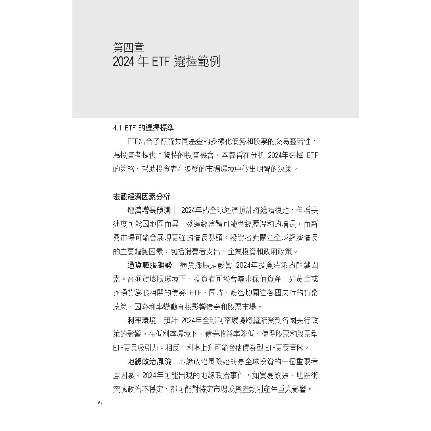 《2024全球經濟與ETF投資》是一本針對投資者的實用指南,旨在提供深入的市場分析和策略建議,幫助讀者在2024年的多變經濟環境中做出明智的投資決策。本書涵蓋了從全球經濟趨勢、地緣政治風險,到科技創新和環境政策等多方面的內容,並針對交易所交易基金(ETF)作為投資工具的實際應用。