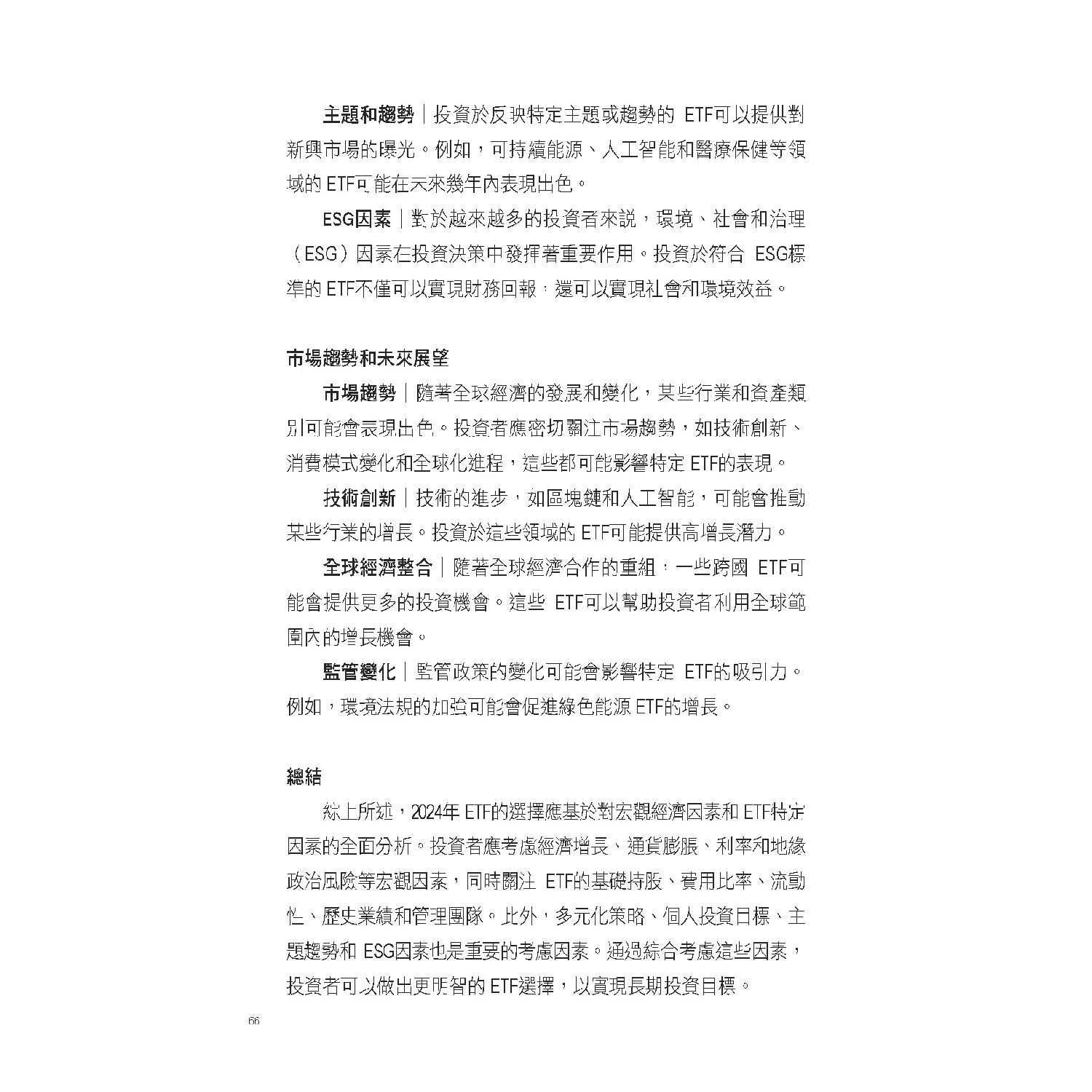 書中對2024年的全球經濟進行了分析,包括疫情後的經濟復甦情況、不均衡的全球增長、通脹壓力、以及地緣政治和貿易政策等因素如何影響市場。書中還深入探討了科技創新和數字化轉型對經濟的驅動作用,以及環境政策和可持續發展趨勢對投資的影響。