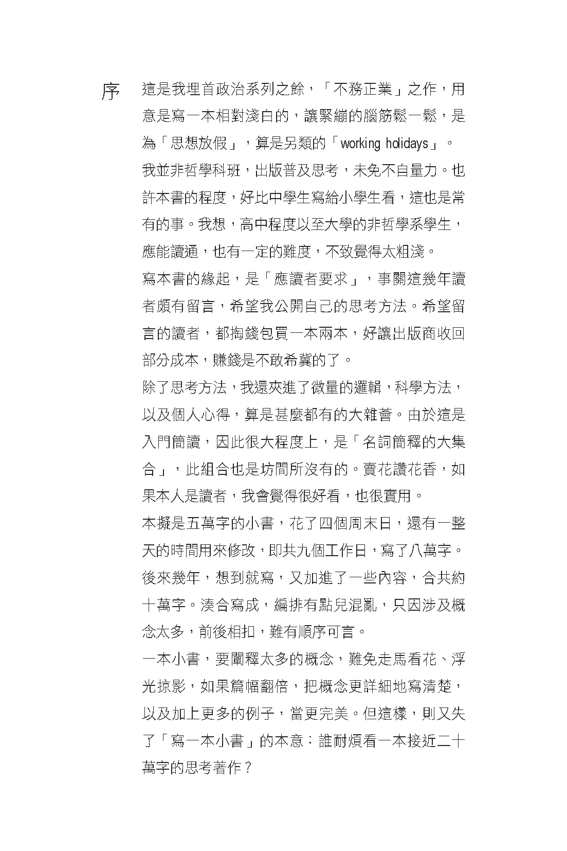 寫本書的緣起,是「應讀者要求」,事關這幾年讀者頗有留言,希望我公開自己的思考方法。希望留言的讀者,都掏錢包買一本兩本。