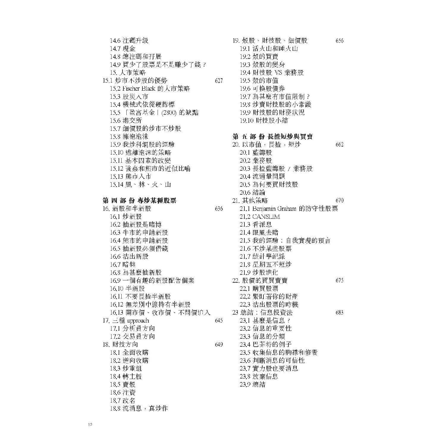 「財技炒股法」是古已有之的炒股形式,多少年來,一直被股市中人應用。本書是第一本把這個行內「秘密」整理寫成的專書,內容兼收並蓄,廣集各家的知識,成一家之言。內文的例子,有新有舊,層層累積,舊的個案,事雖不再新鮮,但基於例子只是用來說明理論,其是新抑或是舊,非但無傷大雅,反而更可令讀者警惕:「哦,原來以前曾經用過這一招,以後可要小心了。」