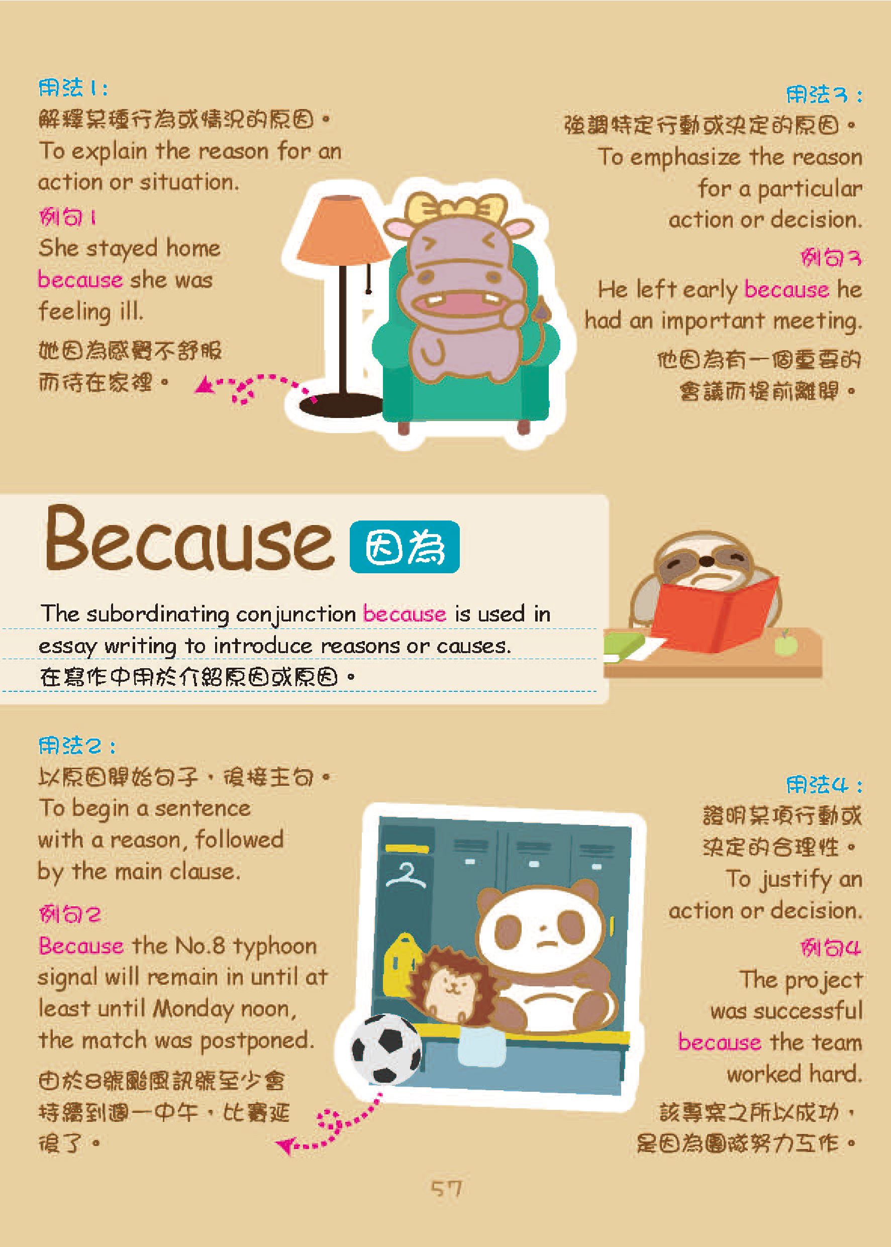 使用連接詞:I stayed at home because it was raining.(因為下雨,我待在家裡。)