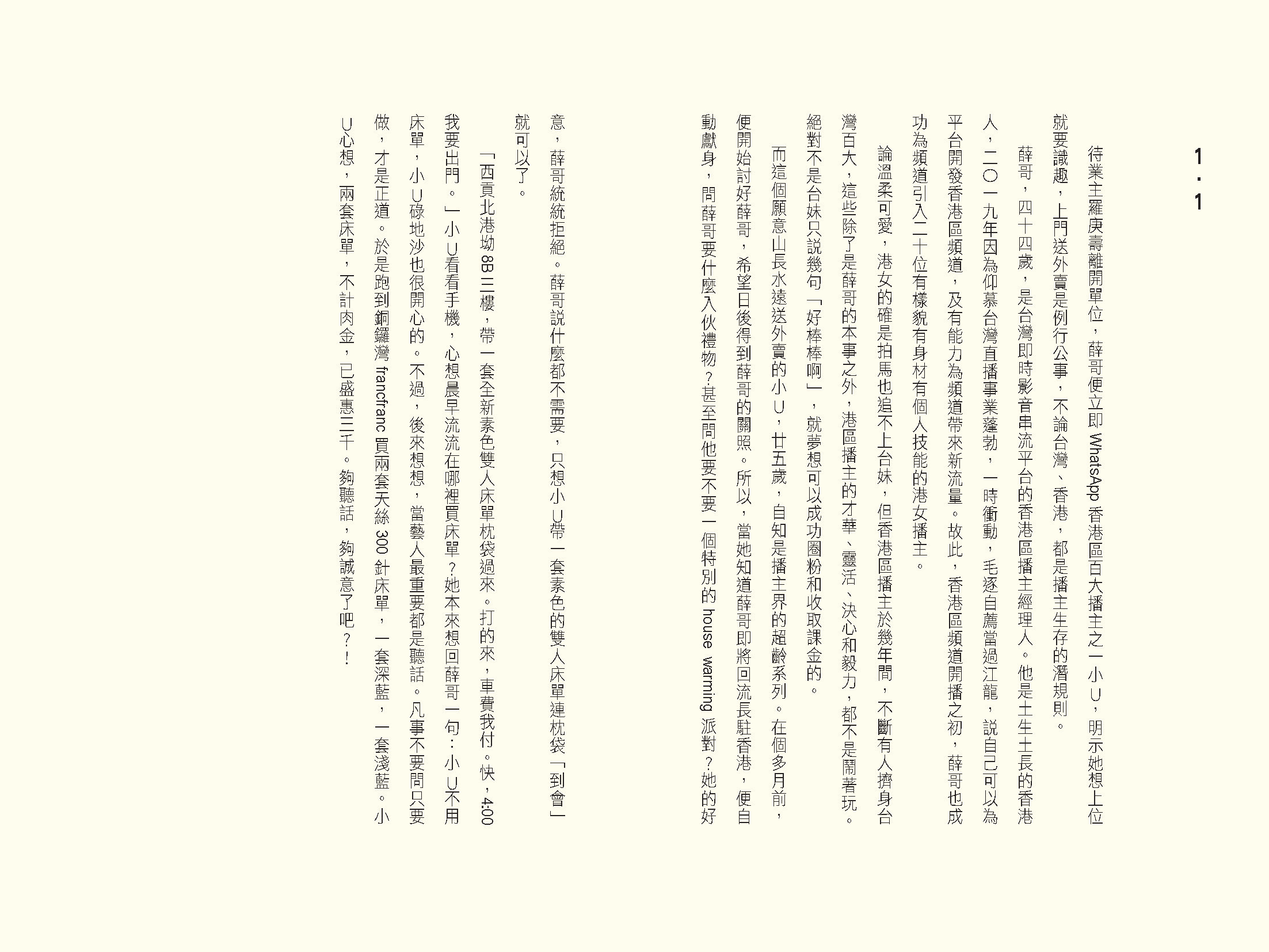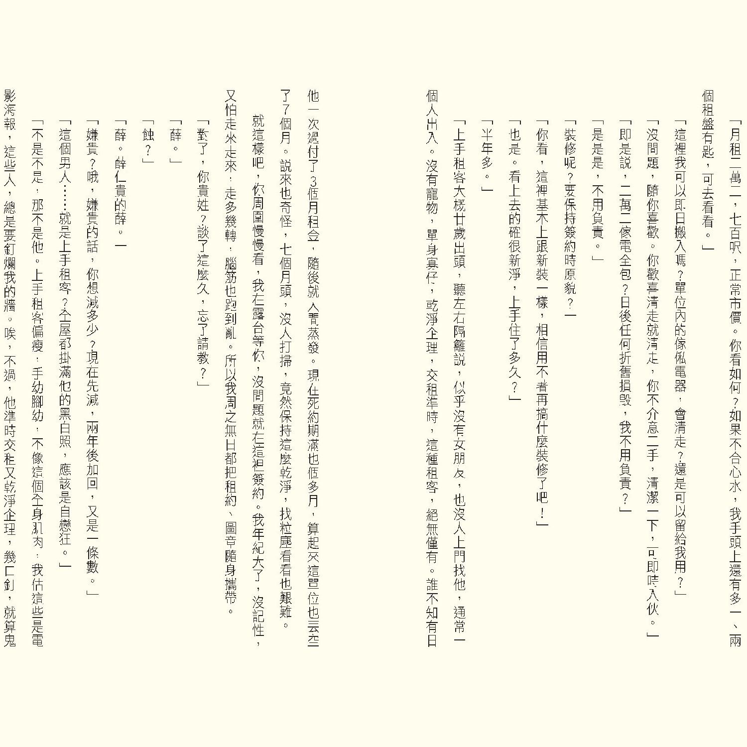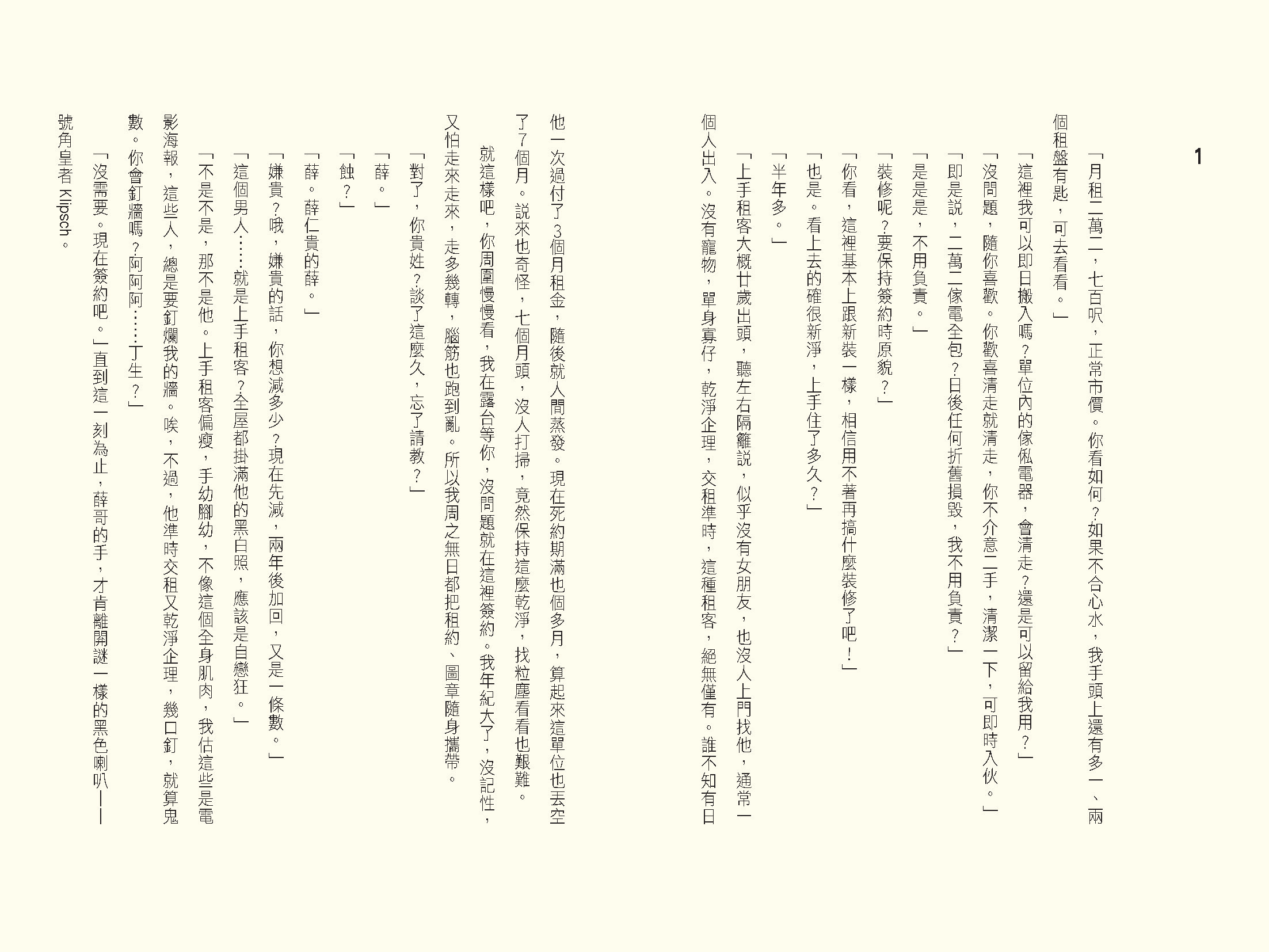 小說背景設置在香港這個繁忙的都市中,但在這座光鮮亮麗的城市背後,潛伏著深不可測的暗黑秘密與一段無法公開的情感糾纏。主角薛哥是台灣即時影音平台經理人,剛從台灣回流到香港後,為了重整自己的生活,他租下了一間位於西貢的公寓。故事從一場看似平靜的租房經歷開始,在薛哥搬入的公寓裡,前任租客的神秘消失,房東的言辭閃爍不定,而屋內不時出現的詭異現象,似乎在暗示著更大的陰謀在醞釀。