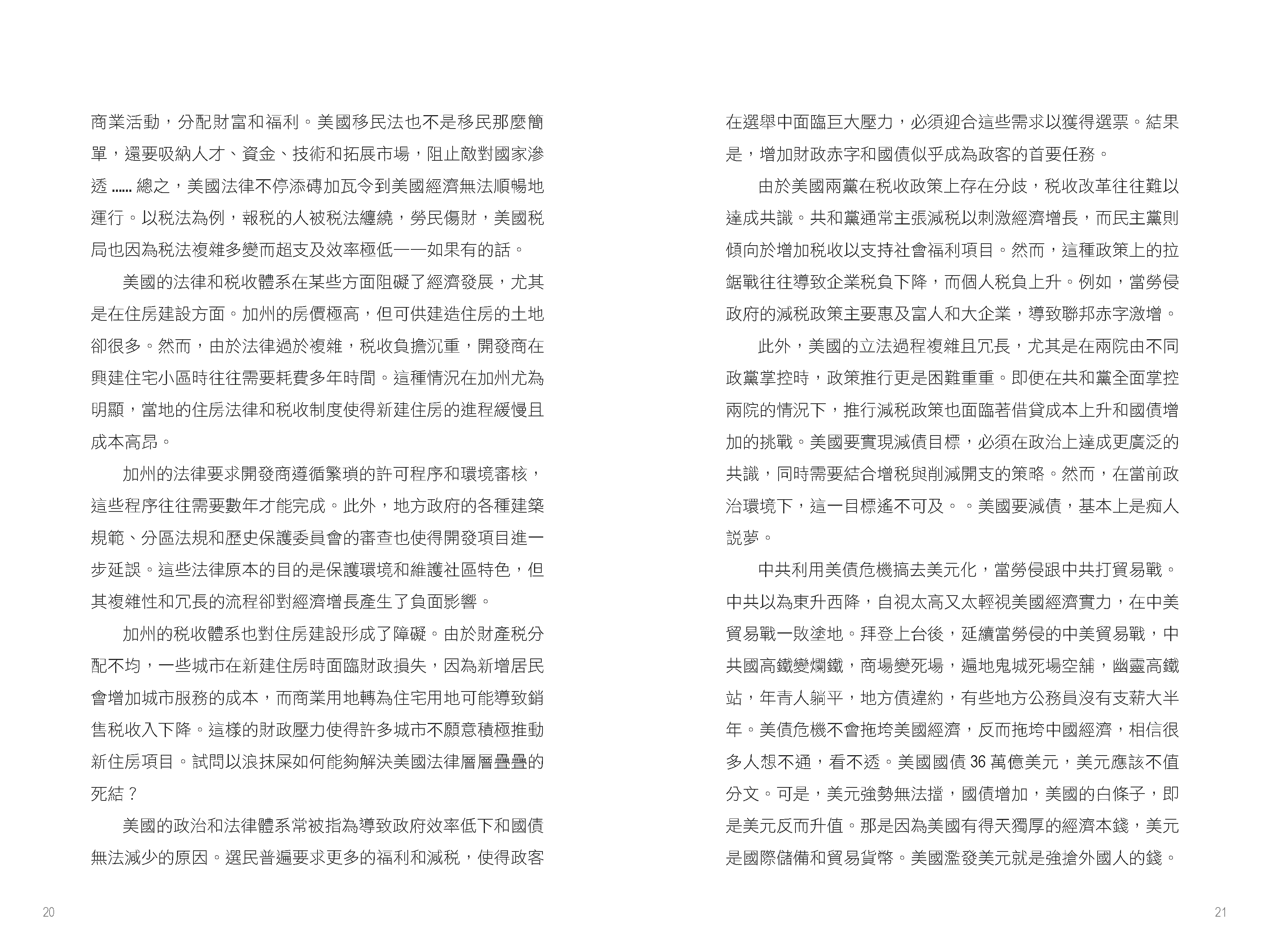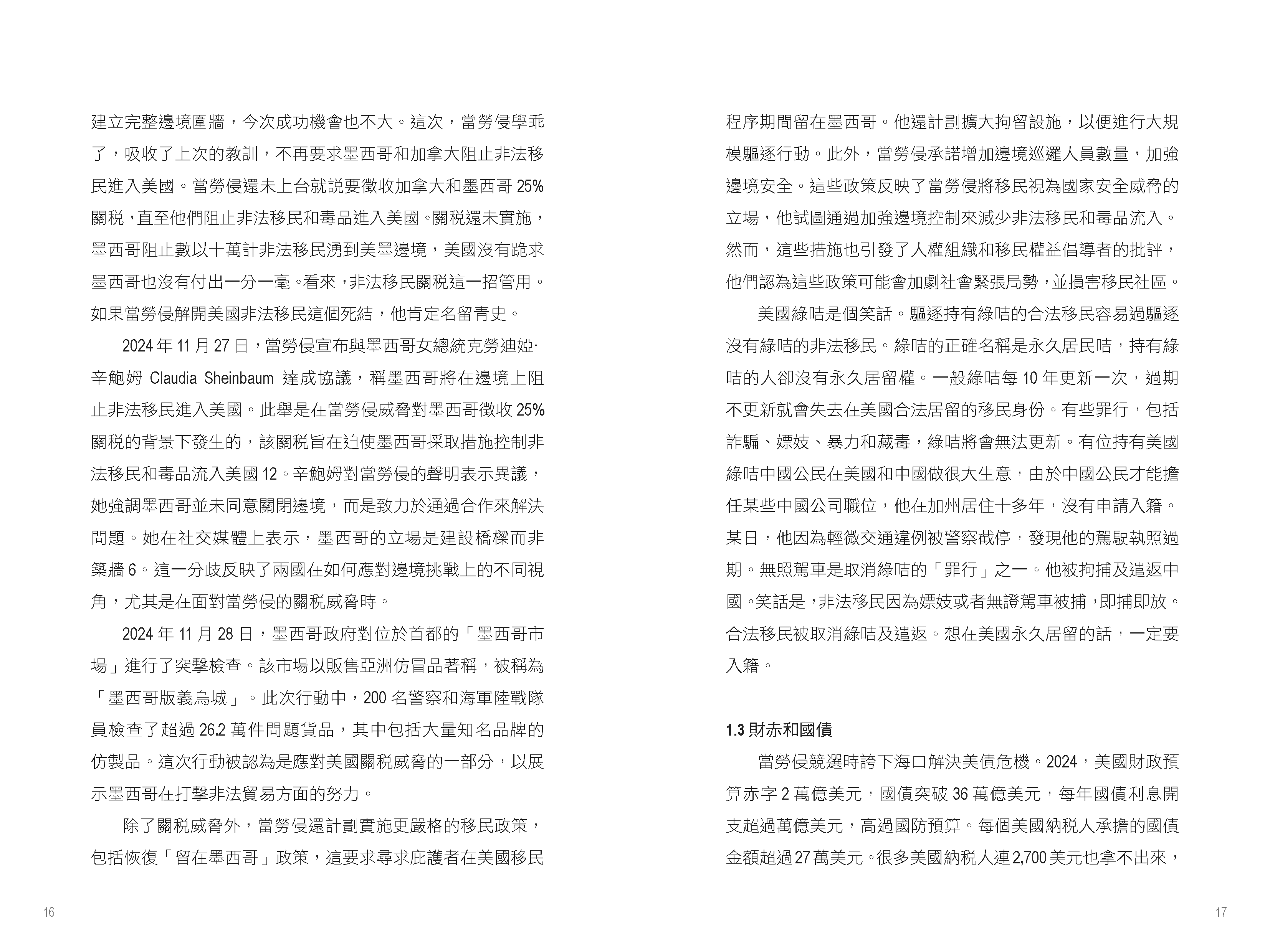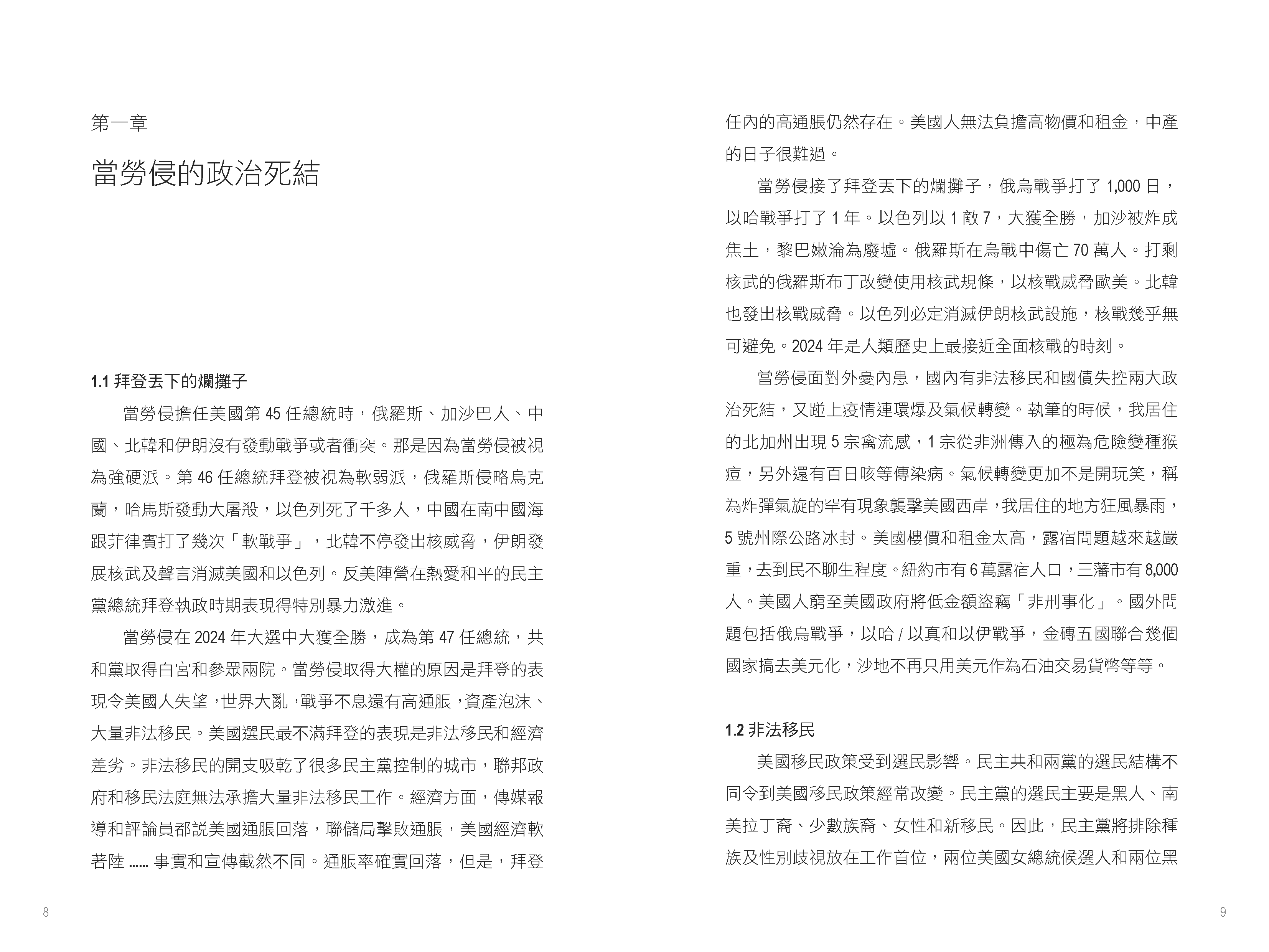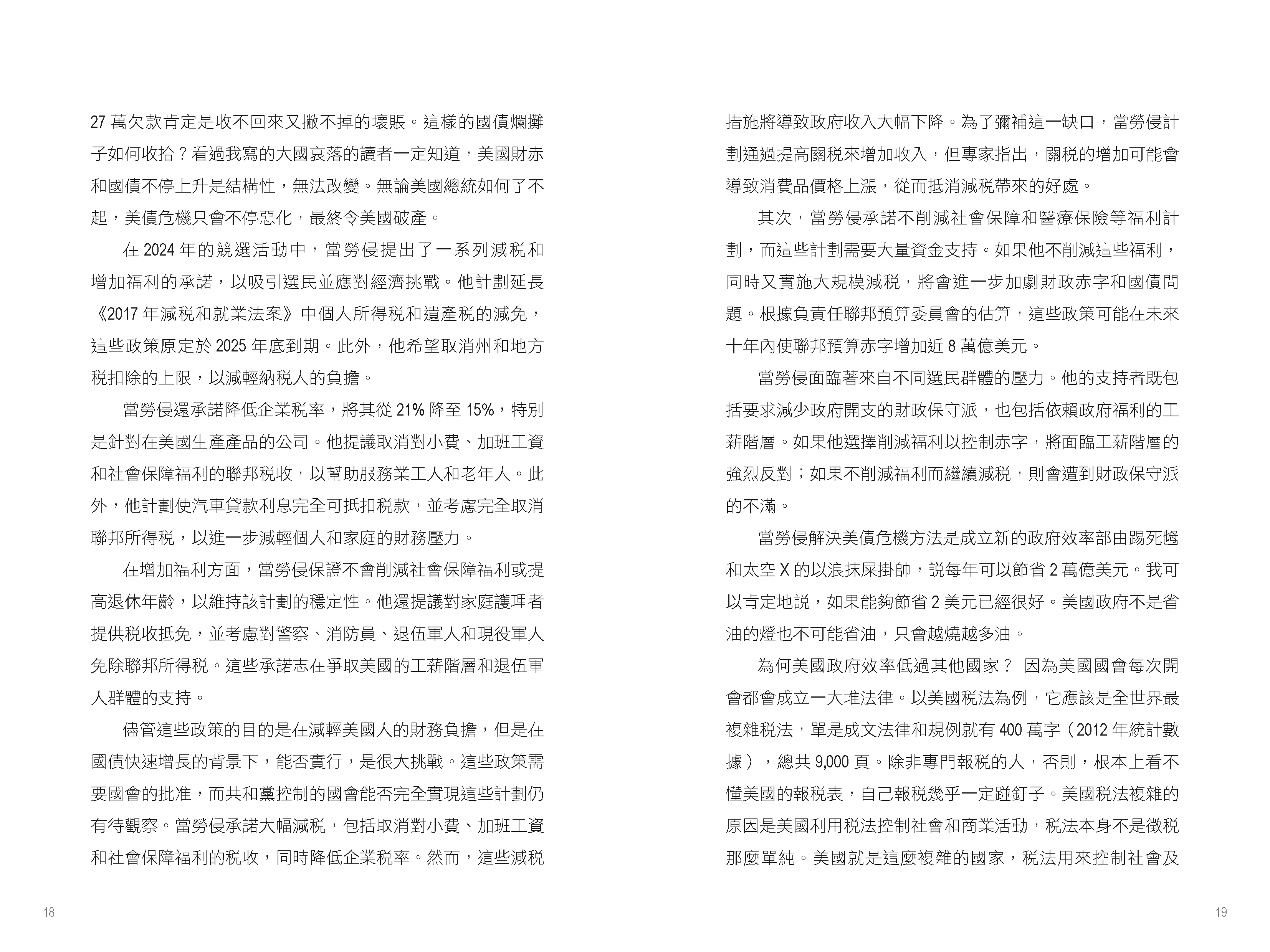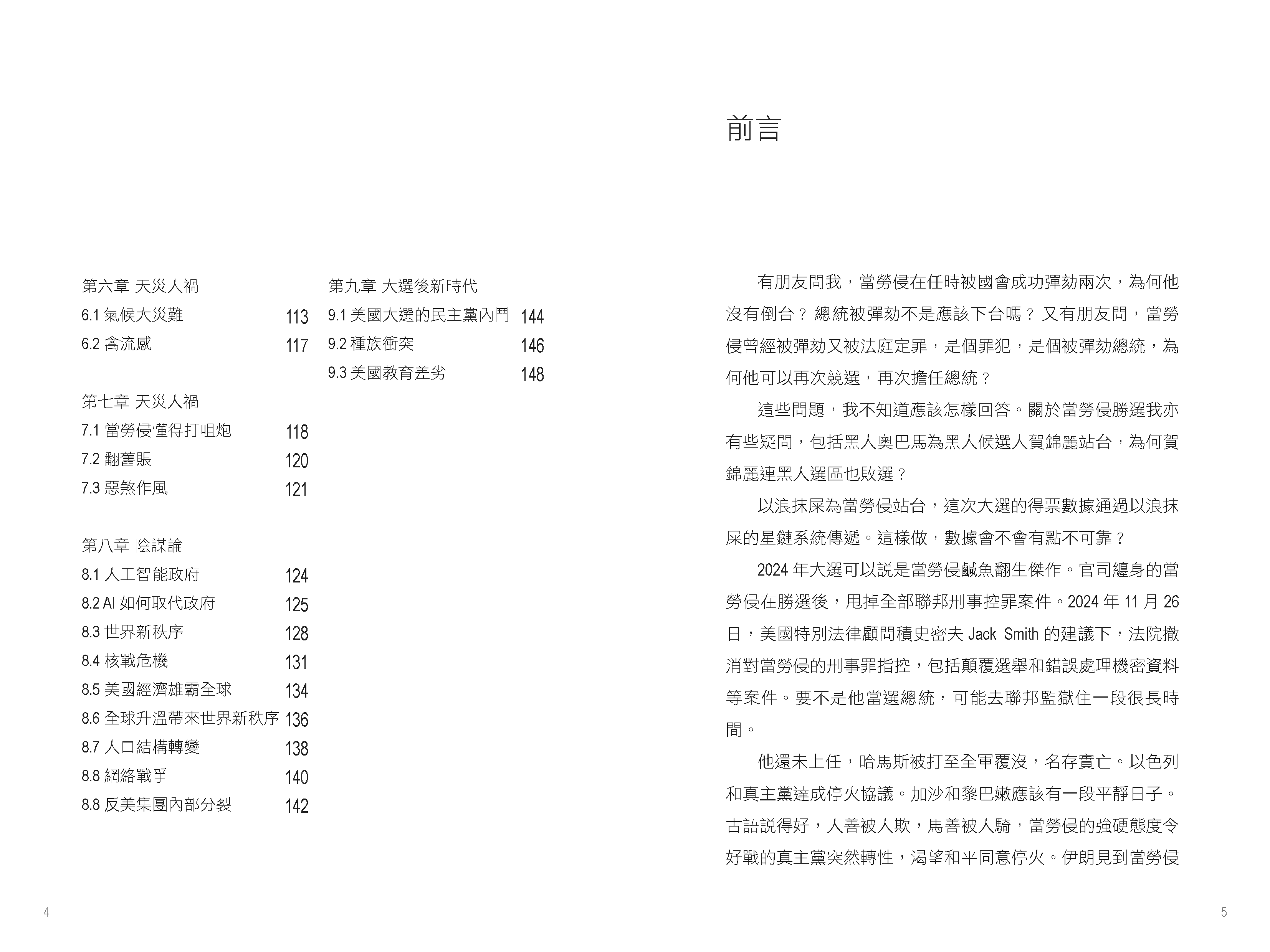 書中首先聚焦於特朗普的政治策略和經濟政策。他在2024年大選中勝出,共和黨全面掌控白宮和國會,這被視為對拜登政府政策不滿的反映。特朗普計劃對中國商品徵收高達60%的關稅,旨在削弱中國經濟影響力並促進美國本土生產。這一政策可能加劇中美貿易緊張,並導致全球供應鏈重組。作者指出,許多企業已開始將生產基地從中國轉移至越南、印度等地,以應對高額關稅帶來的風險。