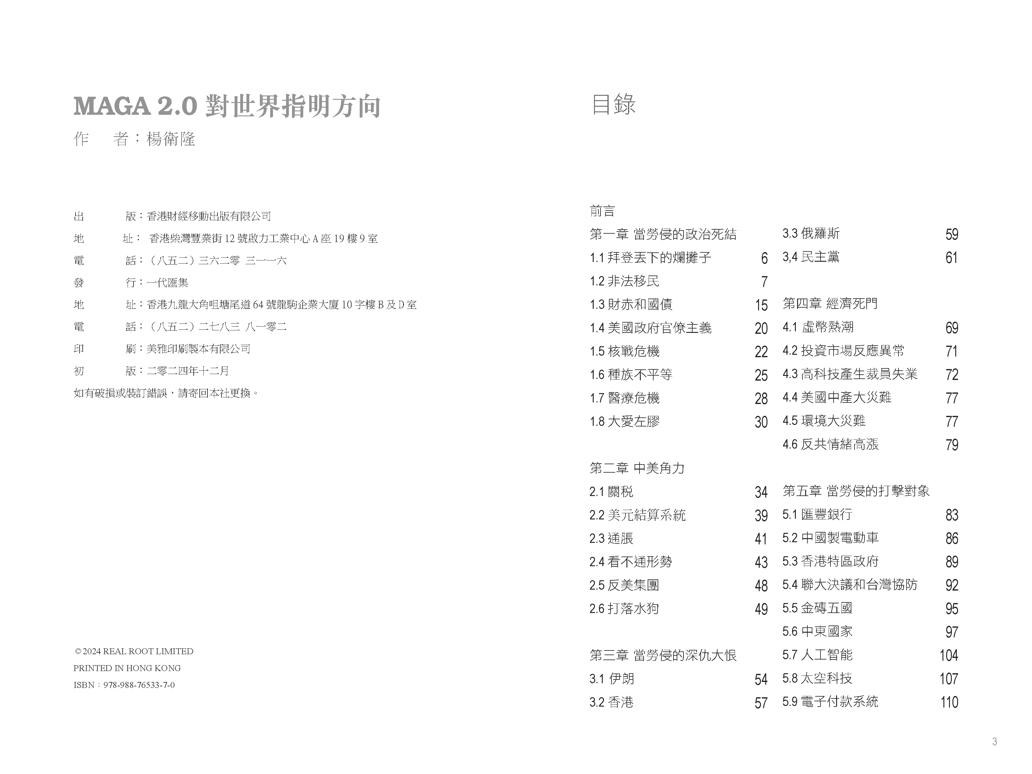 《MAGA 2.0對世界指明方向》是一部由楊衛隆撰寫的深入分析著作,探討特朗普再次當選美國總統後對國內外政治、經濟及社會的廣泛影響。作者以詳實的數據和深刻的觀察,描繪了特朗普「MAGA 2.0」政策可能帶來的全球變局,並揭示美國在新時代下的挑戰與機遇。