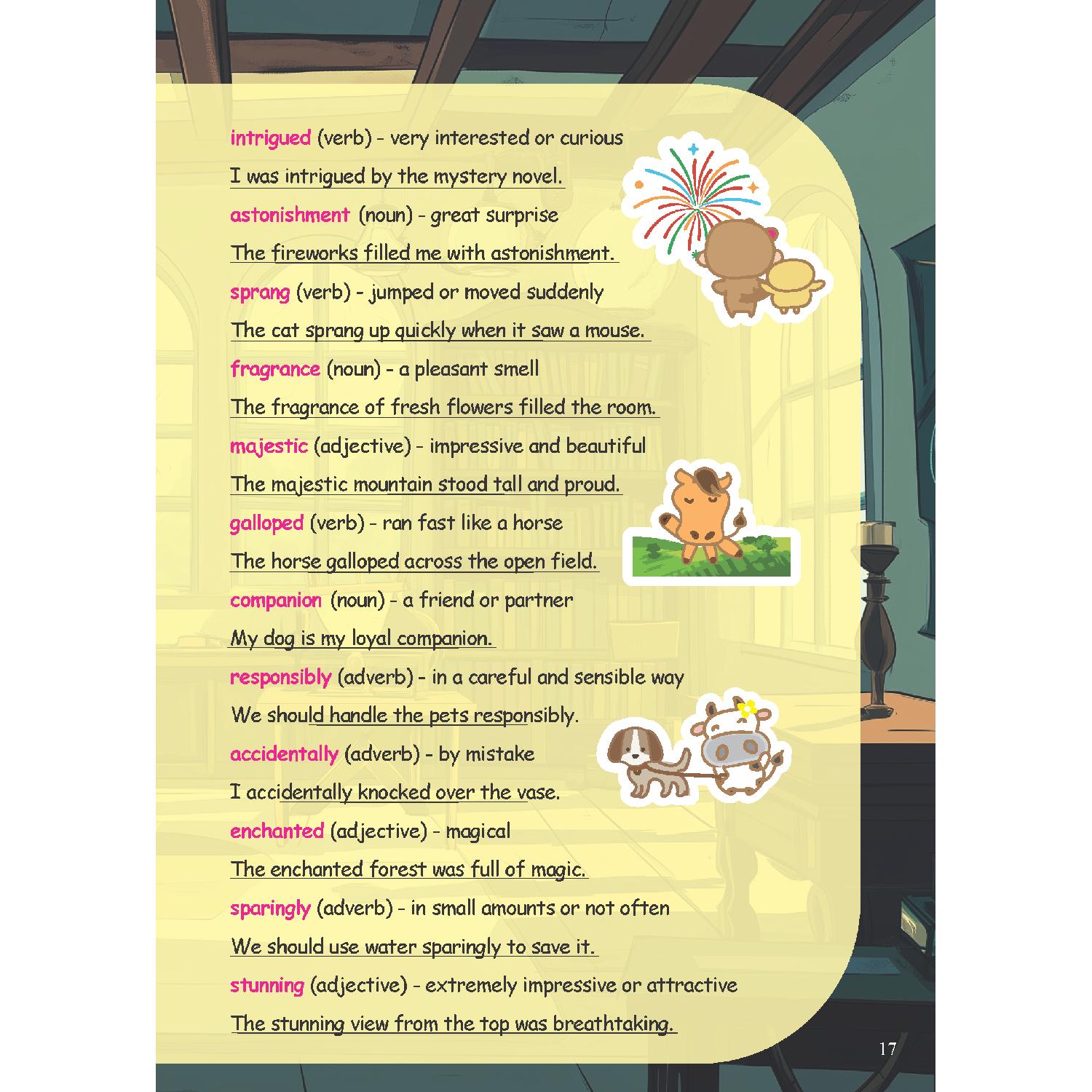 在引導學生思考各部分內容時,書中提供適用的「動詞」、「形容詞」及描述「環境」、「氣氛」等增強字庫的生字和例句,幫助學生豐富語言表達。