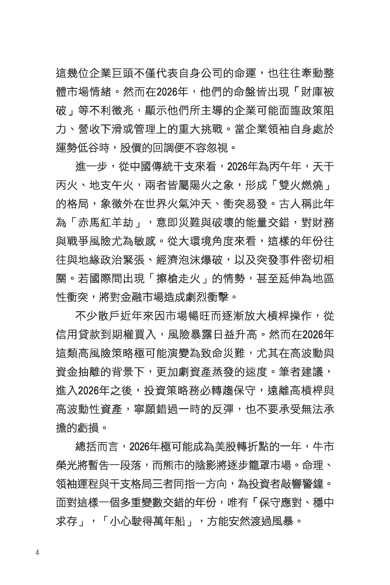 《美股通勝2026》是一部橫跨命理、金融與戰略佈局的金融實戰通勝。無論是資深投資者,抑或關注運勢的職場人士,都能從中找到「避凶趨吉、攻守有道」的智慧。2026,危中有機——先知者,才能先行。